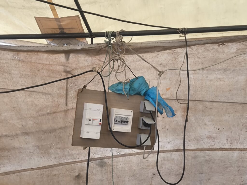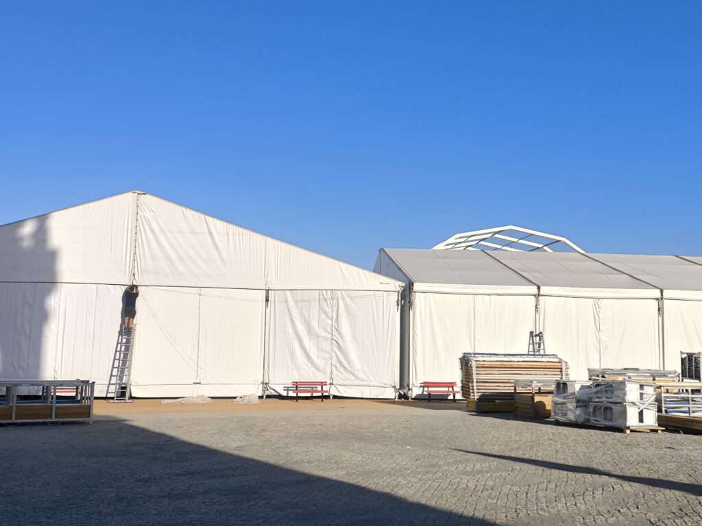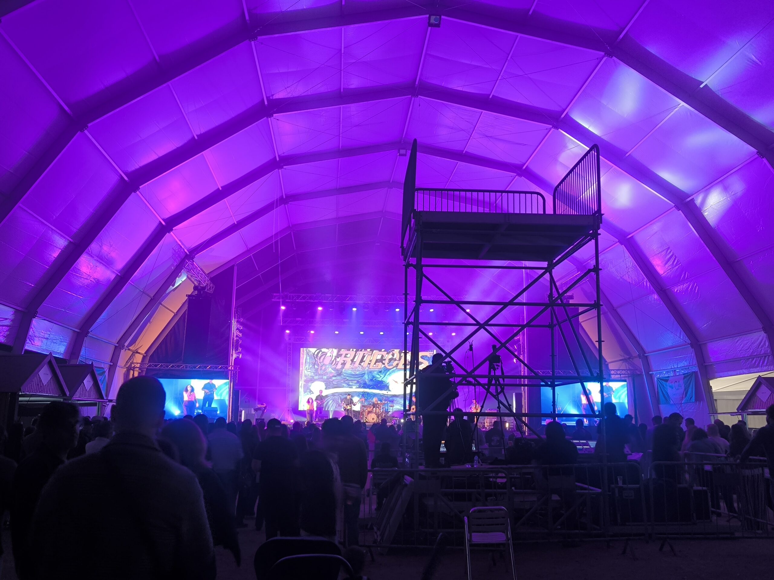 Und dazwischen, den freien Raum zwischen den beiden Zelten überspannend, ein großes Dach und eine große Bühne, auf der das kulturelle Hauptprogramm, sprich die Konzerte stattfindet.