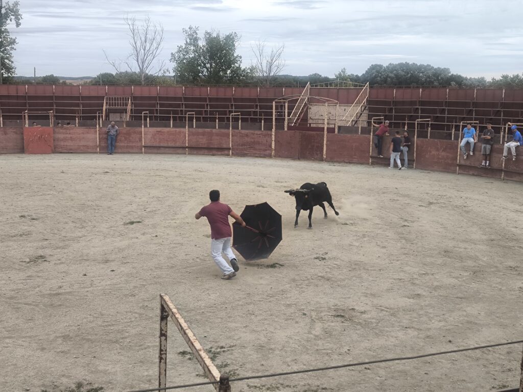 Ahí no hay aficionados en la plaza. Aunque son toros jóvenes, es decir, no tienen la fuerza ni la resistencia de un toro adulto de cuatro o cinco años, su arma principal, sus cuernos, no están cubiertos por una especie de cuero almohadillado, como aquí es el caso. Esto no significa que no se ariesgado enfrentarse a un animal así en la plaza. Un choque o una coz desafortunada sigue siendo suficiente… pero, por supuesto, se elimina el gran peligro de una cornada. Esto también se aplica a las corridas de toros, por cierto. En España, eso estaría inimaginable. Lo primero que revisa el público conocedor en un toro en España al entrar en la plaza, independientemente de si es joven o viejo, es el estado de sus cuernos. Y a la más mínima sospecha de que han sido manipulados, comienzan los gritos de „afeitado“. Así que tiene sentido que en España haya gente en la plaza de toros que tenga al menos una idea aproximada de cómo controlar al animal con el capote o la muleta, y cómo exponerse y al mismo tiempo protegerse. Nada de eso ocurre en una garraiada. Y así, aquí en Viana, ví por primera vez torear con un paraguas.