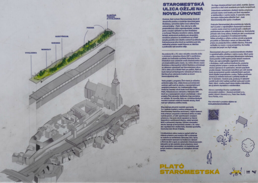 Es gibt übrigens einen ambitionierten Plan für die Zukunft. Die breite Zufahrtsstraße, die auf die SNP-Brücke (von den Bratislaver:innen auch UFO-Brücke genannt) führt und durch die die Reste der ehemaligen Stadtmauer auf der einen und der Aufgang zur Burg mit den Resten des ehemaligen Jüdischen Viertels auf der anderen Seite getrennt werden, soll überbrückt werden. Für diesen Teil der Stadt wäre das sicherlich eine enorme Verbesserung. Ob allerdings alle notwendigen „Zutaten“ für ein solch ambitioniertes Projekt zusammenkommen werden, wird die Zukunft zeigen.