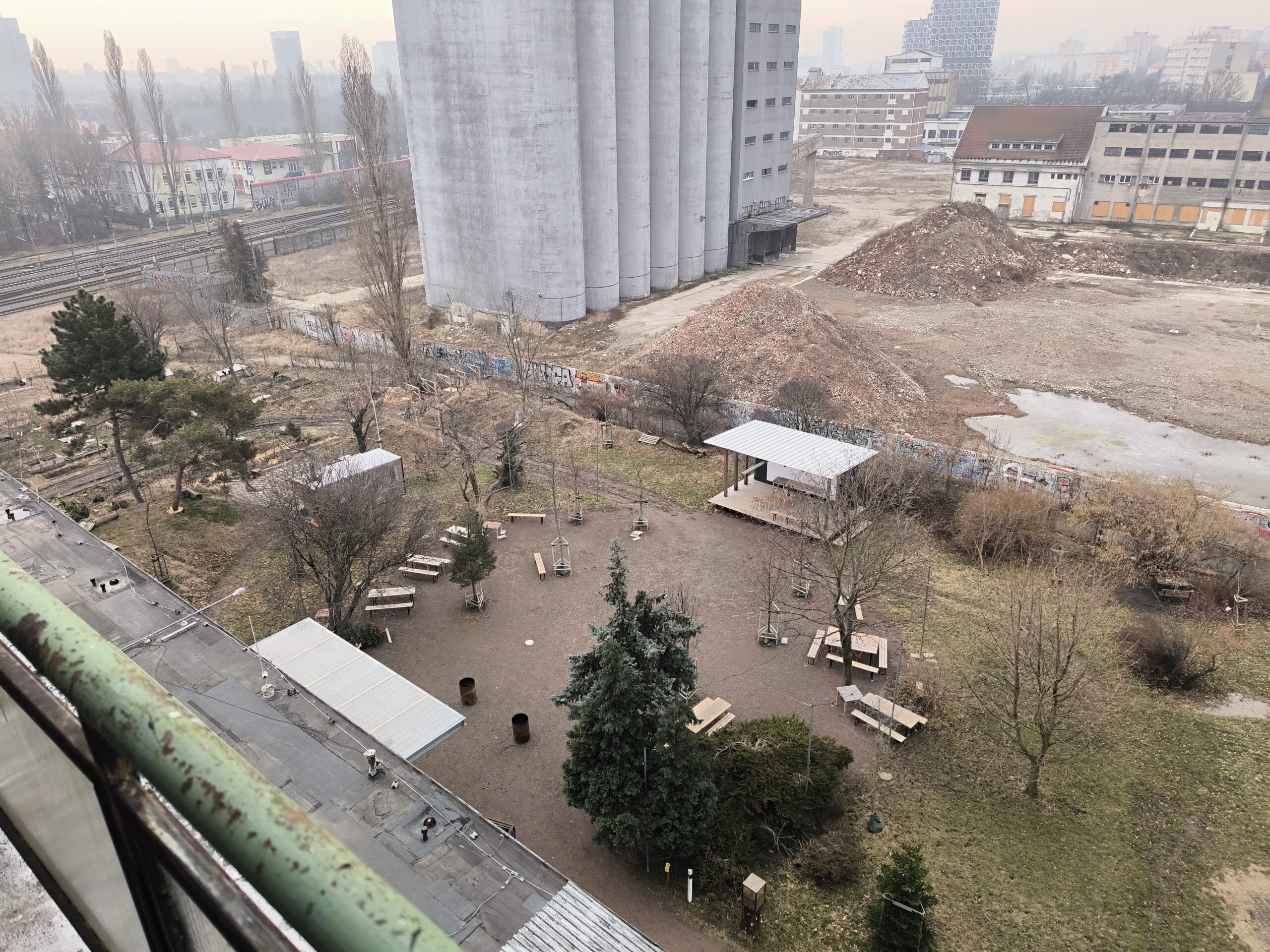Blick von der Terrasse des Kulturzentrums auf den Gemeinschaftsgarten. Dahinter das Gelände eines ehemaligen Getreidesilos, für das ein Großbauprojekt eine neue Nutzung vorsieht.