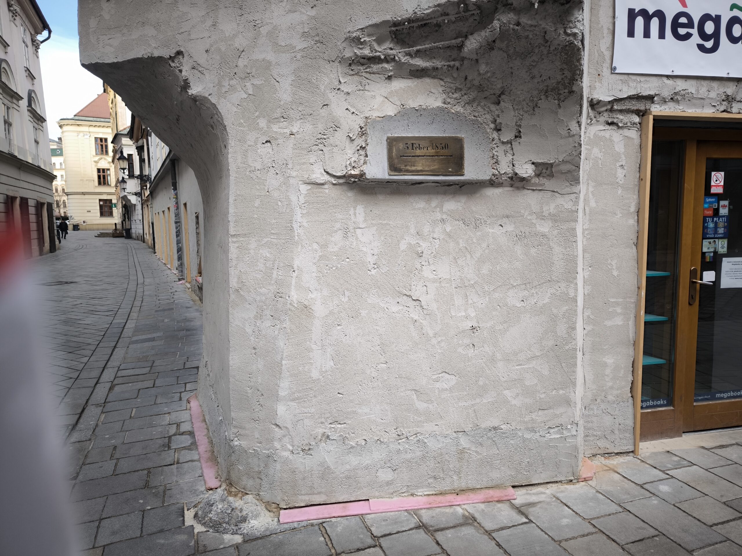 Hochwassermarke im historischen Stadtzentrum an der Ecke Laurinská / Uršulínská. Am 5. Februar 1850 kam es aufgrund eines Eisstoßes zu einem Hochwasser, das weite teile der Stadt unter Wasser setzte.