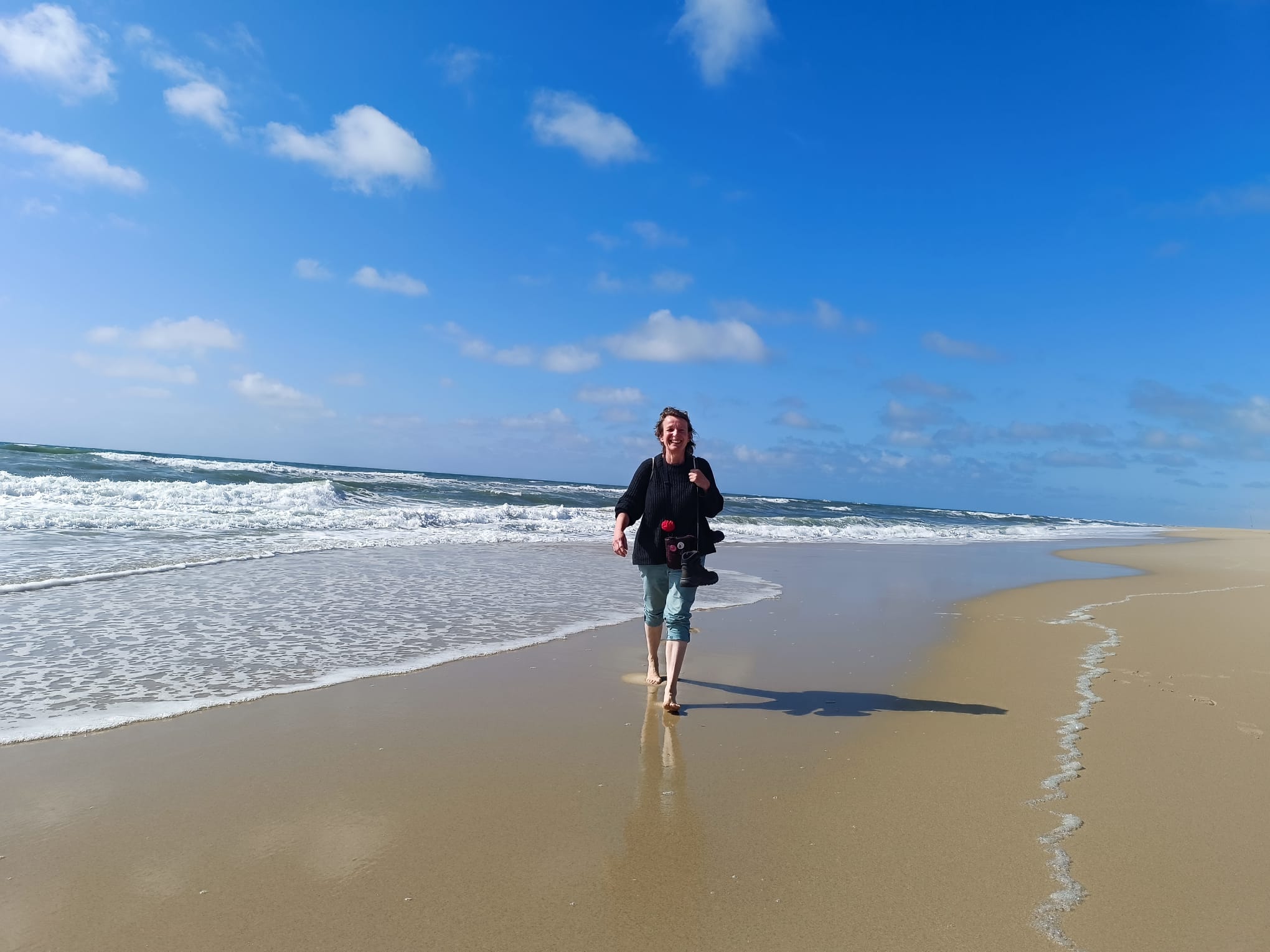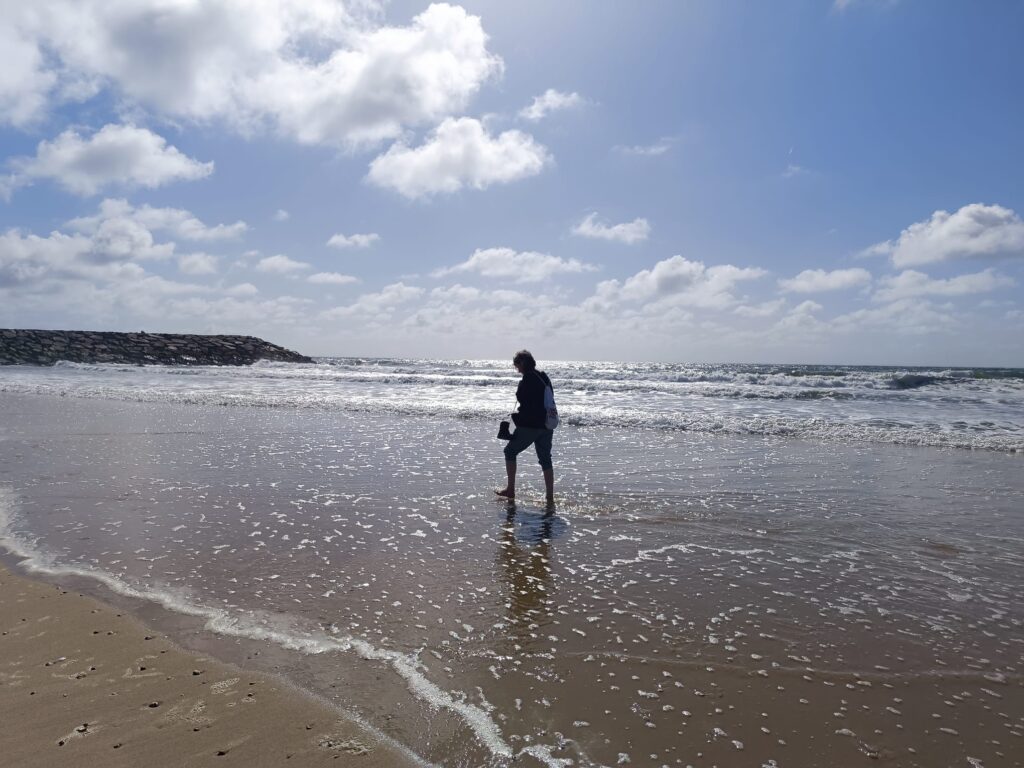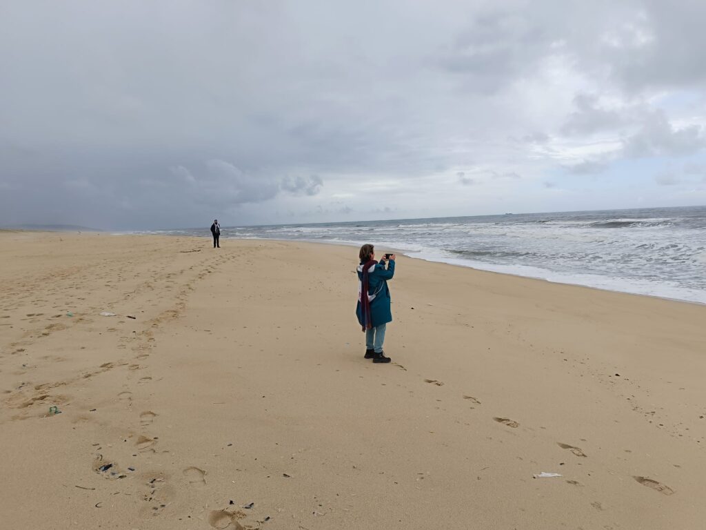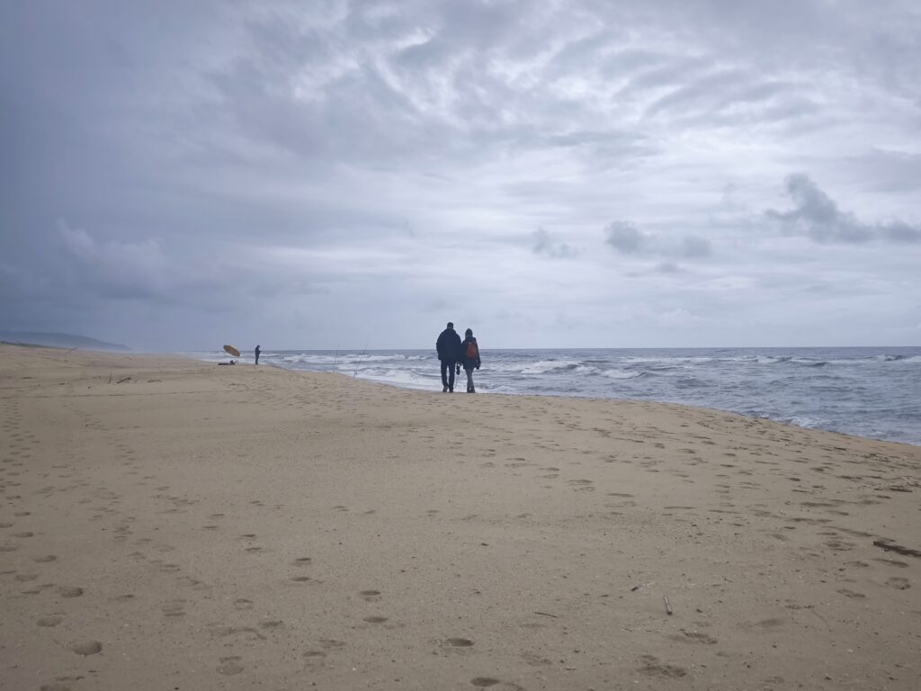 (es) Wir genossen die Unendlichkeit des Himmels, den Strand, von dem Alberto sagt, er sei weniger ein Strand als vielmehr ein „sandiger Zustand der Küste“, was mir sehr gefällt und uns, Victor und mir, bei unserem Ausflug, den wir ein paar Tage später machen würden, Gesprćhsstoff lieferte. Und die Wildheit des Meeres. Es ist kein bequemer Strand, wie viele Strände am Atlantik. Das Meer ist rau, man sollte sich auskennen, oder man sollte sich nie zu sicher sein. Eine Herausforderung.