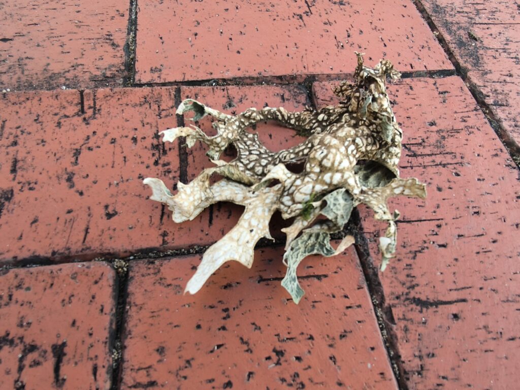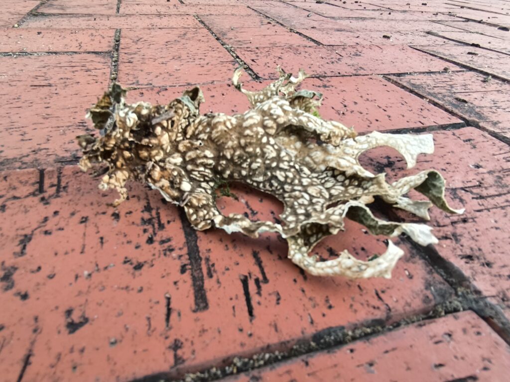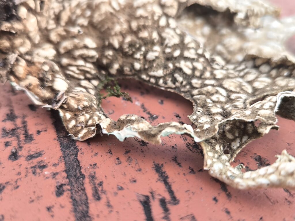 (de) Ich habe ein Fundstück mitgebracht: aus der Entfernung dachte ich im ersten Moment, es wäre eine Kröte, die die Hitze nicht ausgehalten hat, oder die Haut eines Reptils. Erst beim Näherkommen hab ich gemerkt, dass es eine Flechte ist. So schön.