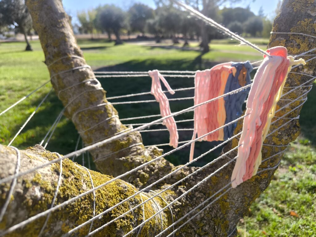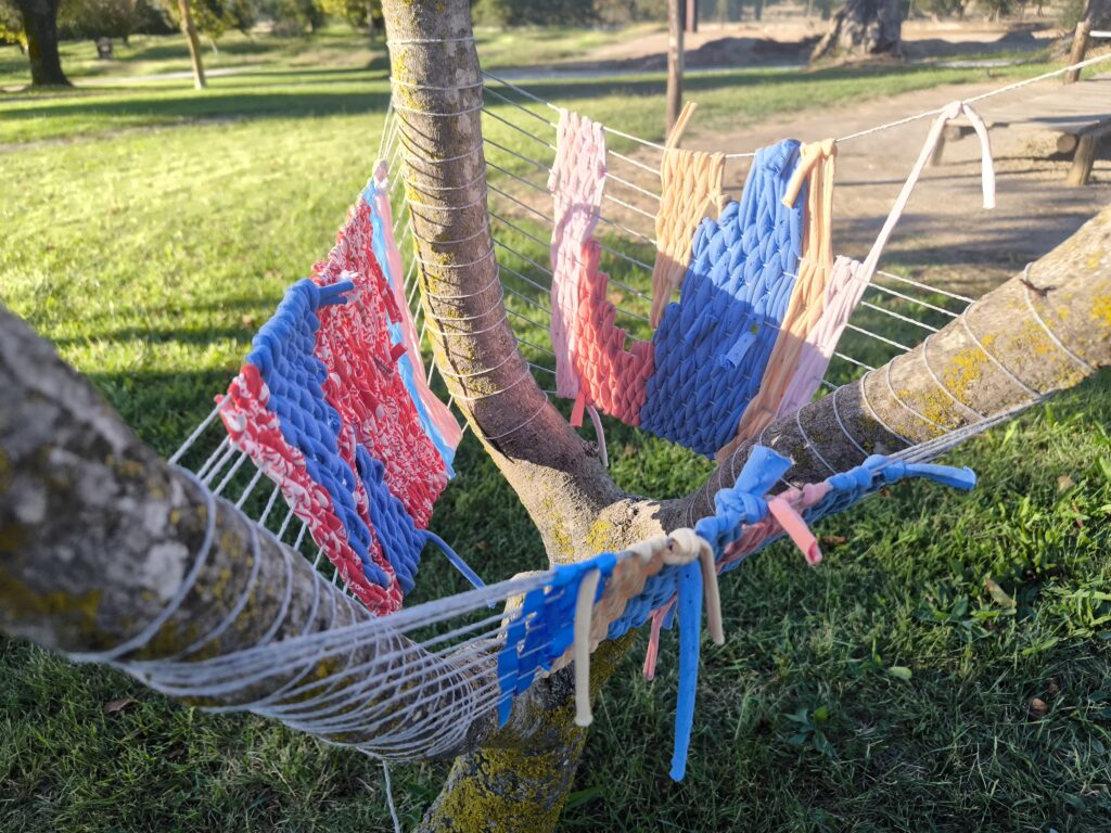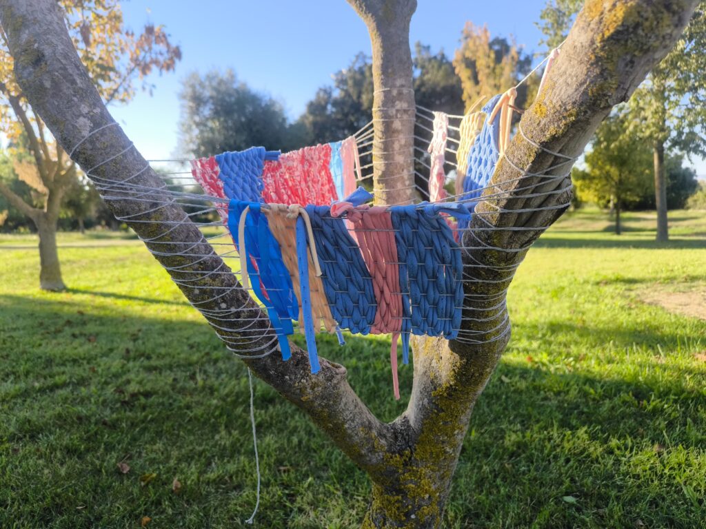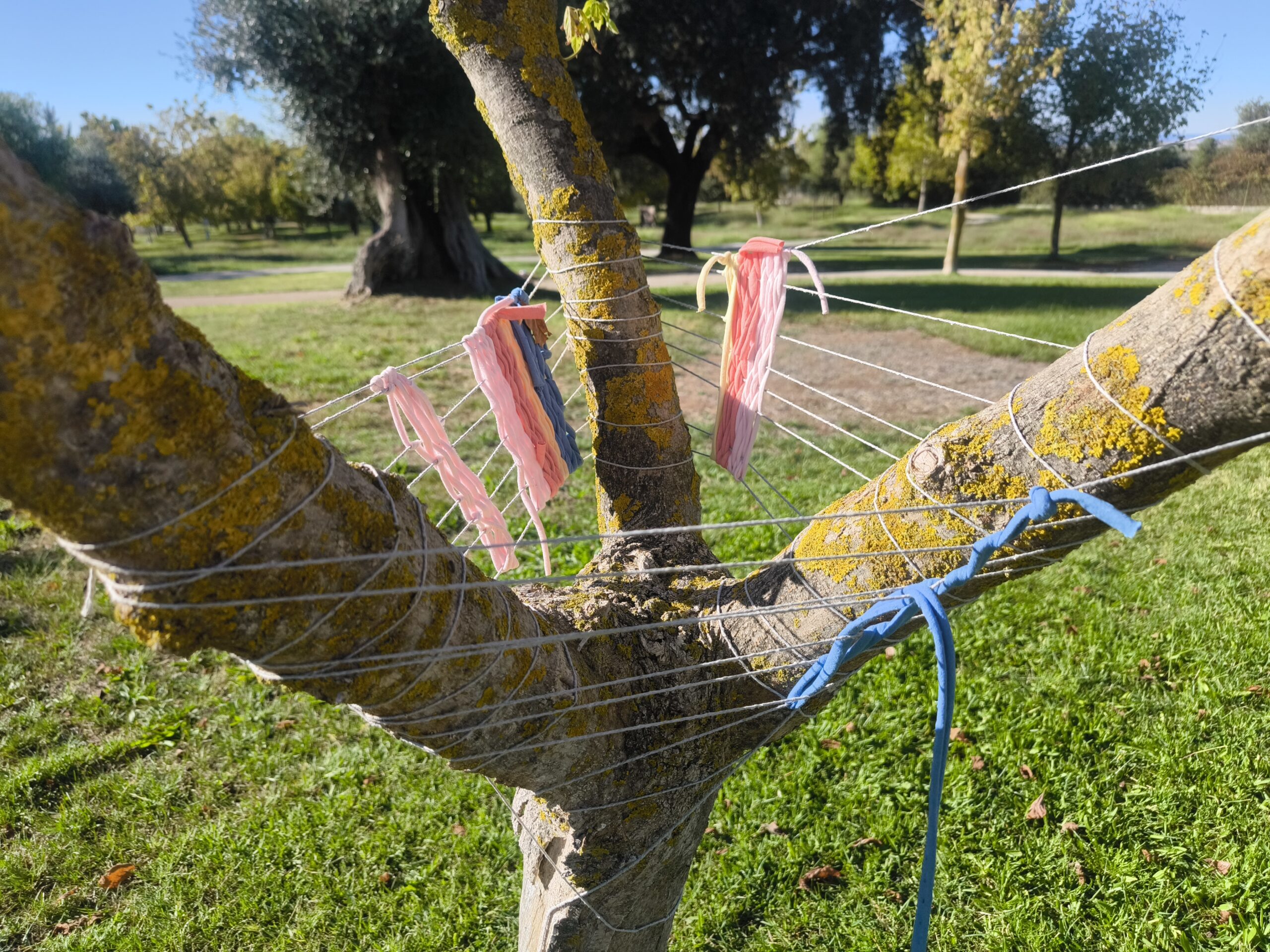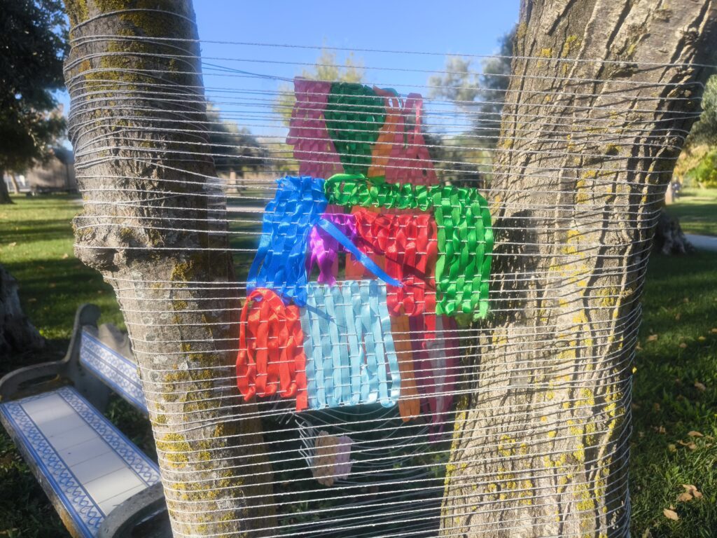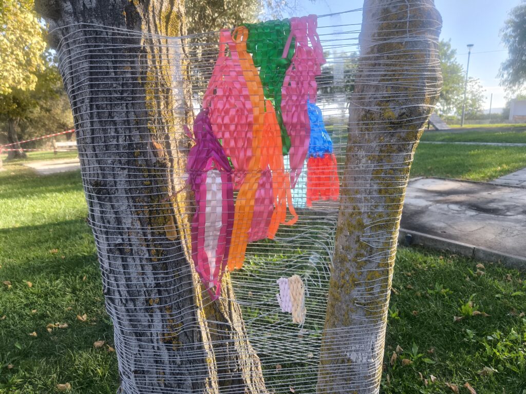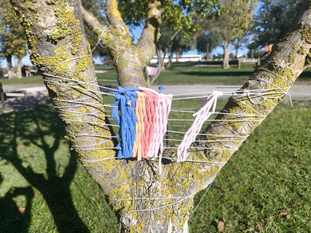 (es) Como lo prometido es deuda, retiré los tejidos de los árboles después de empezarlos con los escolares y terminarlos con los visitantes del parque. Quizás podrían haber durado unas semanas más, incluso un invierno. Pero personalmente no me gusta que este tipo de intervenciones en espacios públicos no estén supervisadas, y solo puedo garantizar esta supervisión mientras el KUKUmobil esté en Viana. Por lo tanto, me pareció sensato fijar una fecha específica para la retirada.