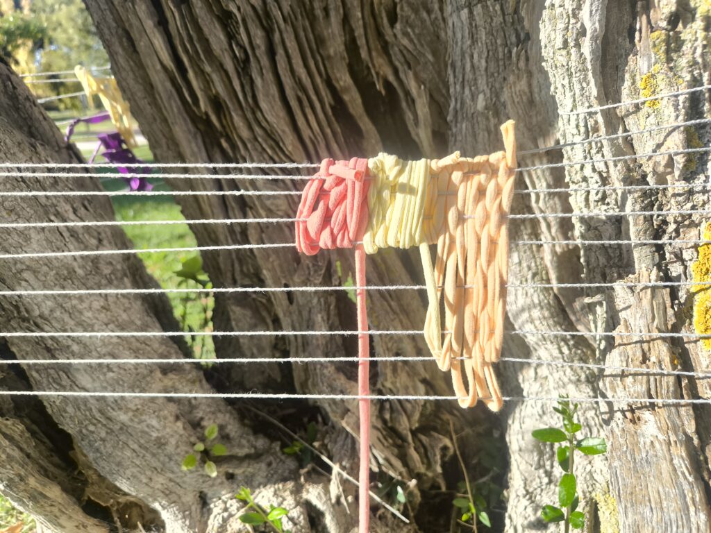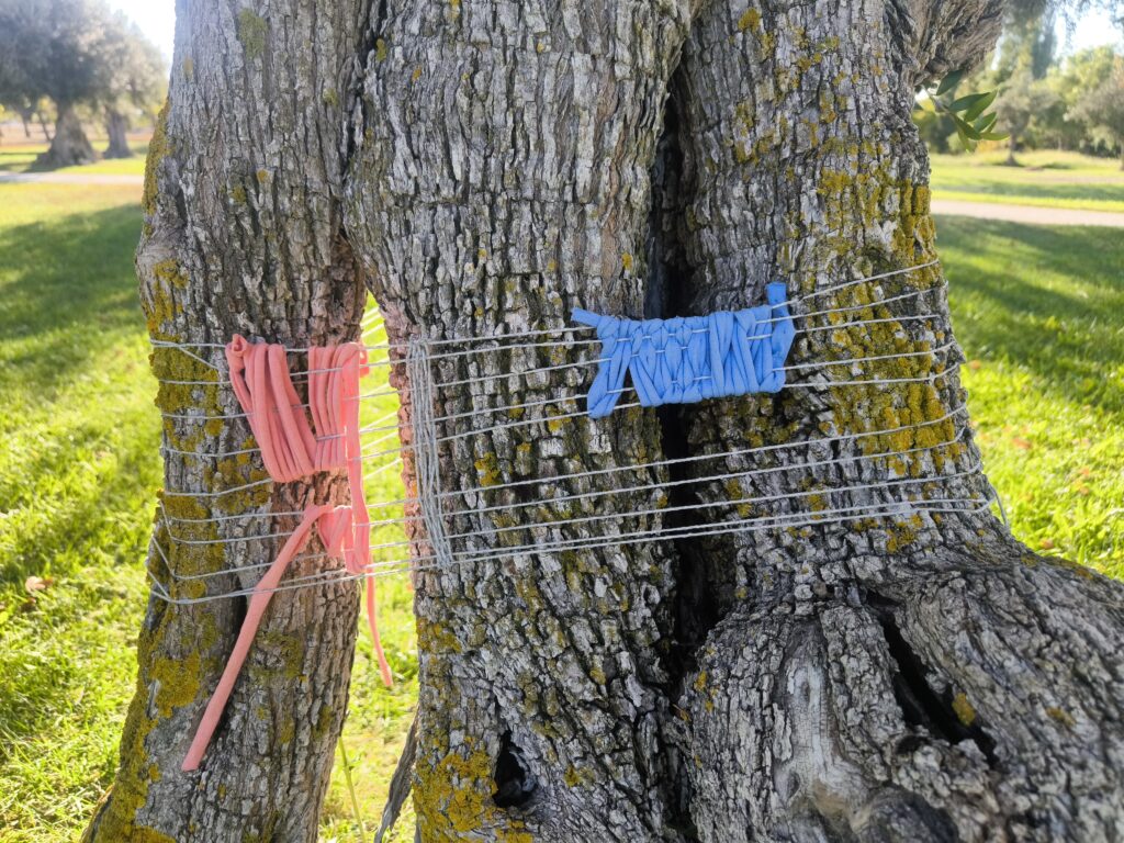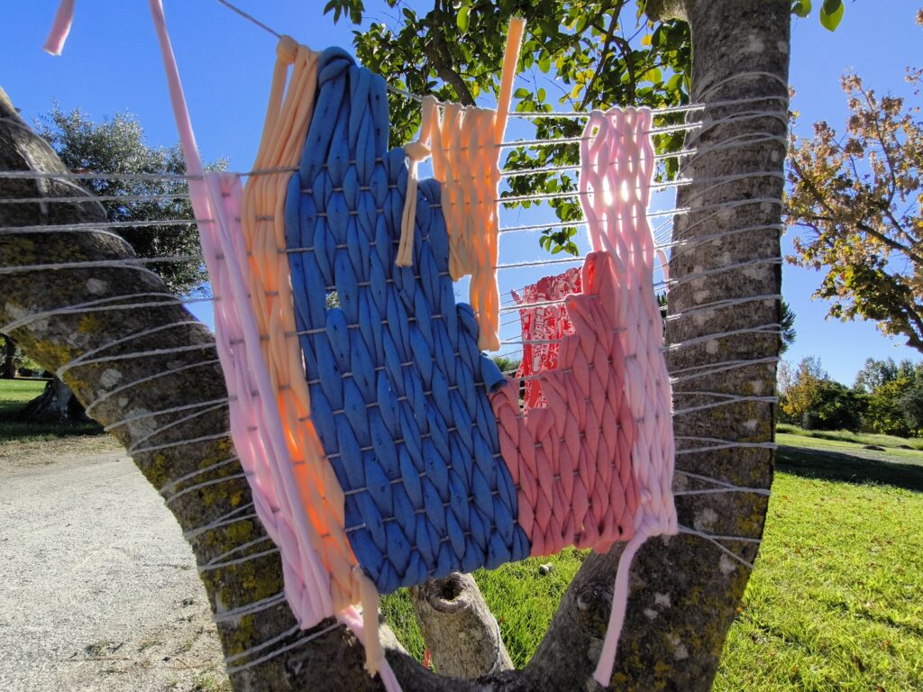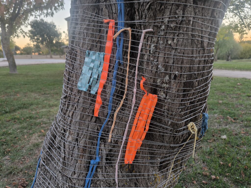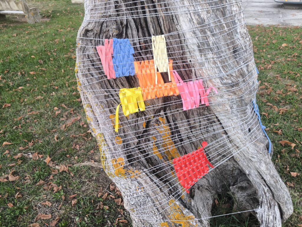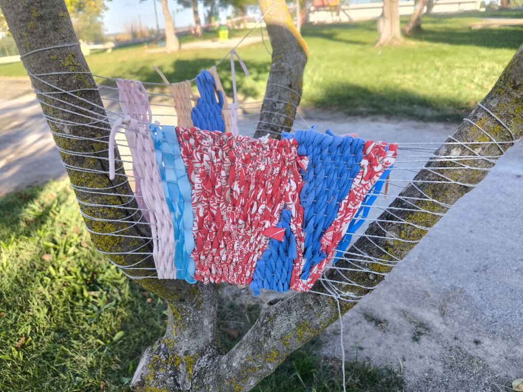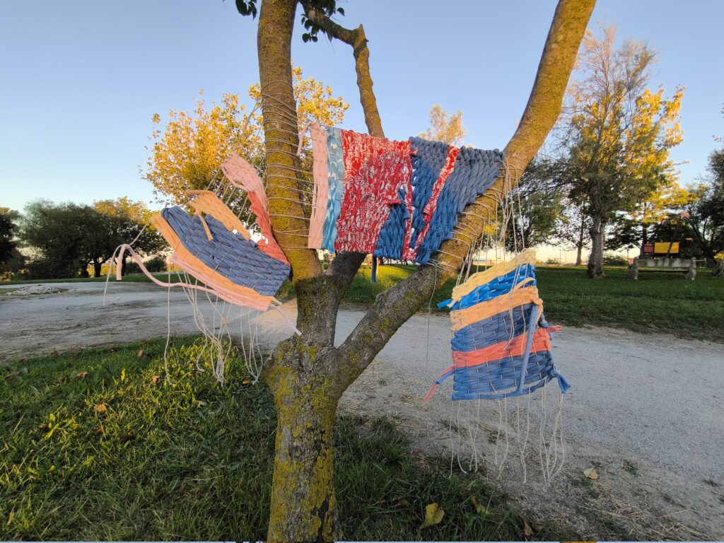 (es) Como lo prometido es deuda, retiré los tejidos de los árboles después de empezarlos con los escolares y terminarlos con los visitantes del parque. Quizás podrían haber durado unas semanas más, incluso un invierno. Pero personalmente no me gusta que este tipo de intervenciones en espacios públicos no estén supervisadas, y solo puedo garantizar esta supervisión mientras el KUKUmobil esté en Viana. Por lo tanto, me pareció sensato fijar una fecha específica para la retirada.