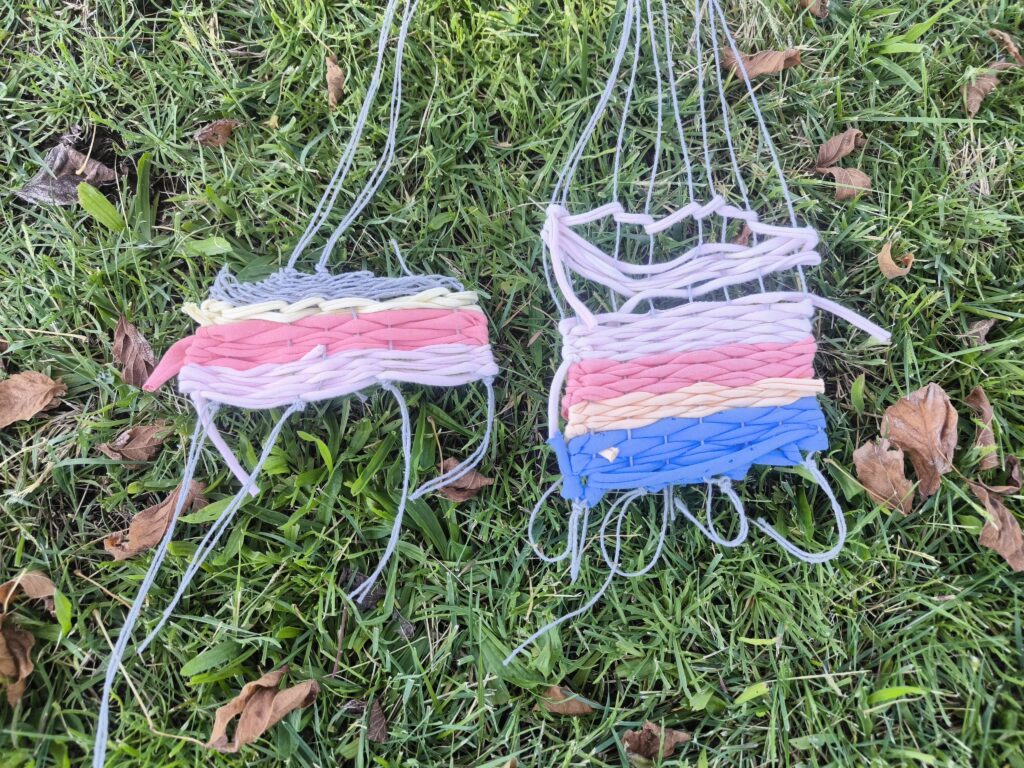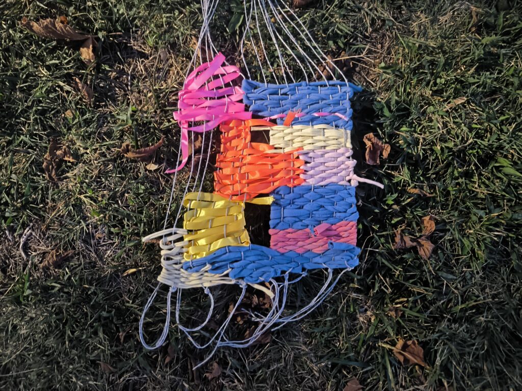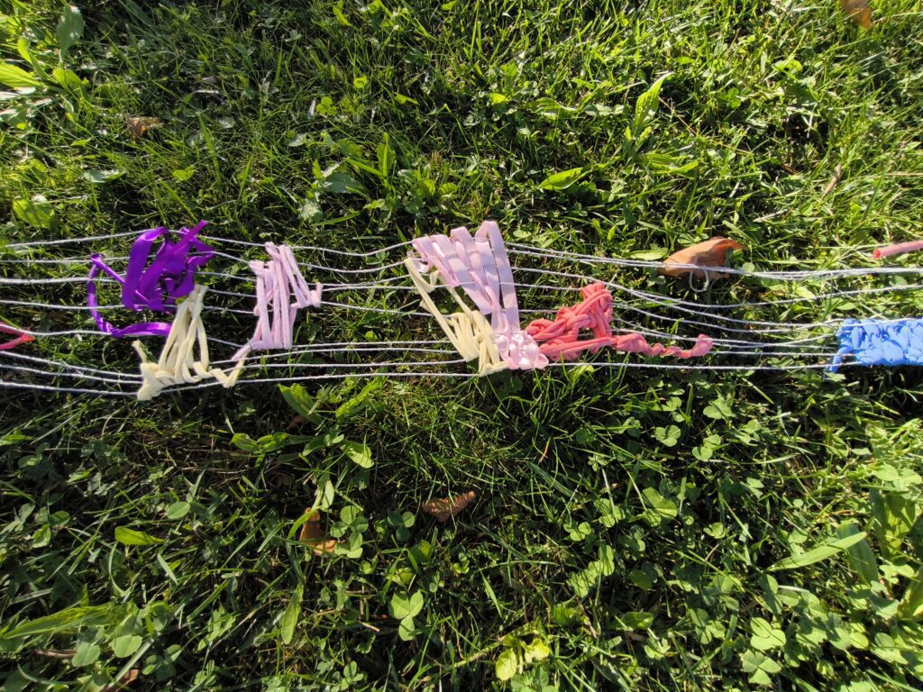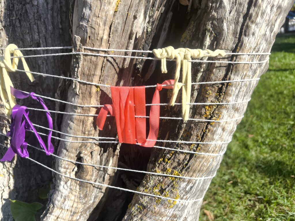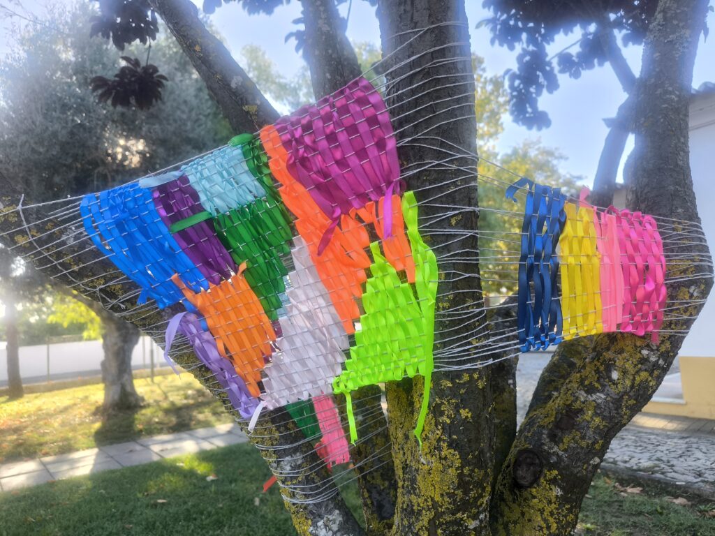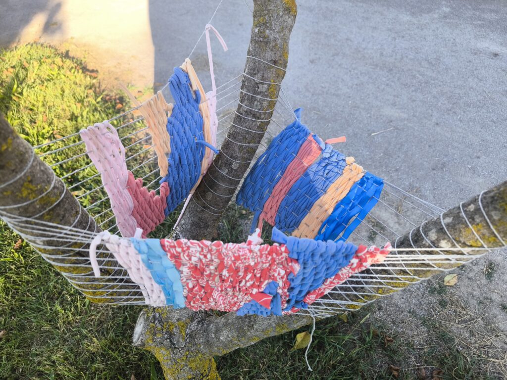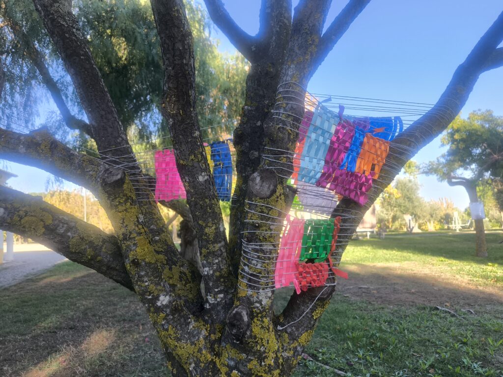 (es) Como lo prometido es deuda, retiré los tejidos de los árboles después de empezarlos con los escolares y terminarlos con los visitantes del parque. Quizás podrían haber durado unas semanas más, incluso un invierno. Pero personalmente no me gusta que este tipo de intervenciones en espacios públicos no estén supervisadas, y solo puedo garantizar esta supervisión mientras el KUKUmobil esté en Viana. Por lo tanto, me pareció sensato fijar una fecha específica para la retirada.