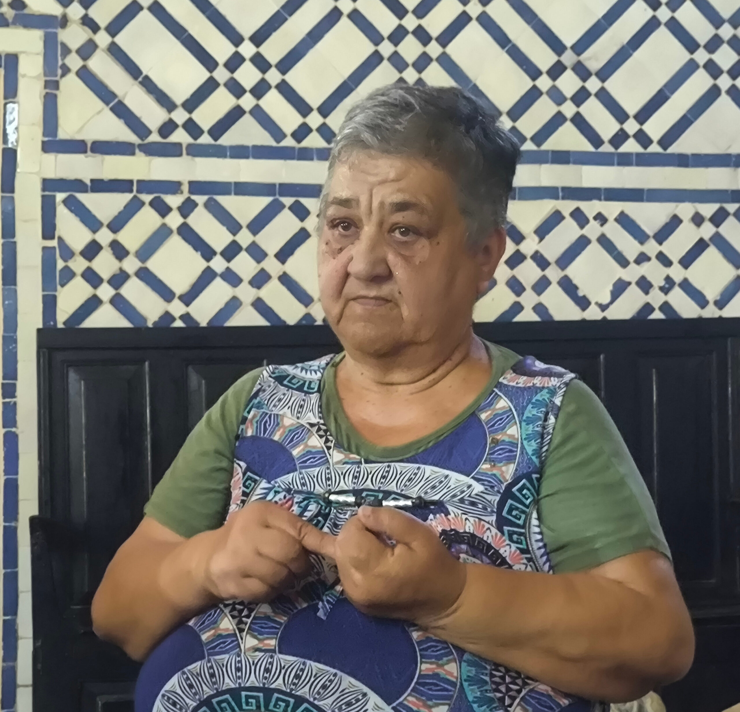 (es) Como ya he dicho, no entendí ni mucho menos todo lo que dijo, pero mientras los demás la escuchaban atentamente, yo me quedé prendada de su aspecto visual y me entusiasmó la forma en que el estampado de su delantal „dialogó“ con el de los azulejos.