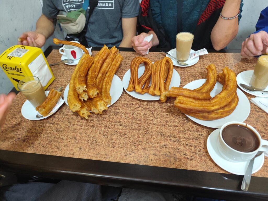 (es)  Como nos alojábamos en dos casas distintas de amigas (una en Fuenlabrada y la otra en Usera), el desayuno era siempre el momento en el que comenzaba nuestro día juntos. Todos los miembros de la familia Sánchez-Milde tenían en su lista de cosas que hacer en Madrid «comer porras y churros». Quizás con diferentes prioridades, pero relativamente arriba en la lista. Noel se sumó con confianza y creo que también le gustó.