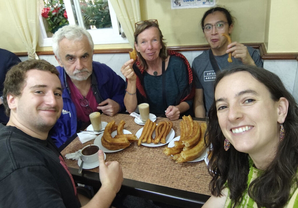 (de) Da wir bei zwei Freundinnen (eine in Fuenlabrada, die andere in Usera) Unterschlupf gefunden hatten, war das Frühstück immer der Moment, an dem unser gemeinsamer Tag begann. Alle Mitglieder der Familie Sánchez-Milde hatten auf ihrer To-Do-Liste für Madrid „Porras und Churros essen“ stehen. Vielleicht an unterschiedlichen Stellen, aber doch relativ weit oben. Noel hat sich dem vertrauensvoll angeschlossen und ich glaube, es hat auch ihm gut geschmeckt.
