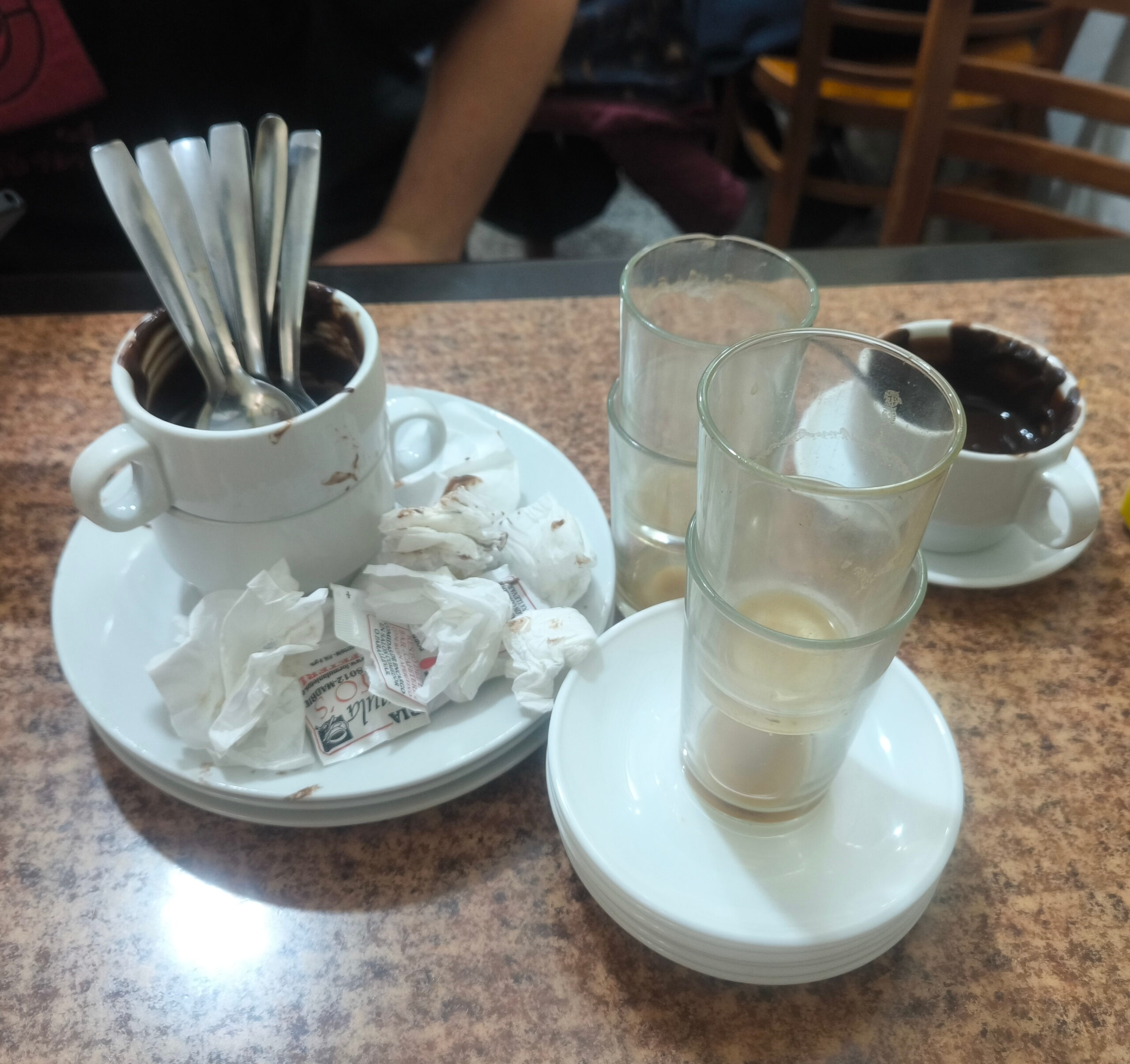 (de) Da wir bei zwei Freundinnen (eine in Fuenlabrada, die andere in Usera) Unterschlupf gefunden hatten, war das Frühstück immer der Moment, an dem unser gemeinsamer Tag begann. Alle Mitglieder der Familie Sánchez-Milde hatten auf ihrer To-Do-Liste für Madrid „Porras und Churros essen“ stehen. Vielleicht an unterschiedlichen Stellen, aber doch relativ weit oben. Noel hat sich dem vertrauensvoll angeschlossen und ich glaube, es hat auch ihm gut geschmeckt.