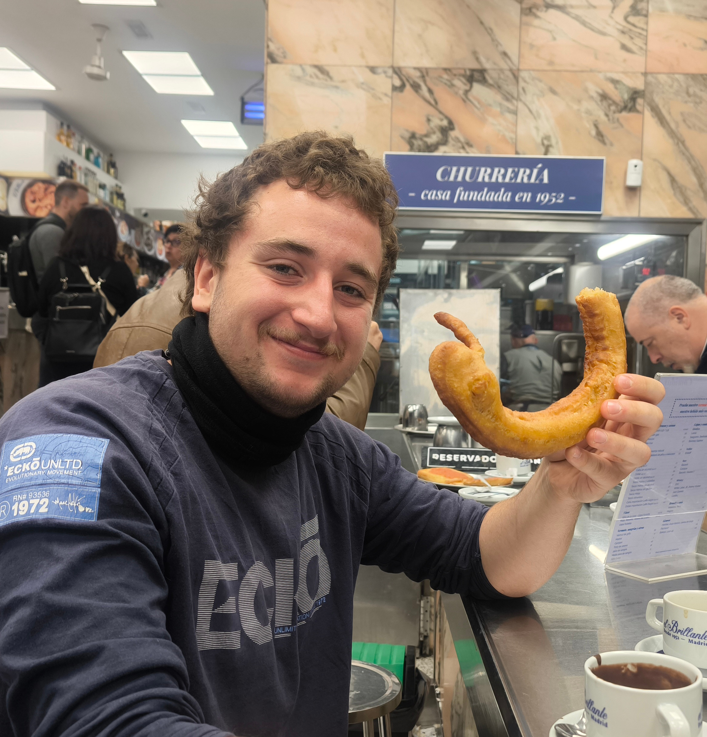 (es)  Como nos alojábamos en dos casas distintas de amigas (una en Fuenlabrada y la otra en Usera), el desayuno era siempre el momento en el que comenzaba nuestro día juntos. Todos los miembros de la familia Sánchez-Milde tenían en su lista de cosas que hacer en Madrid «comer porras y churros». Quizás con diferentes prioridades, pero relativamente arriba en la lista. Noel se sumó con confianza y creo que también le gustó.