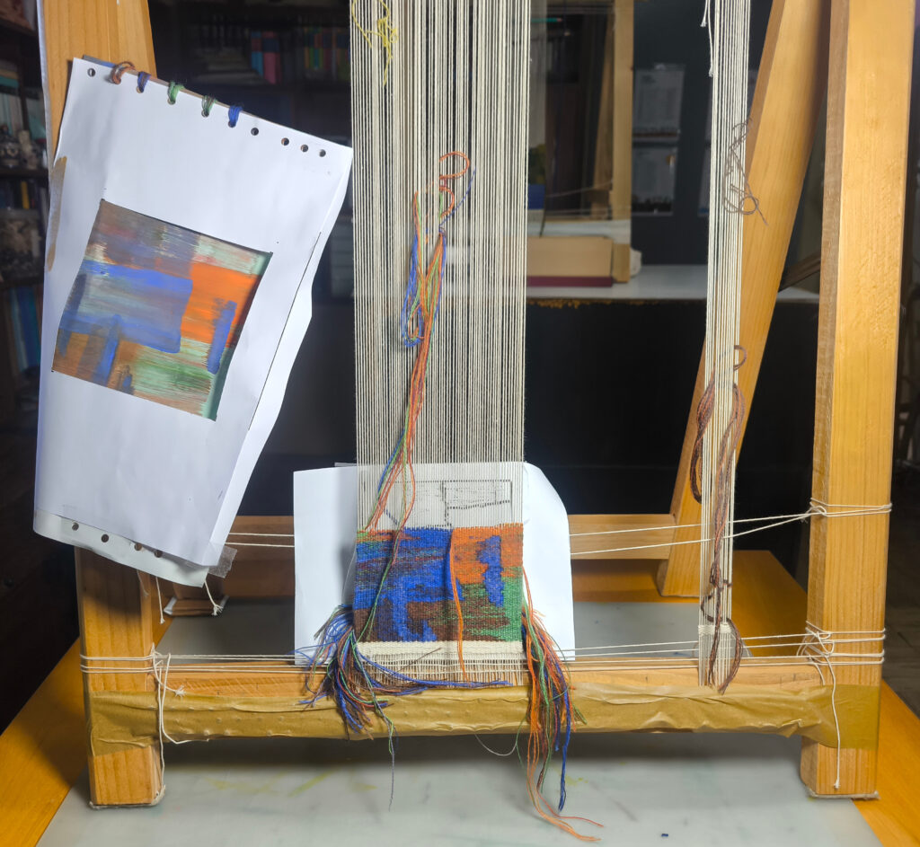 (de) Es gibt auch noch ein anderes Nachspiel, ein textiles, zum IntensivWorkshop mit den beiden Margaridas und Isabel. Wenn ich euch erinnert, hat Margarida ihren Webrahmen mit der begonnenen Bildwirkerei mit nach Lissabon genommen, in der Hoffnung, in ihrem Alltag Zeit zu finden, um diese wunderbare Bildwirkerei fertig zu weben. Da wir wussten, wir würden uns in zwei Wochen wiedersehen, war es für mich okay, auch wenn ich ganz in meinerm Inneren die Vermutung hegte, dass dieser Kampf um Ruhe und Zeit im Alltag einer berufstätigen Mutter zum Scheitern verurteilt sein würde.