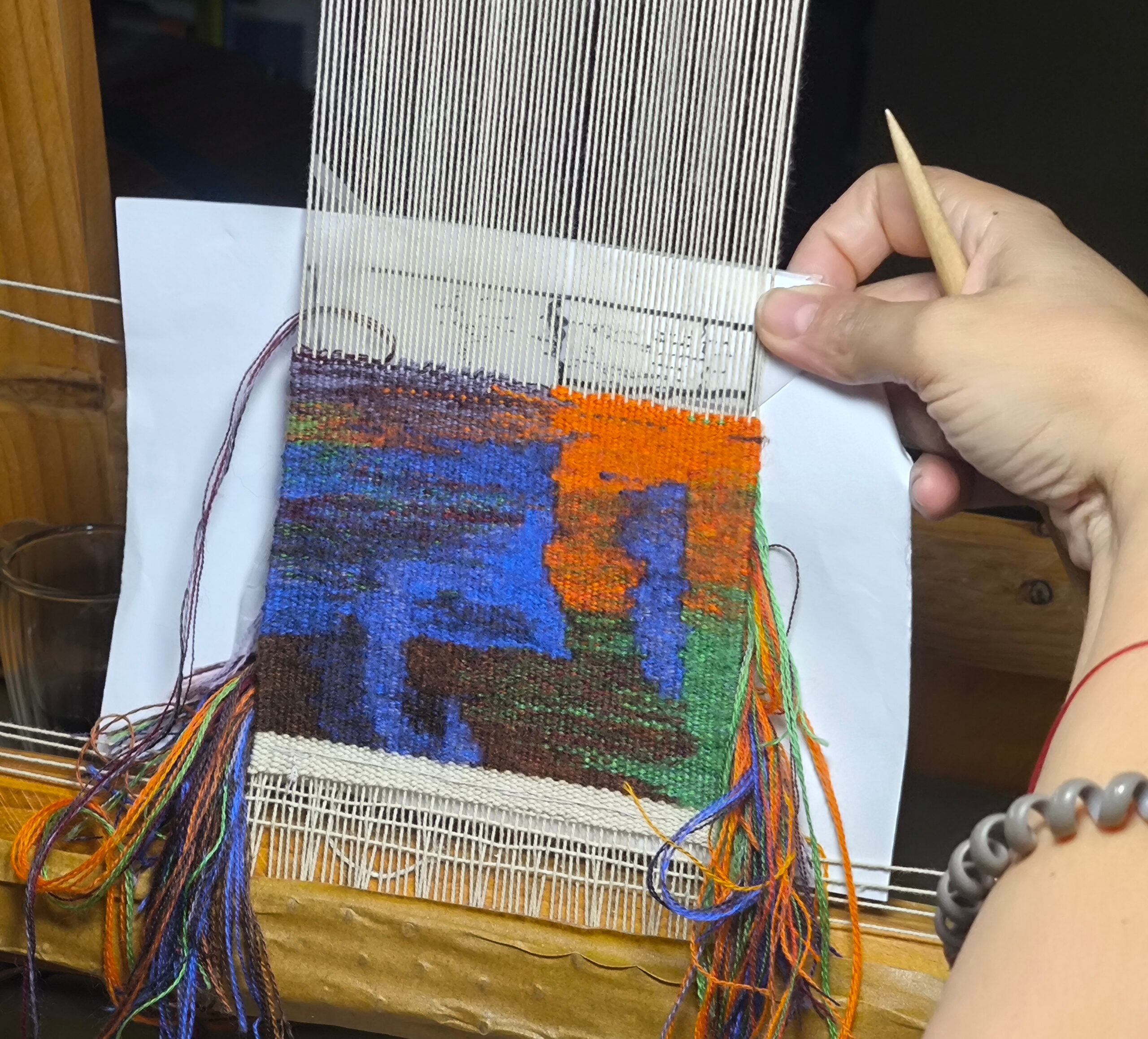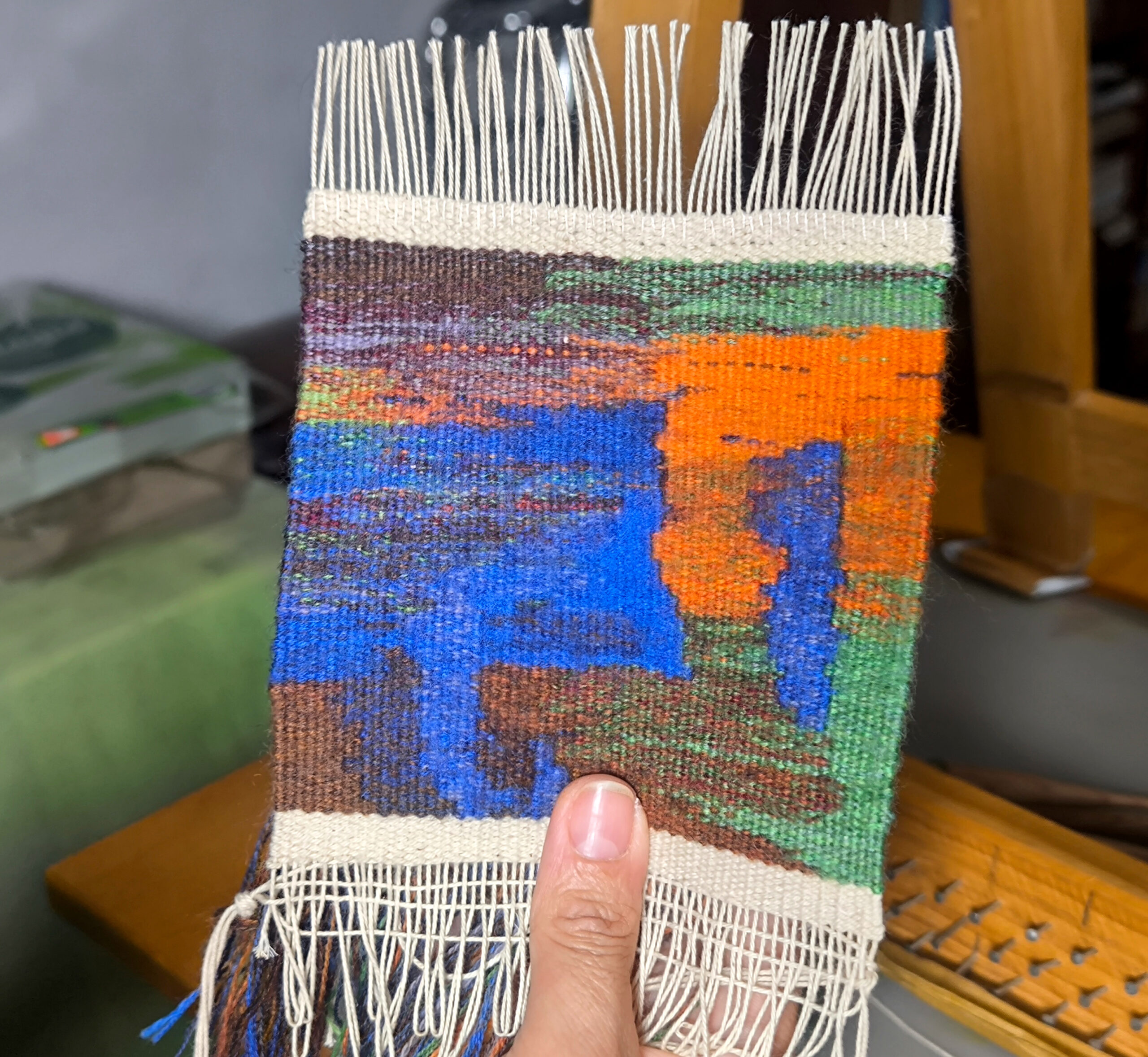 (es) También hay otro epílogo, uno textil, del taller intensivo con las dos Margaridas e Isabel. Si os acordáis, Margarida se llevó a Lisboa su telar con el tapiz que había empezado, con la esperanza de encontrar tiempo en su día a día para terminar este maravilloso tapiz. Como sabíamos que nos volveríamos a ver en dos semanas, no había problema por mi parte, aunque en mi interior sospechaba que esa lucha por encontrar tranquilidad y tiempo en la vida cotidiana de una madre trabajadora estaría condenada al fracaso.