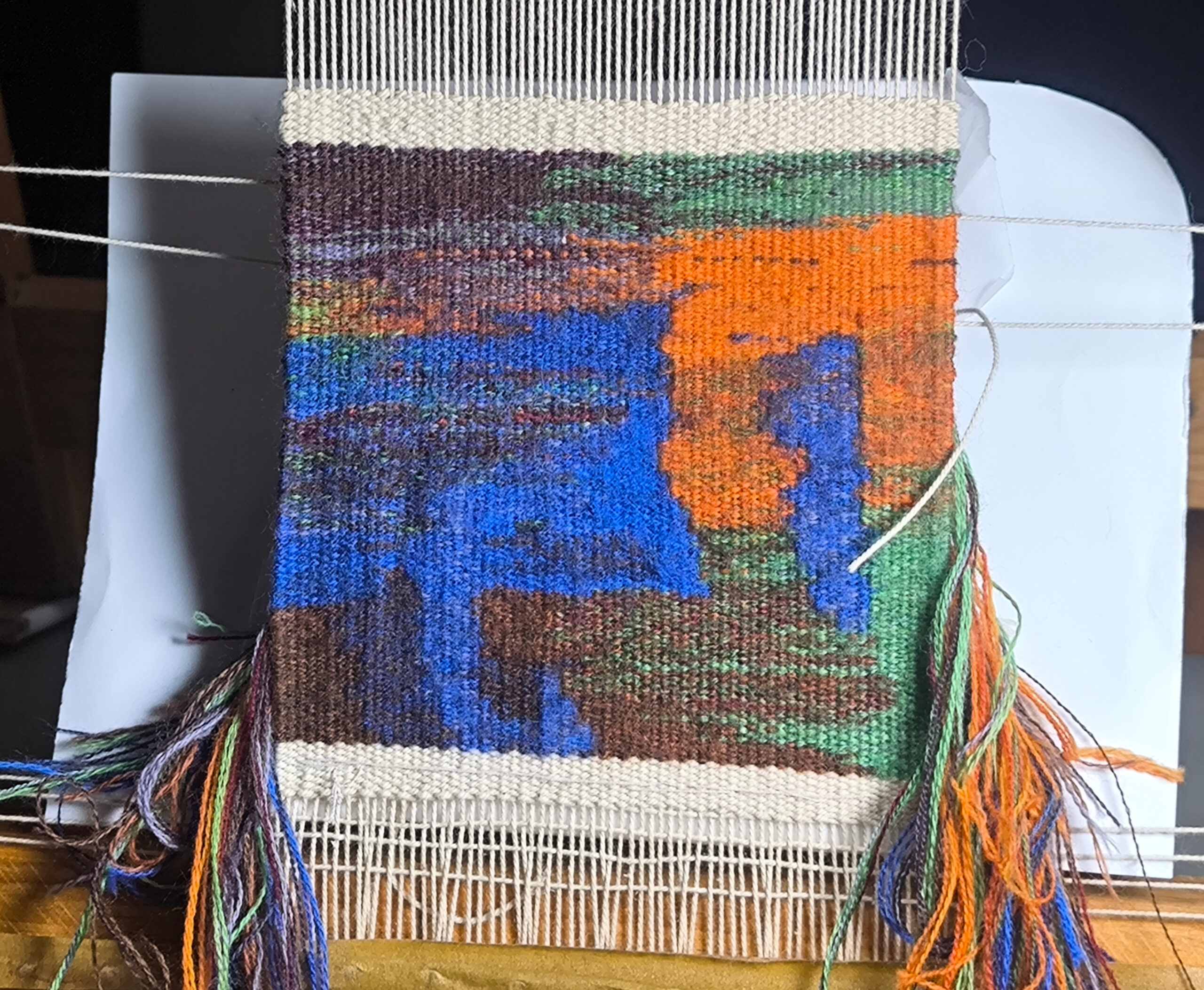 (de) Es gibt auch noch ein anderes Nachspiel, ein textiles, zum IntensivWorkshop mit den beiden Margaridas und Isabel. Wenn ich euch erinnert, hat Margarida ihren Webrahmen mit der begonnenen Bildwirkerei mit nach Lissabon genommen, in der Hoffnung, in ihrem Alltag Zeit zu finden, um diese wunderbare Bildwirkerei fertig zu weben. Da wir wussten, wir würden uns in zwei Wochen wiedersehen, war es für mich okay, auch wenn ich ganz in meinerm Inneren die Vermutung hegte, dass dieser Kampf um Ruhe und Zeit im Alltag einer berufstätigen Mutter zum Scheitern verurteilt sein würde.