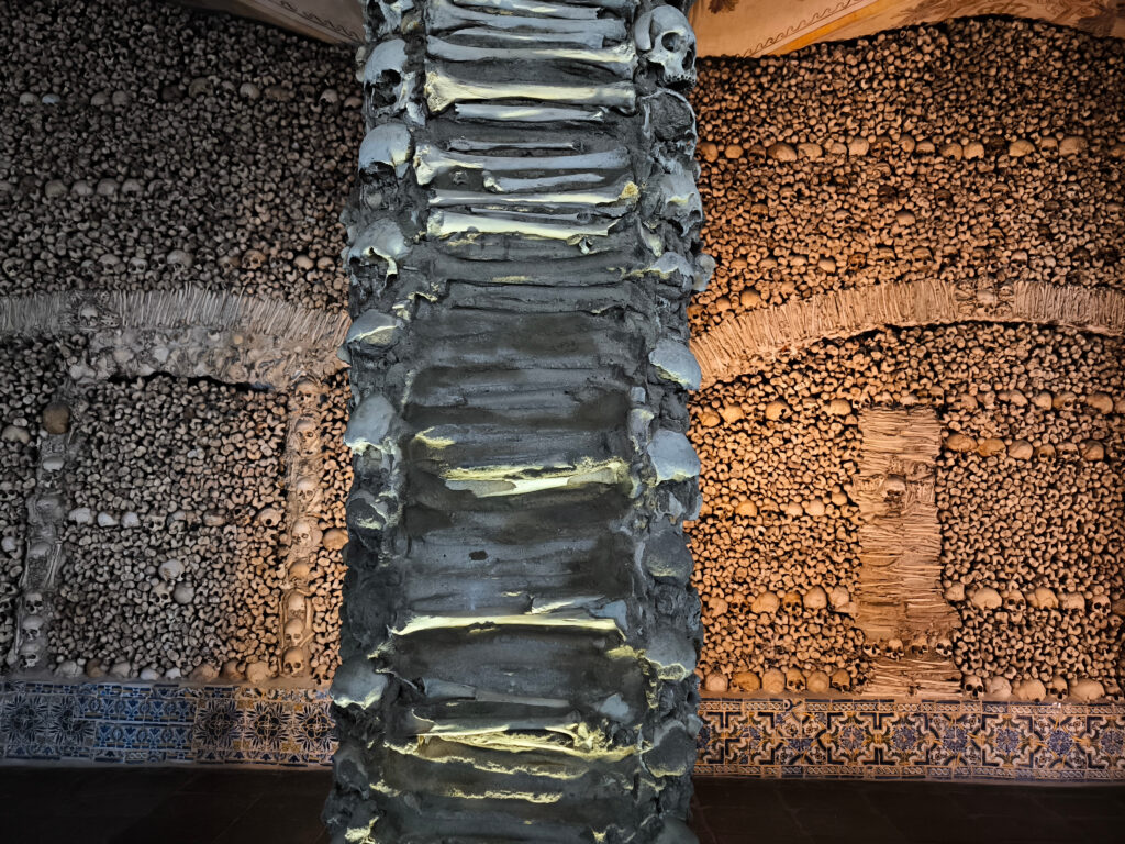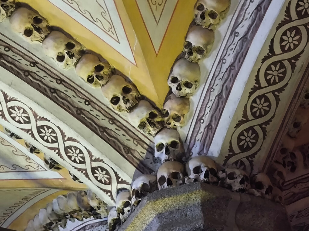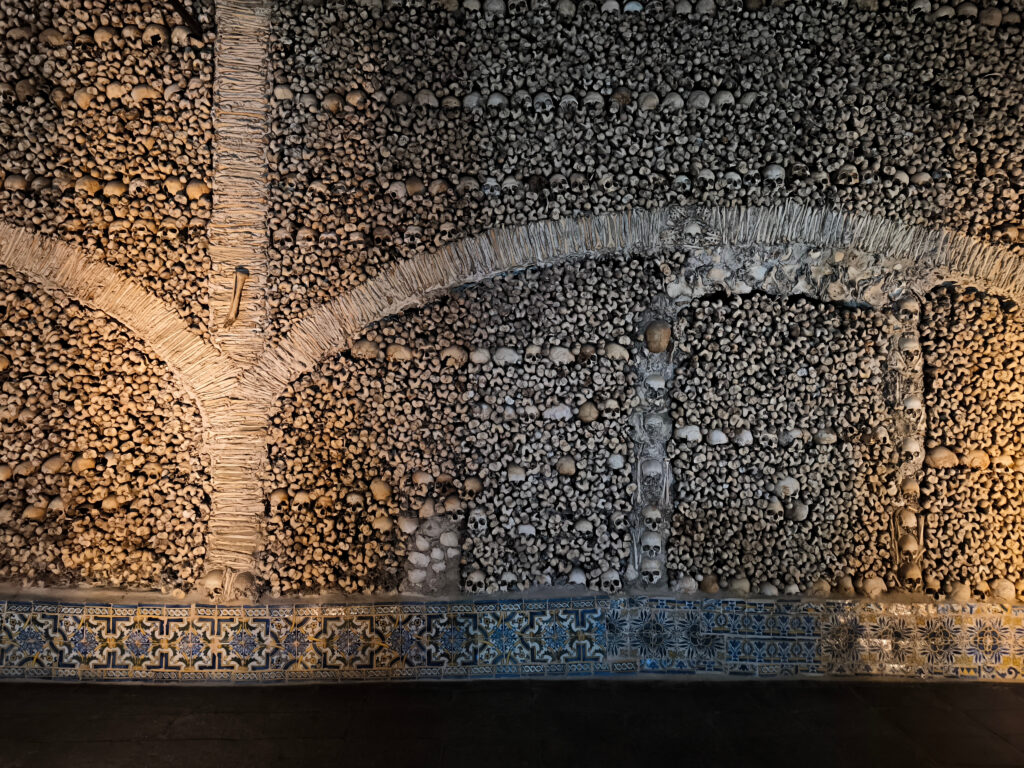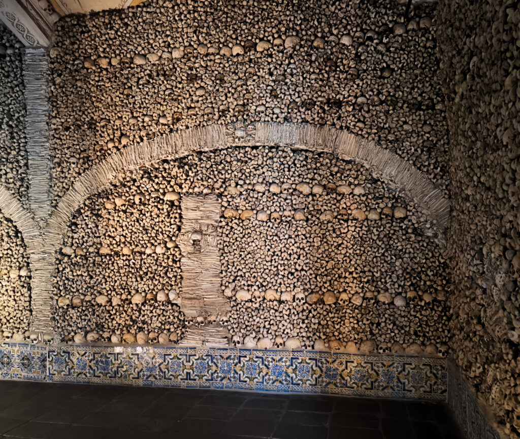 (es) Wiki dice: La Capilla de los Huesos (en portugués Capela dos ossos) es un osario que forma una pequeña capilla interior contigua a la Iglesia de San Francisco. Fue construida en el siglo XVI por un fraile franciscano quien, bajo el espíritu de la Contrarreforma de la región, quería llevar a sus hermanos hacia la contemplación y transmitir un mensaje sobre el carácter efímero y transitorio de la vida. Esto está claramente expresado en la inscripción que se puede leer en su entrada: Nós ossos que aqui estamos pelos vossos esperamos // Nosotros, los huesos que aquí estamos, por los vuestros esperamos.