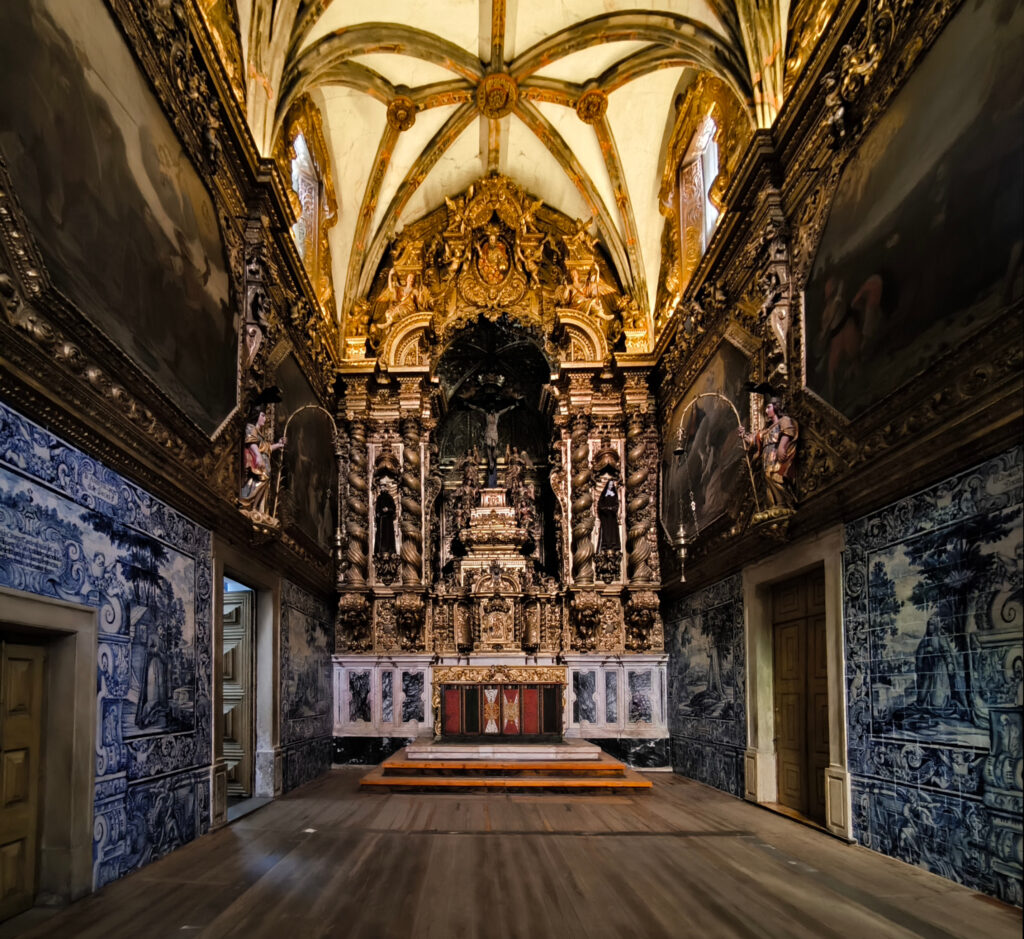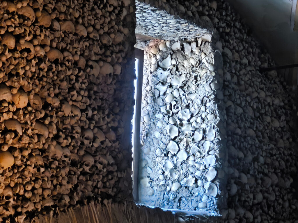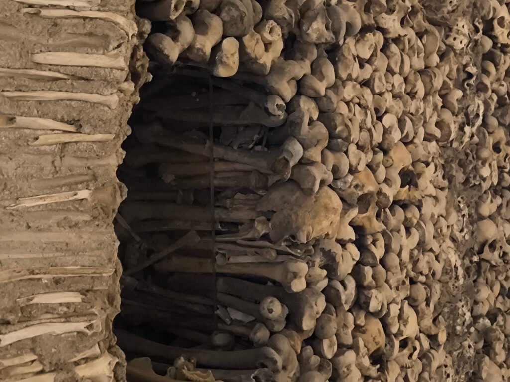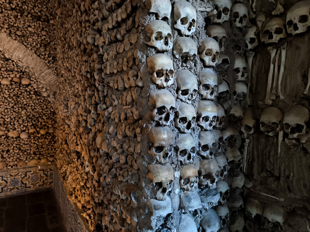 (es) Wiki dice: La Capilla de los Huesos (en portugués Capela dos ossos) es un osario que forma una pequeña capilla interior contigua a la Iglesia de San Francisco. Fue construida en el siglo XVI por un fraile franciscano quien, bajo el espíritu de la Contrarreforma de la región, quería llevar a sus hermanos hacia la contemplación y transmitir un mensaje sobre el carácter efímero y transitorio de la vida. Esto está claramente expresado en la inscripción que se puede leer en su entrada: Nós ossos que aqui estamos pelos vossos esperamos // Nosotros, los huesos que aquí estamos, por los vuestros esperamos.
