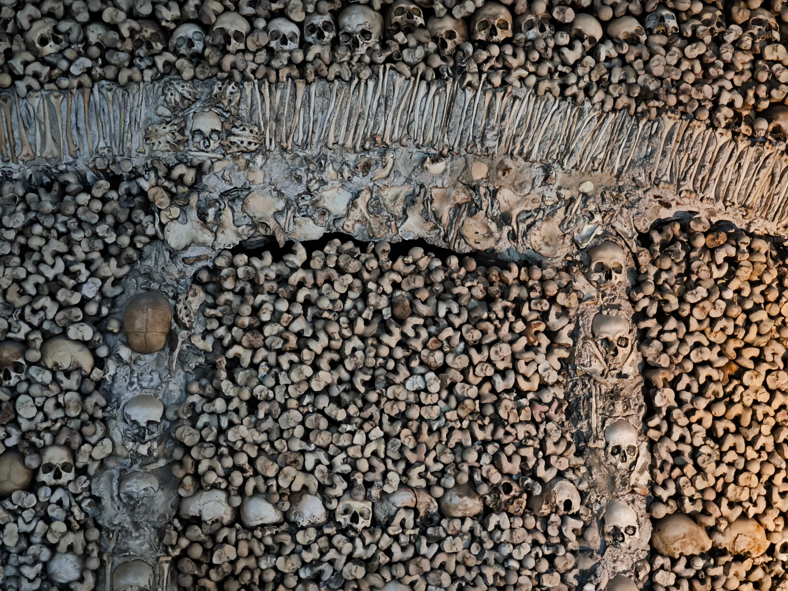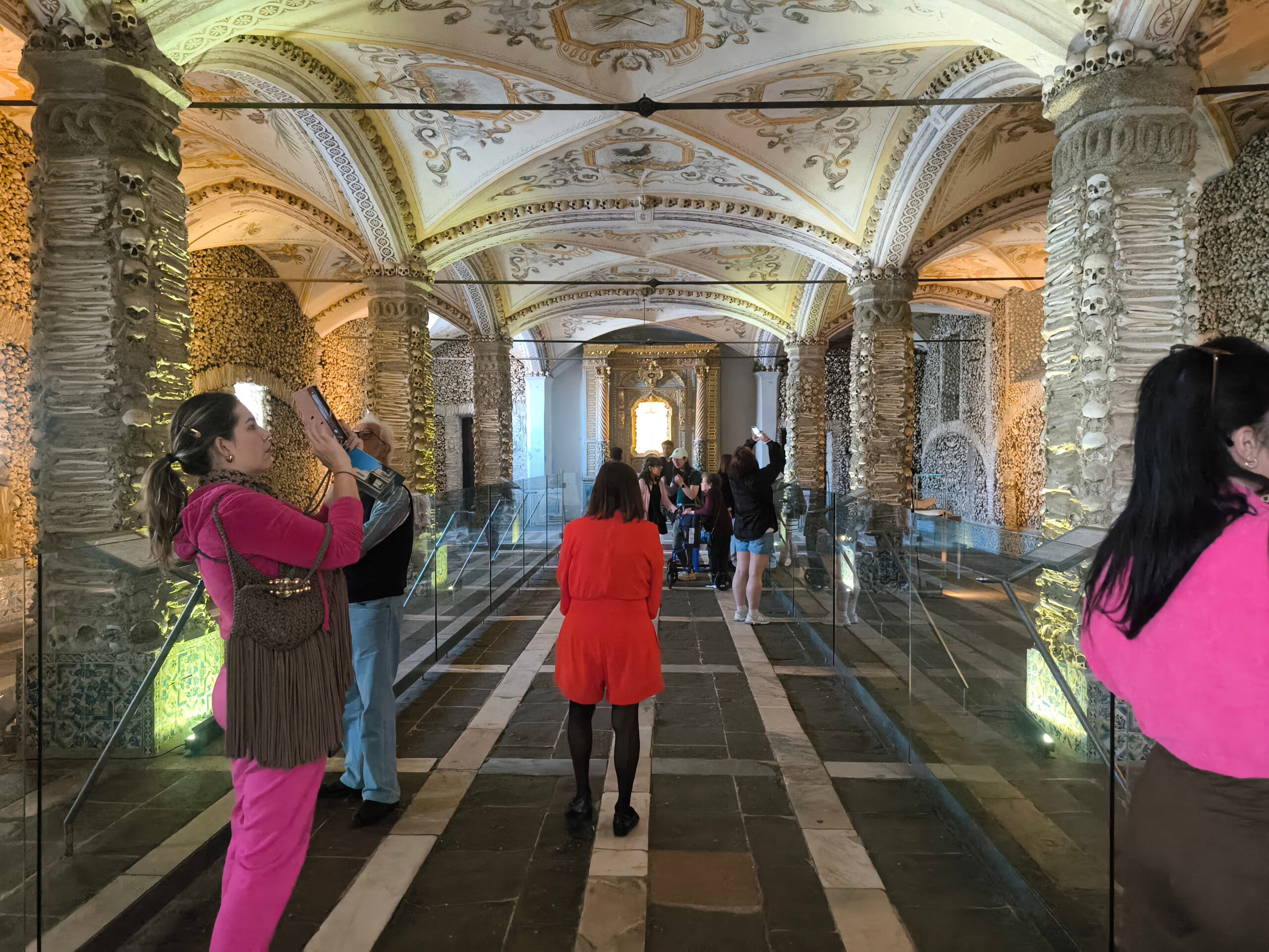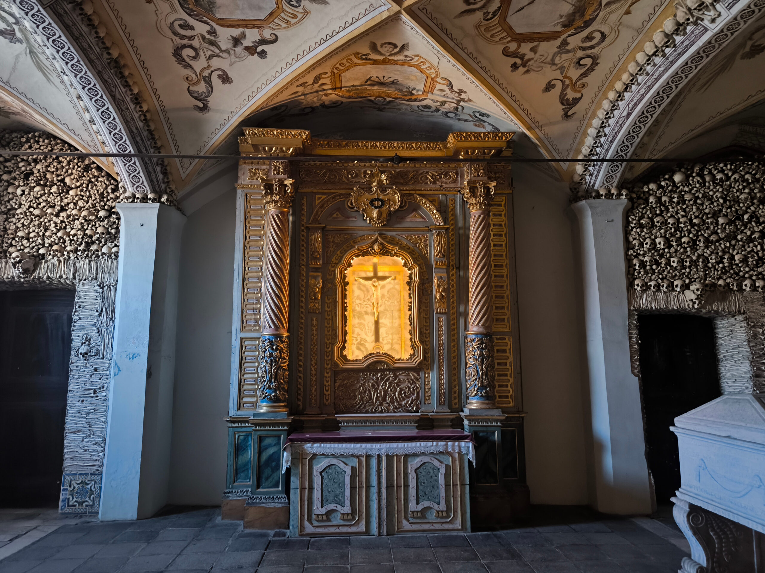 (es) Wiki dice: La Capilla de los Huesos (en portugués Capela dos ossos) es un osario que forma una pequeña capilla interior contigua a la Iglesia de San Francisco. Fue construida en el siglo XVI por un fraile franciscano quien, bajo el espíritu de la Contrarreforma de la región, quería llevar a sus hermanos hacia la contemplación y transmitir un mensaje sobre el carácter efímero y transitorio de la vida. Esto está claramente expresado en la inscripción que se puede leer en su entrada: Nós ossos que aqui estamos pelos vossos esperamos // Nosotros, los huesos que aquí estamos, por los vuestros esperamos.