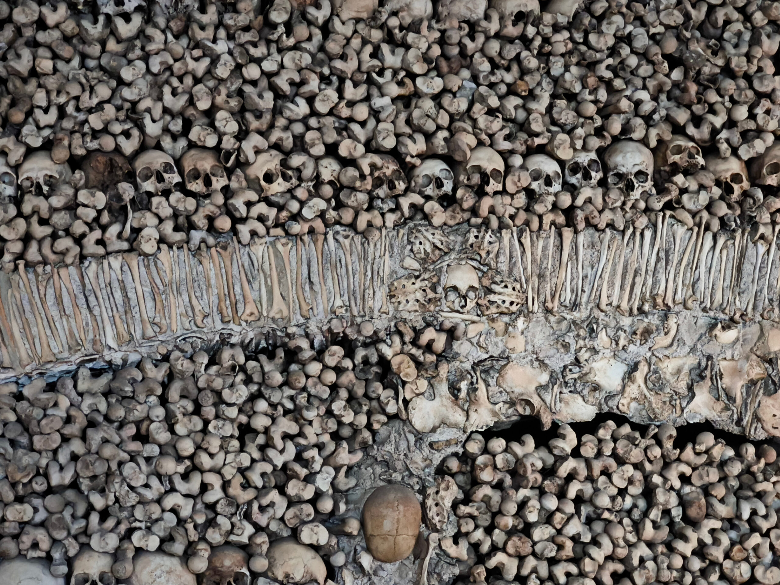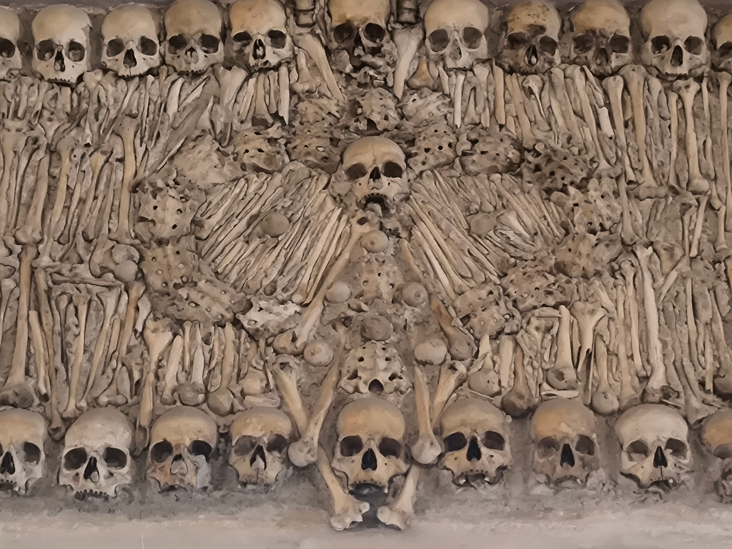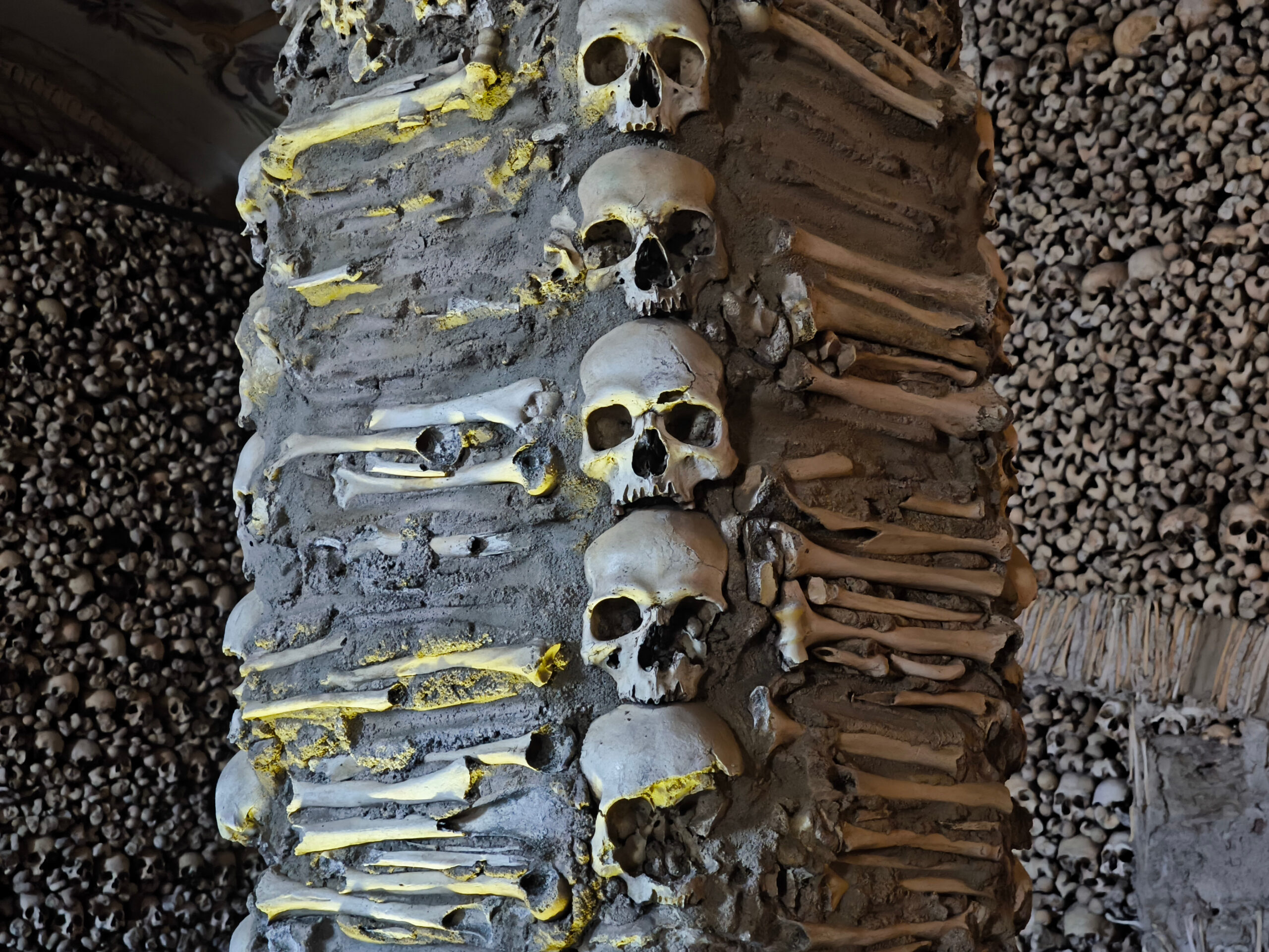 (de) Wiki sagt dazu: Die Capela dos Ossos wurde ursprünglich im 16. Jahrhundert auf Initiative eines Franziskanermönchs errichtet, der im Geiste der Gegenreformation seine Mitbrüder zum Nachdenken über die Vergänglichkeit des menschlichen Lebens und das Geheimnis des Todes anregen wollte. Die Absicht ist eindeutig didaktischer Natur, wie die gereimte Eingangsinschrift zeigt: Nós ossos / que aqui estamos / pelos vossos / esperamos („Wir Knochen, die wir hier sind, warten auf die euren“). Die Kapelle wurde im 18. Jahrhundert vollständig restauriert, als der portugiesische König Johann V. die Kirche San Bernardino alle Ossa in Mailand besuchte, die der in Évora sehr ähnlich ist.