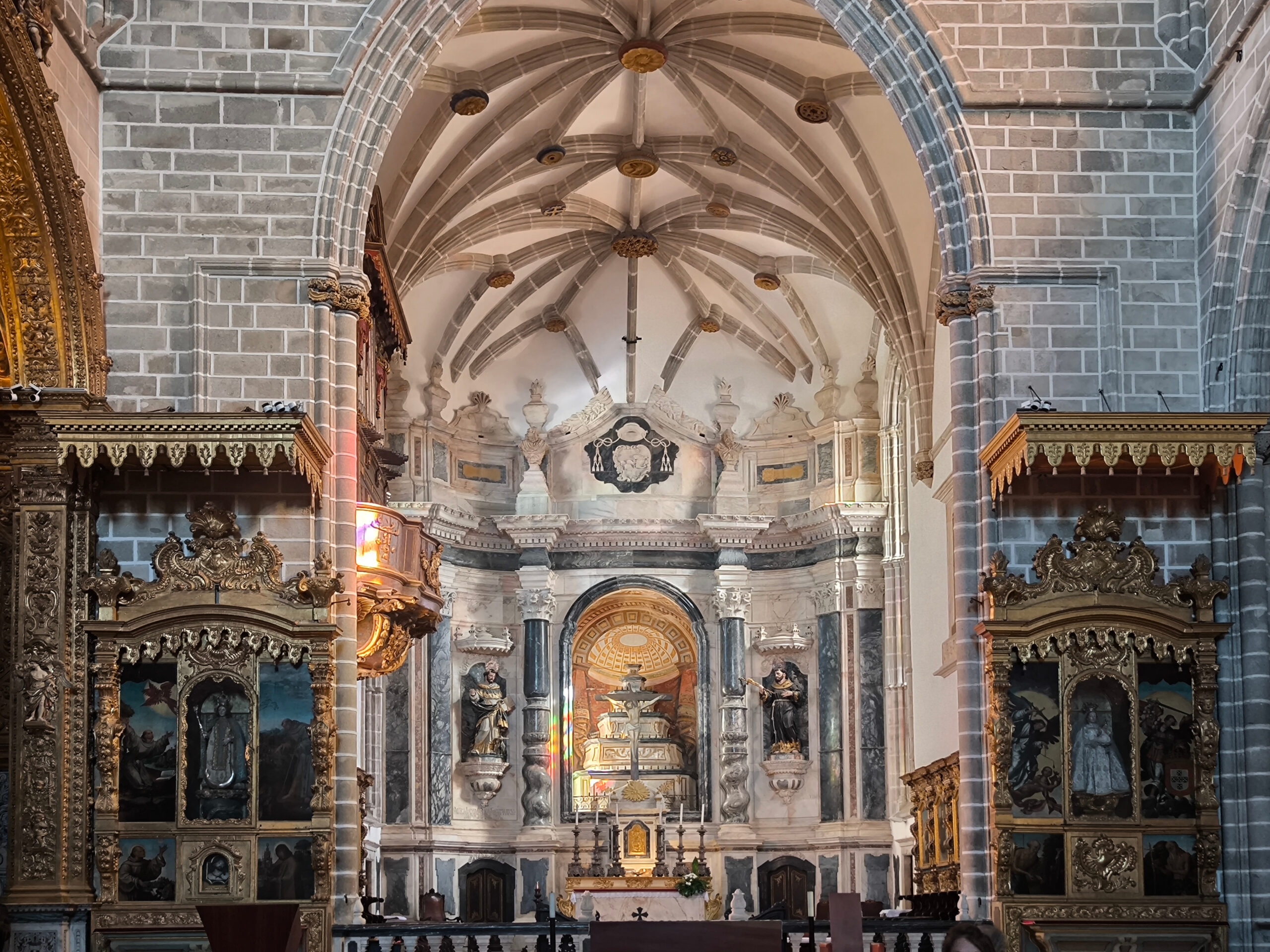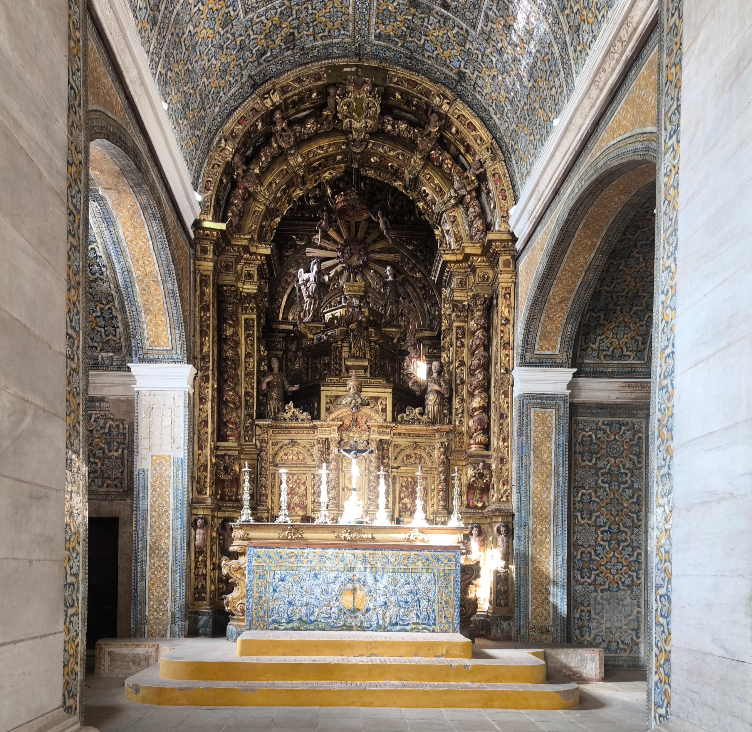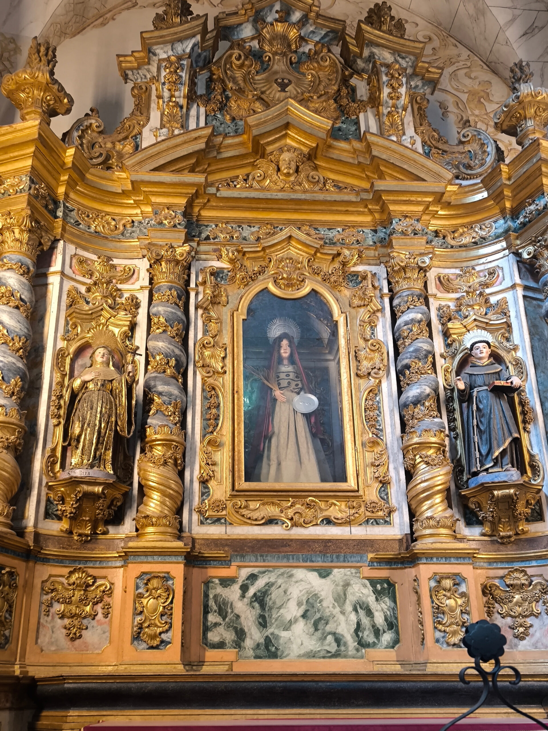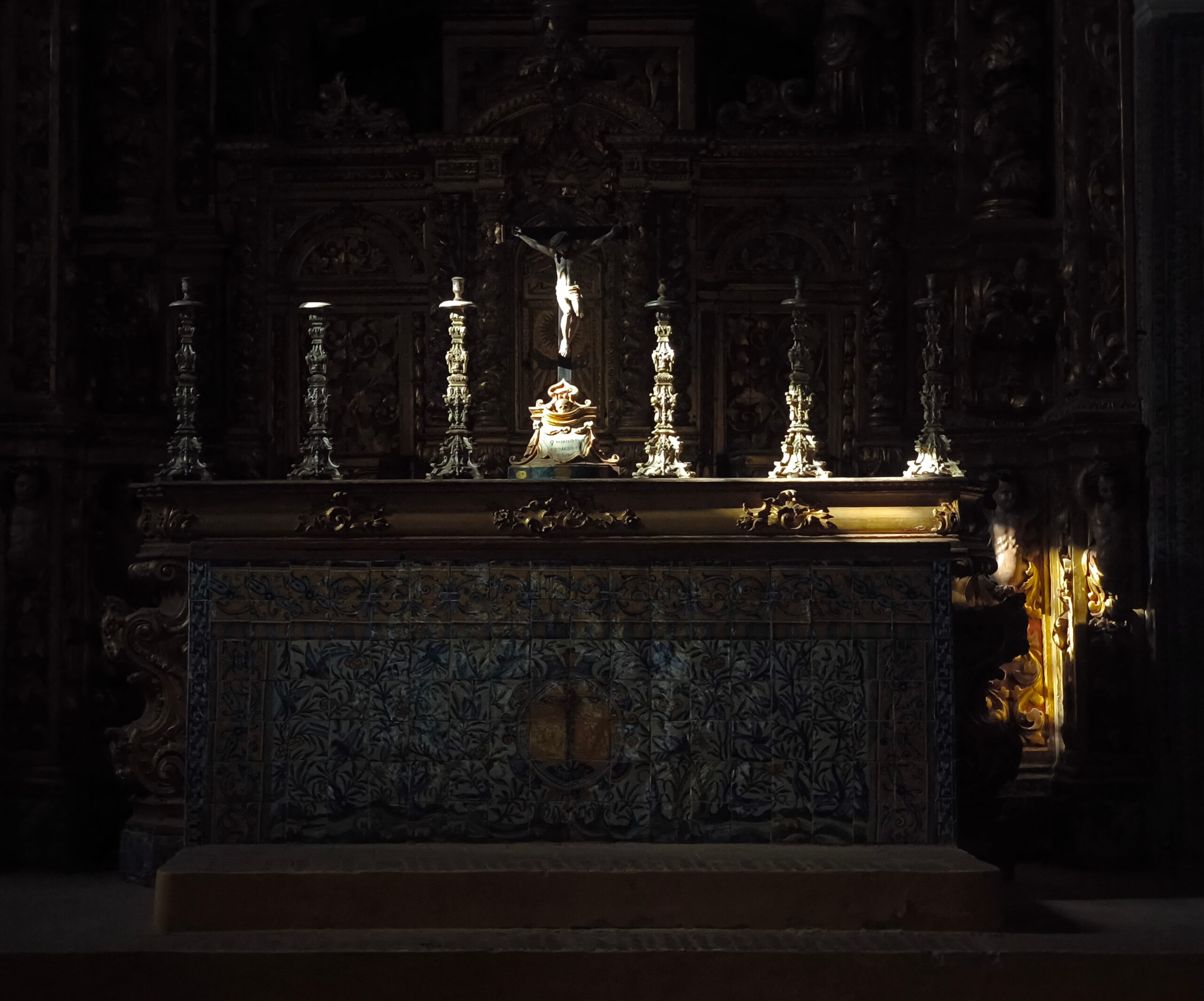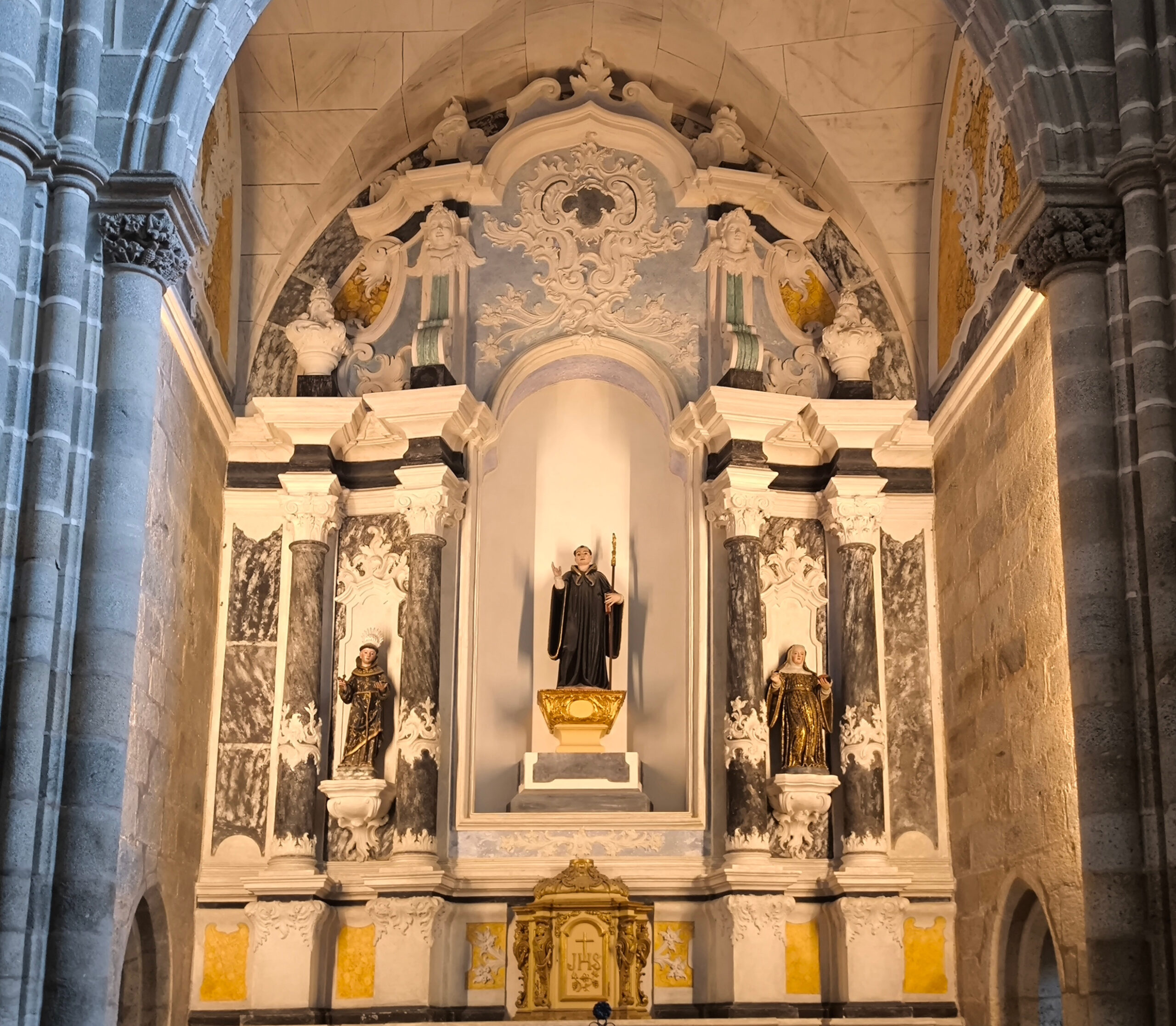 (es) Al igual que la catedral fue lo más destacado de mi primera visita a Évora, en mi segunda visita lo es la iglesia de San Francisco. Entré un poco por casualidad, porque primero pasé por la entrada principal y la fachada, y terminé en una pequeña parte aún conservada del antiguo claustro, junto a la capilla de los huesos. Y esta despertó mi curiosidad y quería verla. Pero no era gratis. Así que, en contra de mi convicción de no apoyar económicamente a la institución EGLISIA, hice mi contribución para poder ver esta particularidad patrimonial.