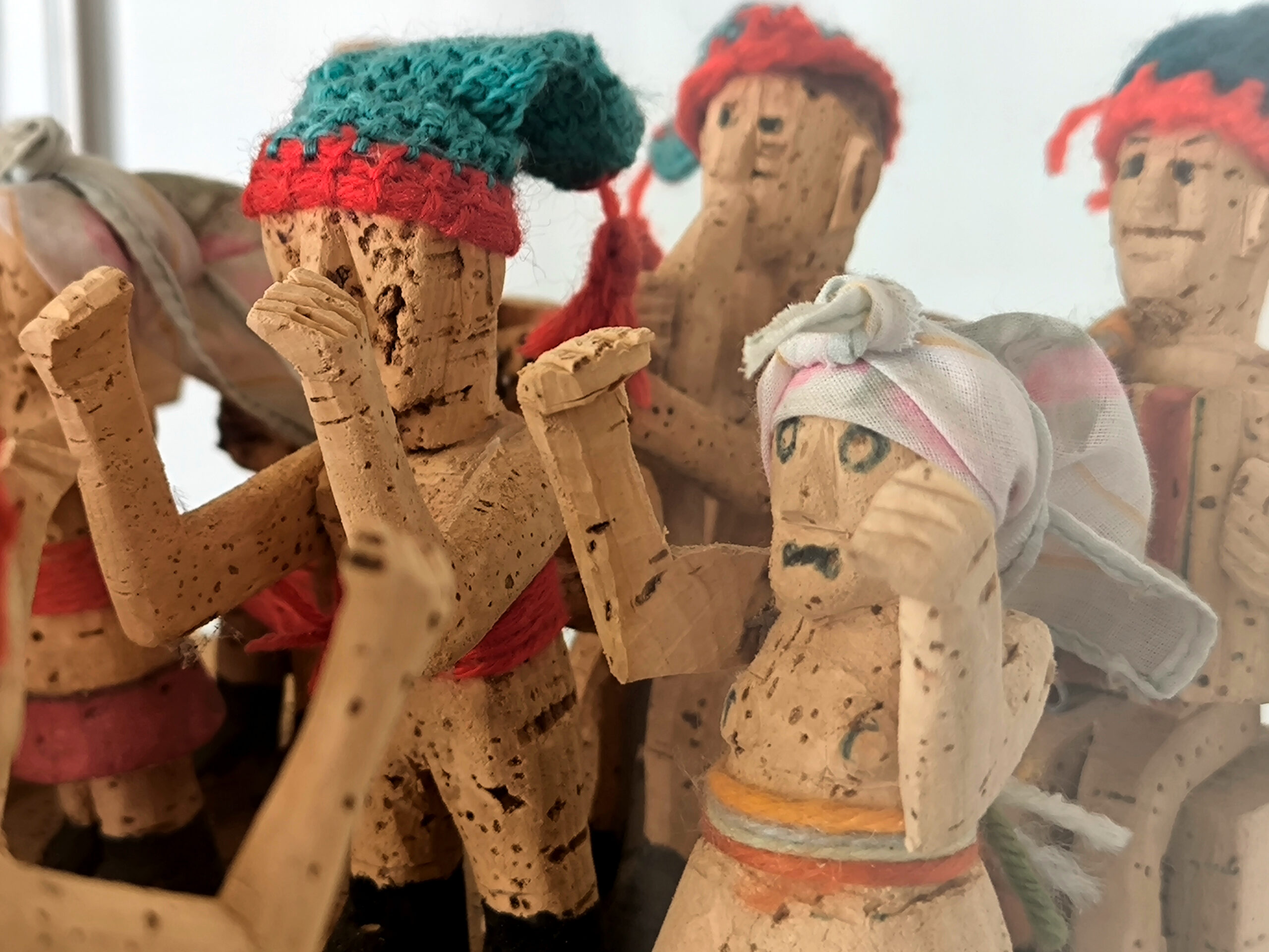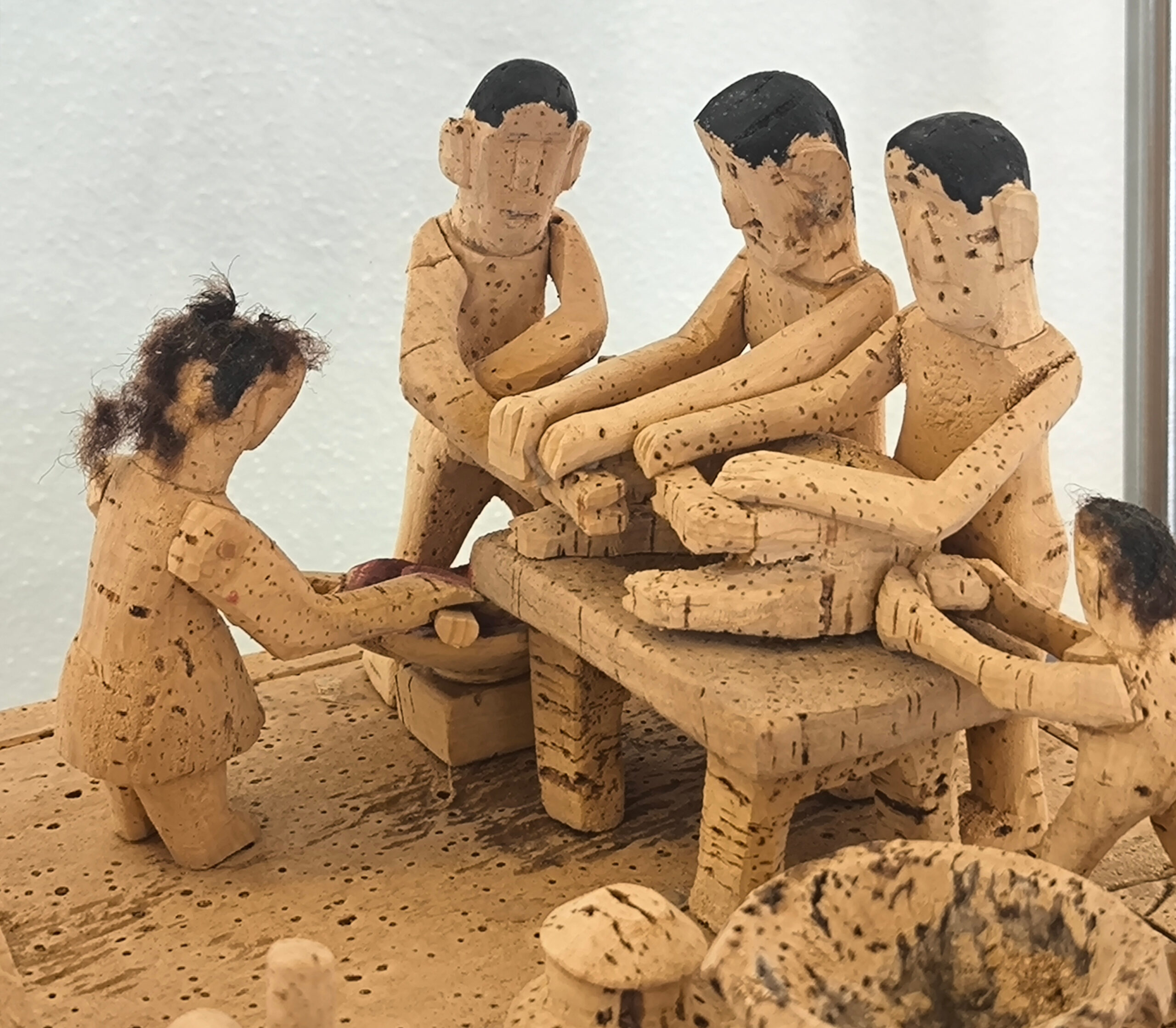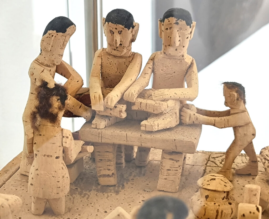 Einen Raum, der dem Kunsthandwerk gewidmet ist, also all dem, was man eher aus Vergnügen oder als Freizeitbeschäftigung kreativ aus Kork herstellen kann. Auch hier war ich einmal mehr begeistert von den Figuren aus Kork oder Holz, mit denen Alltagssituationen nachkreiert wurden. Wie gerne hätte ich solch eine Figur gekauft. Aber es gibt anscheinend niemanden mehr, der sie herstellt. Alle haben, keiner braucht….. Und allein vom Tourismus der in die Region kommt, kann wahrscheinlich kein:e Handwerker:in leben und funktionierende Strukturen gemeinsamer Vermaktung oder sonstiger Förderung scheint es nicht wirklich zu geben. Schade, aber irgendwie auch verständlich. Keine Ahnung, wie man das ändern kann.