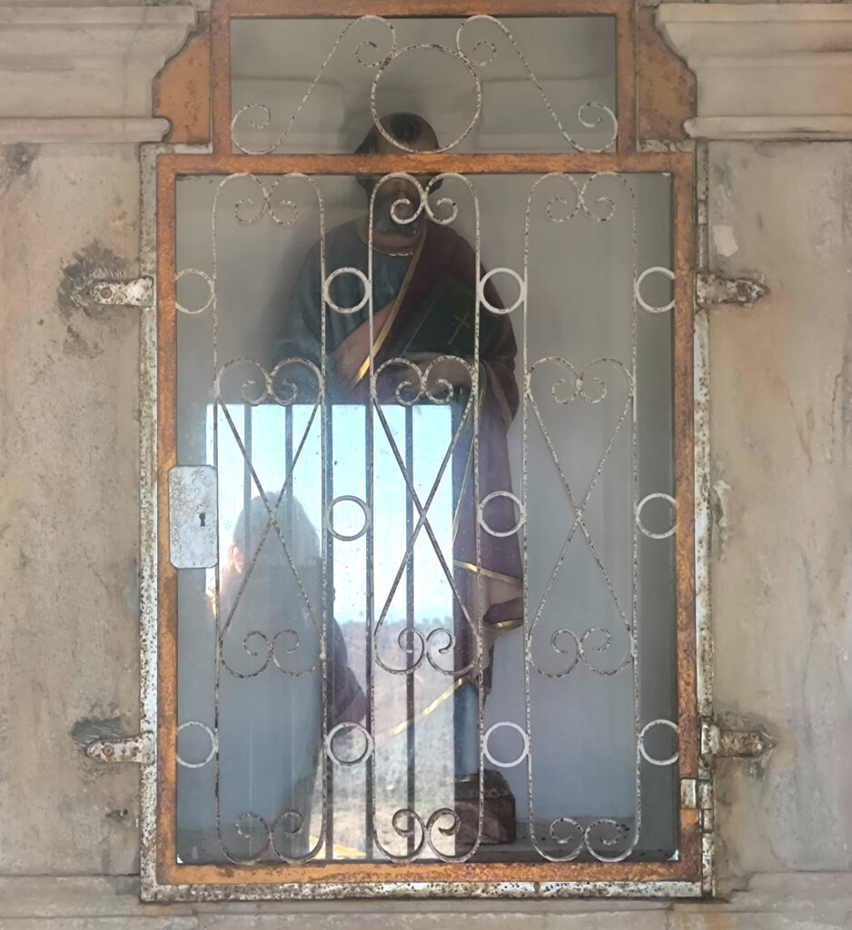 (de) Auf der allerhöchsten Erhöhung steht eine ganz kleine Kapelle, oder besser gesagt eine Art großer Bildstock mit der Figur des Heiligen Petrus. Und ein Fernglas um sich die weite Landschaft etwas näher ranzuholen.