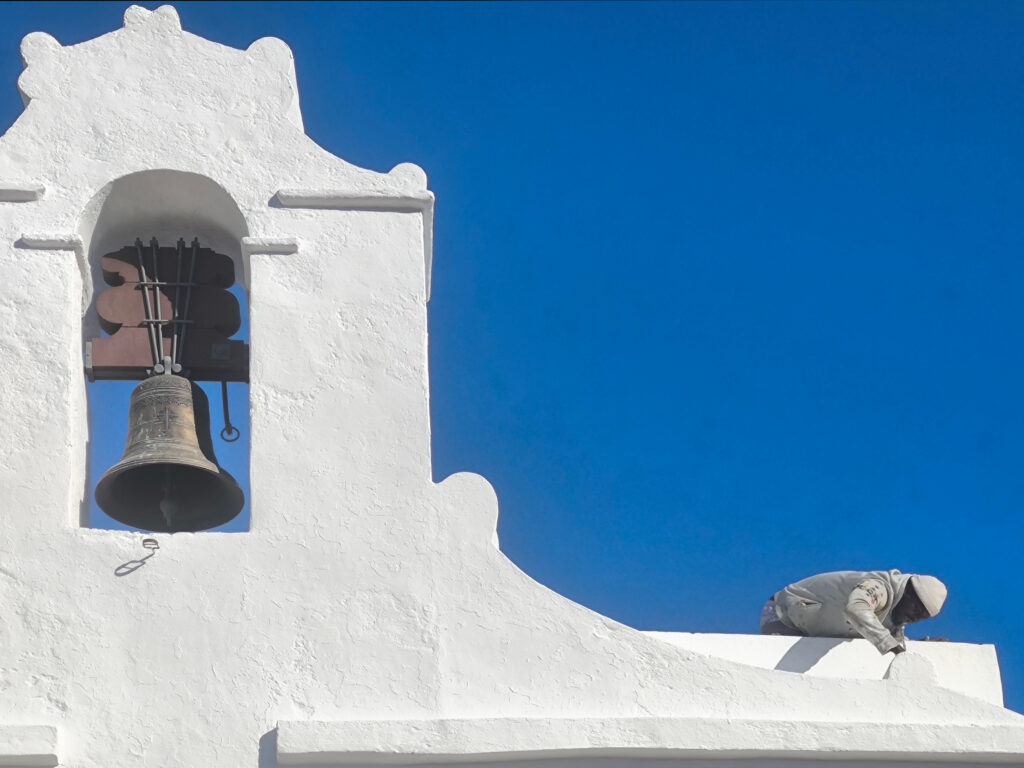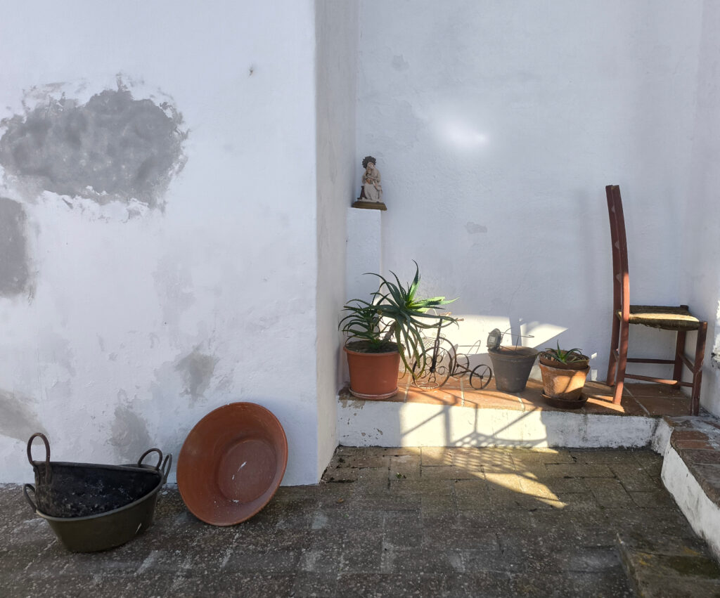 (de) Es wird dort fleißig gespachtelt, gepinselt, gestrichen. Aber das „Centro de Interpretación“, unser „eigentliches Ziel“ haben wir verschlossen gefunden. Keiner wußte uns zu sagen, ob es das überhaupt noch gibt. Vielleicht wollte das auch niemand dort. Beim Stöbern auf der Seite von SPIRA nach Information zu den Workcamps „Restauration“ habe ich gesehen, dass die Teilnehmer:innen während der zweiwöchigen Restaurationsarbeit an den Fresken in der Kapelle hier untergebracht sind, denn es gibt wohl auch eine kleine Herberge nebenan.