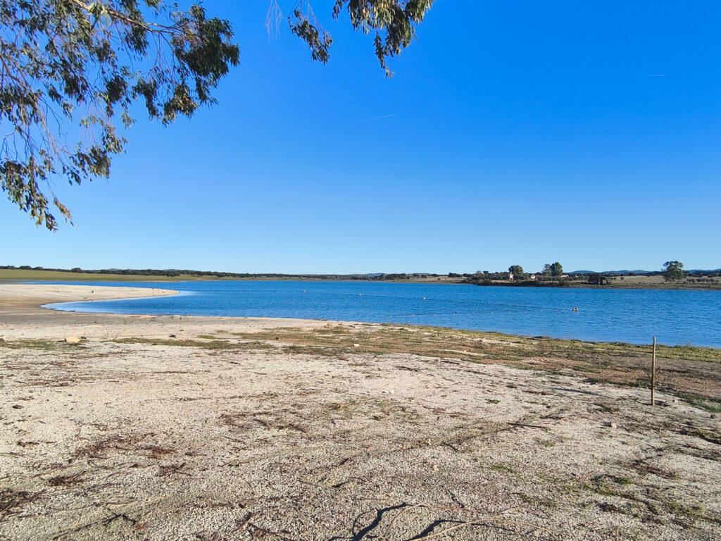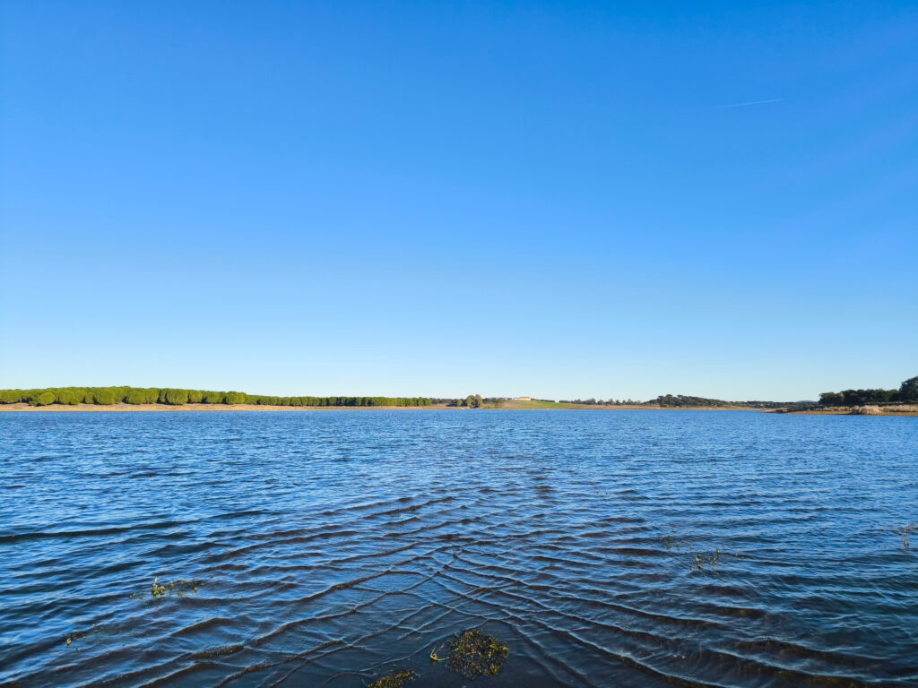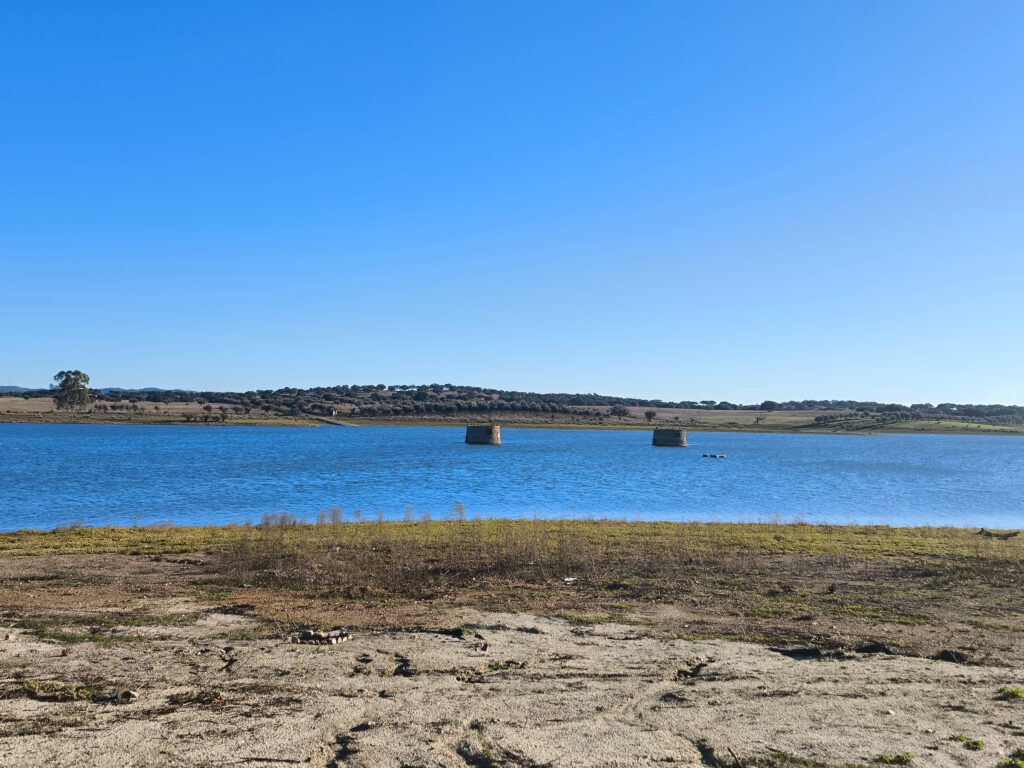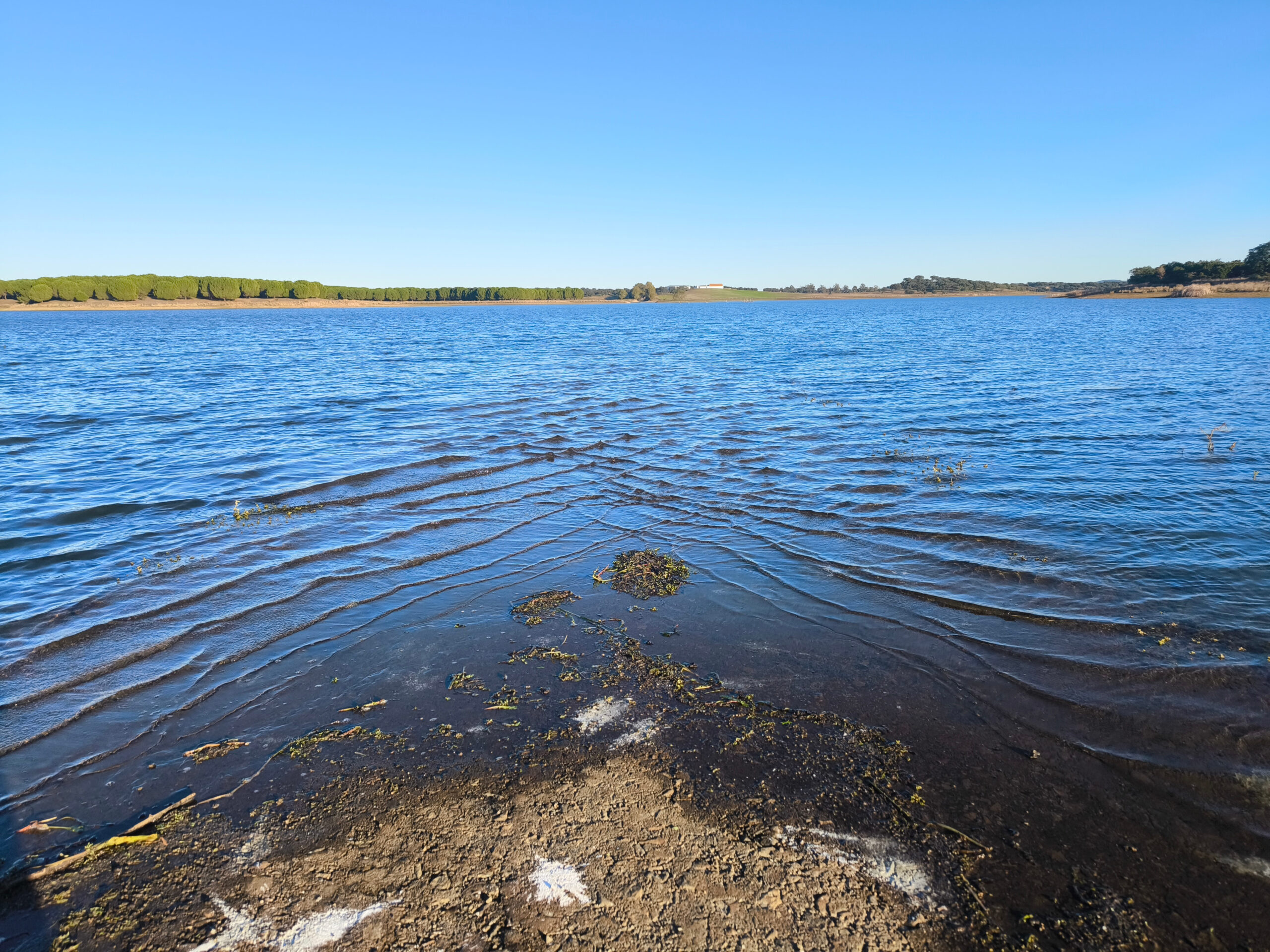 (es) De regreso de Portel a Viana do Alentejo, y para concluir mis exploraciones, hicimos un pequeño desvío al embalse cerca de Oriola para ver cómo habían afectado las recientes lluvias al nivel del agua. De hecho, ha subido notablemente, considerando la superficie total del embalse. Si os acordáis, en mi primera visita pude caminar entre los dos „torres“ hasta la otra orilla del lago porque el nivel del agua estaba tan bajo que la antigua carretera era transitable. Hablamos brevemente con los dueños del pequeño restaurante en la playa, y me enteré de que la subida del nivel del agua no se debe únicamente a la lluvia, sino a que las numerosas plantaciones de la zona (principalmente de cultivo intensivo de almendras) ya no reciben riego.