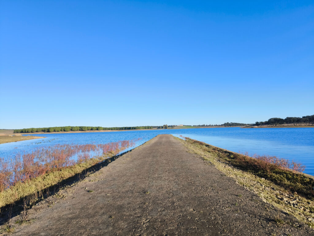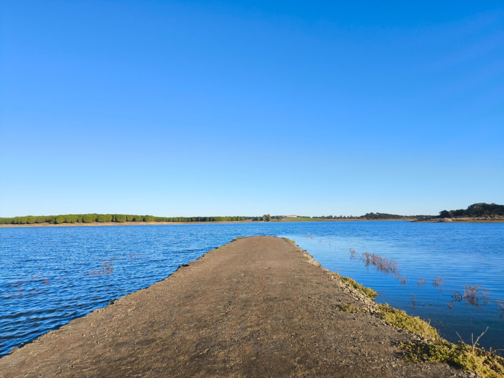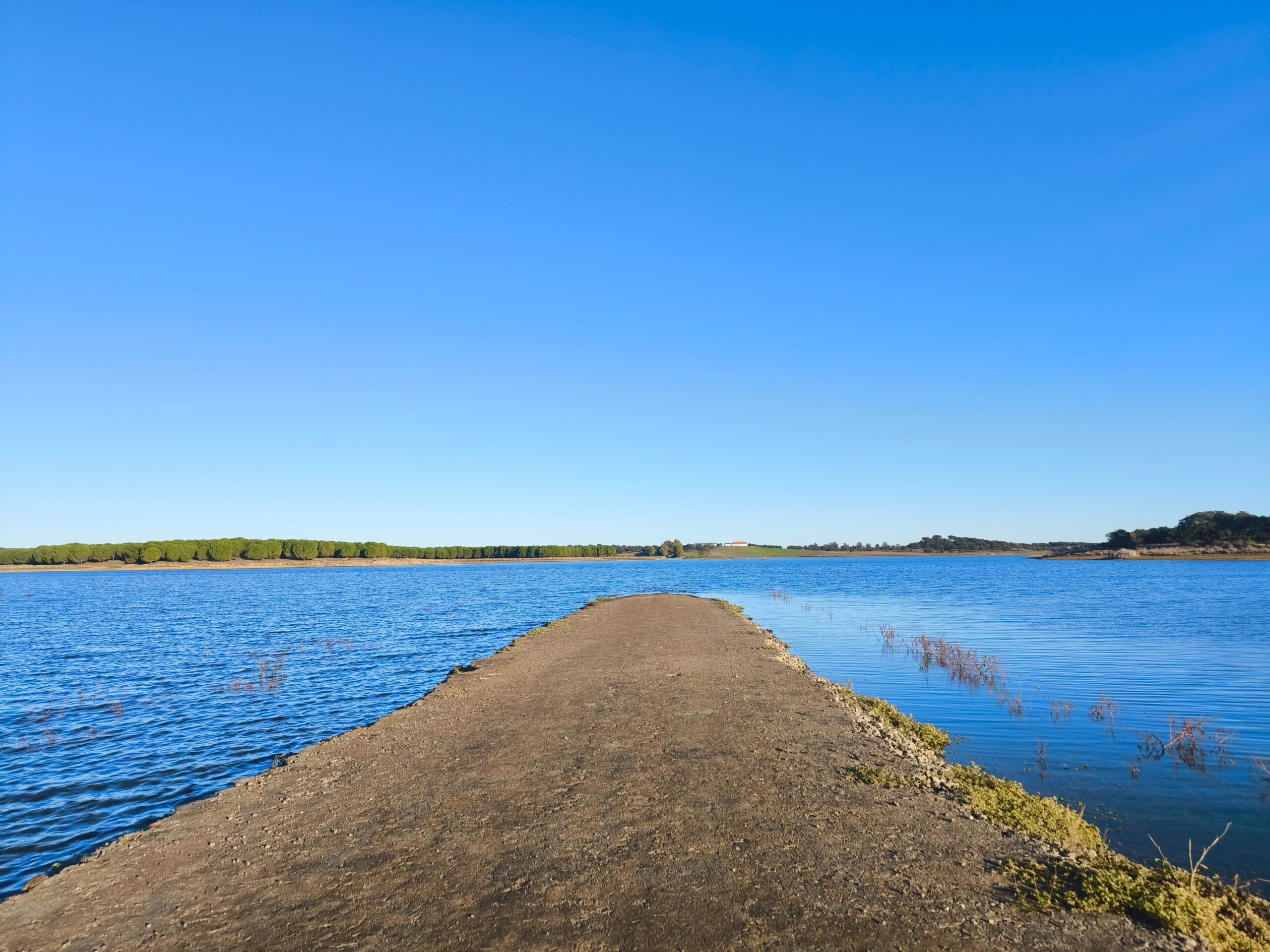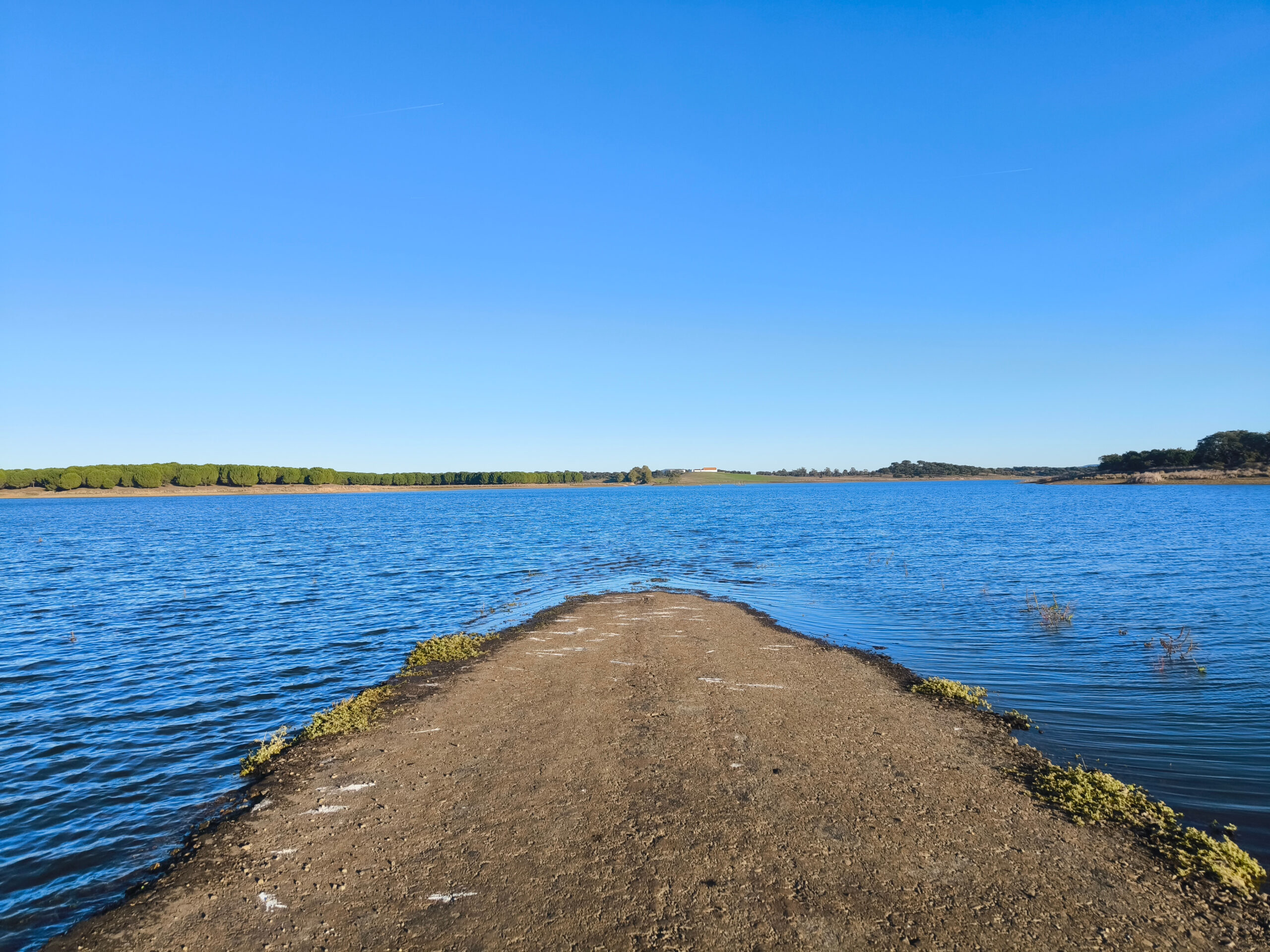 (es) Margarida me llevó a otro lugar que quería enseñarme, uno de sus lugares favoritos del embalse. Y entiendo por qué. Aquí hay tranquilidad; casi nadie parece venir. La vista sobre el agua y el paisaje es inmensa. Y el viejo camino que se pierde en el agua le da al lugar una atmósfera especial, un tanto melancólica, un tanto fantástica.