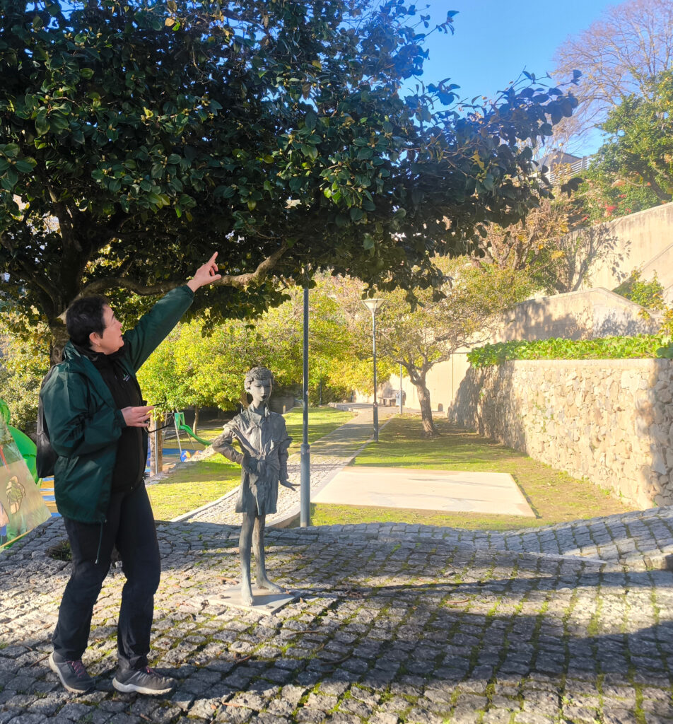 (es) Mi segunda caminata también era temática: árboles singulares en Monchique y sus alrededores. Ya sabéis lo mucho que amo a los árboles. No había manera de resistir a esta caminata. Esta vez, comenzó en la galería municipal „San Antonio“, y nuestro primer árbol fue una de las dos araucarias que se encuentran en Monchique. La primera se encuentra en el parque municipal y tiene una historia especial: en 1941, su copa se partió durante una tormenta. Desde entonces, crece con una copa doble. Por cierto, veréis que aquí en adelante de vez en cuando aparecerá el tema de las especies invasoras, es decir aquellas plantas y animales que vienen de otras regiones del mundo y que debido a su proliferación amenazan a la flora y fauna autóctona. En esta página he encontrado una lista de las plantas invasoras en Portugal.