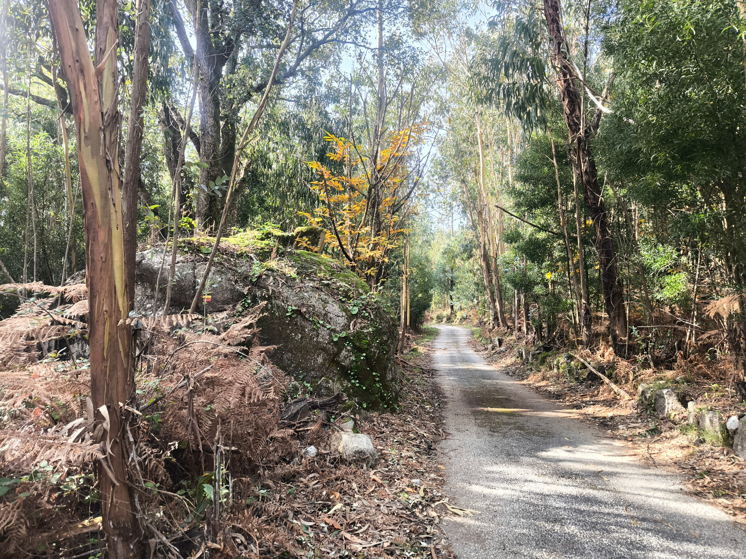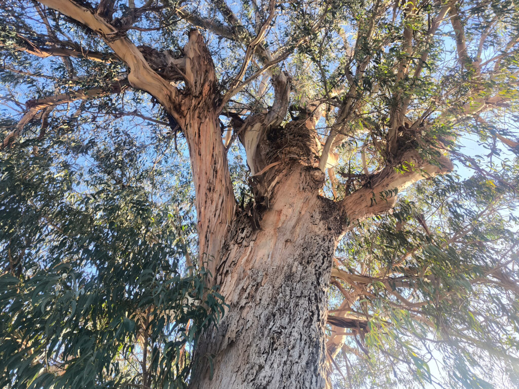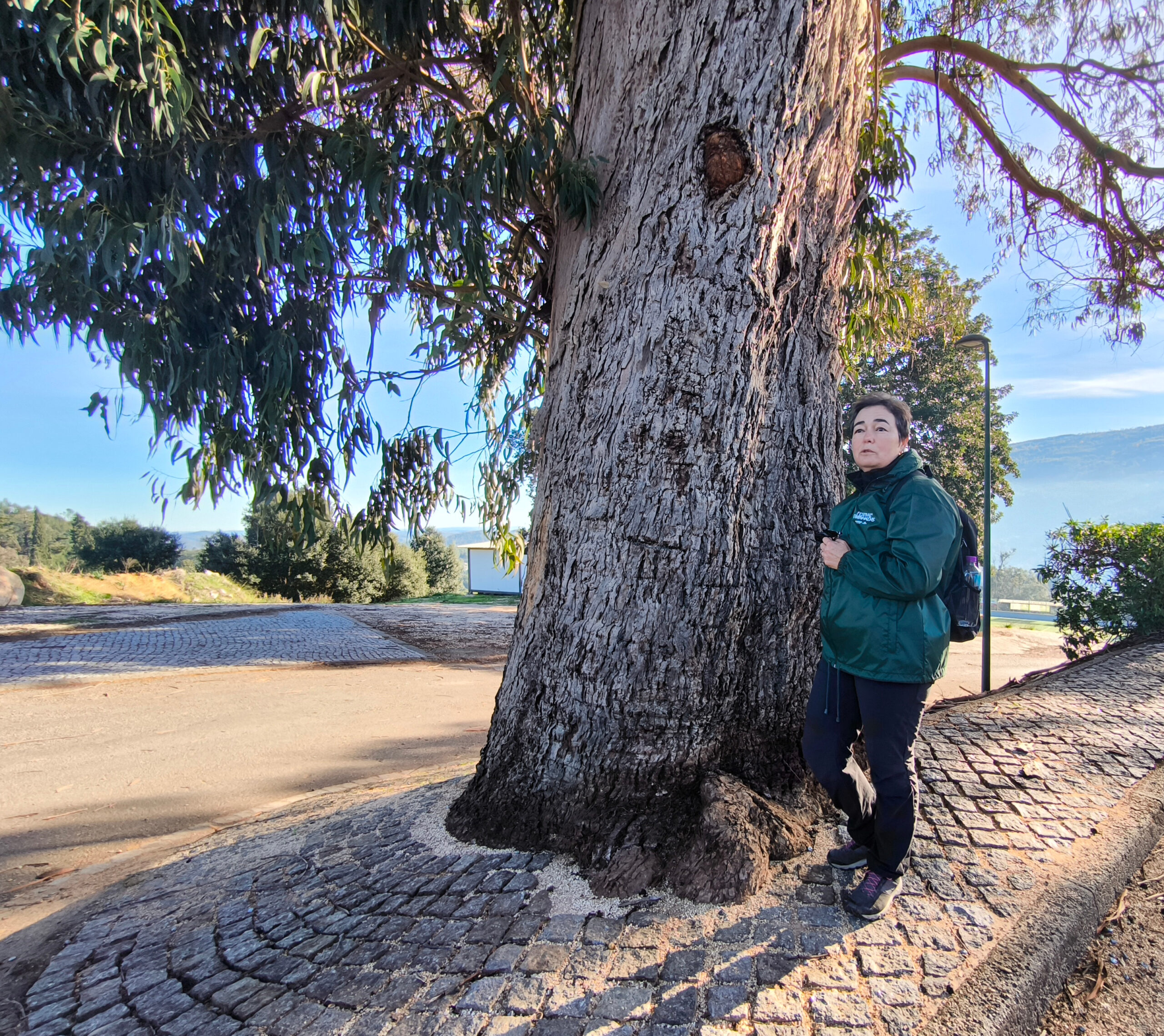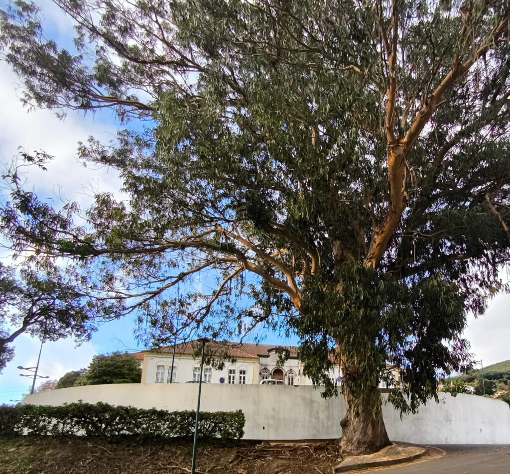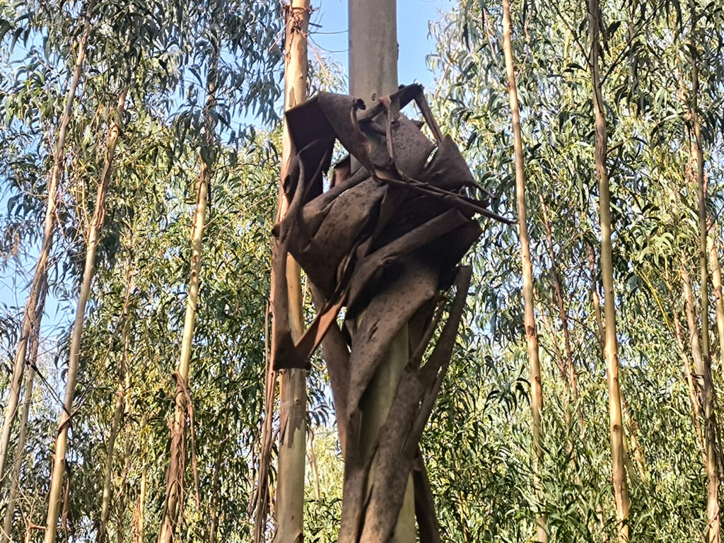 (es) Justo al lado de los alcornoques se alza un gran y solitario eucalipto. Ya lo sé, ya lo sé, su reputación no es la mejor; o mejor dicho, la de quienes establecen plantaciones de eucalipto a gran escala, desplazando así especies autóctonas y destruyendo ecosistemas enteros. Pero ver un eucalipto tan único y enorme es realmente impresionante. En los alrededores de Monchique, los eucaliptos representan aproximadamente el 30% de la superficie forestal. Como parte de las iniciativas de reforestación del municipio, se está intentando replantar, donde se puede, especies autóctonas y así reducir estas áreas.