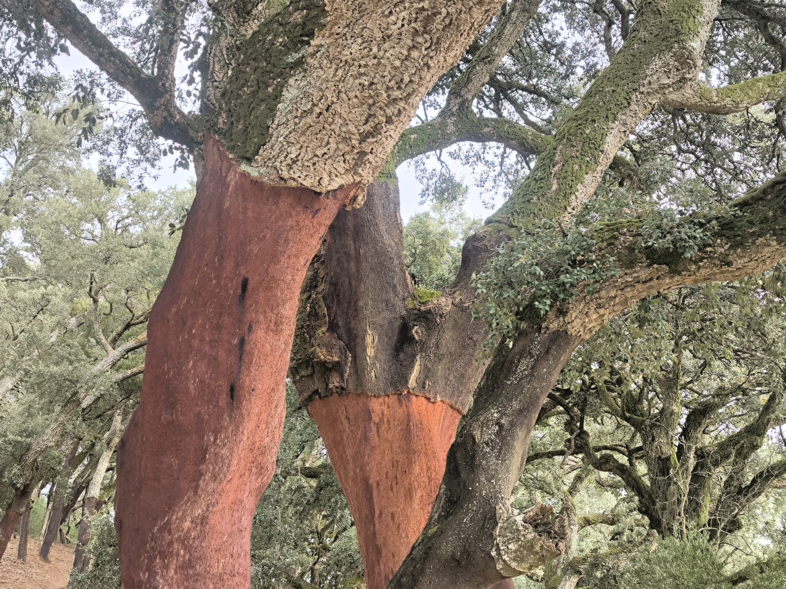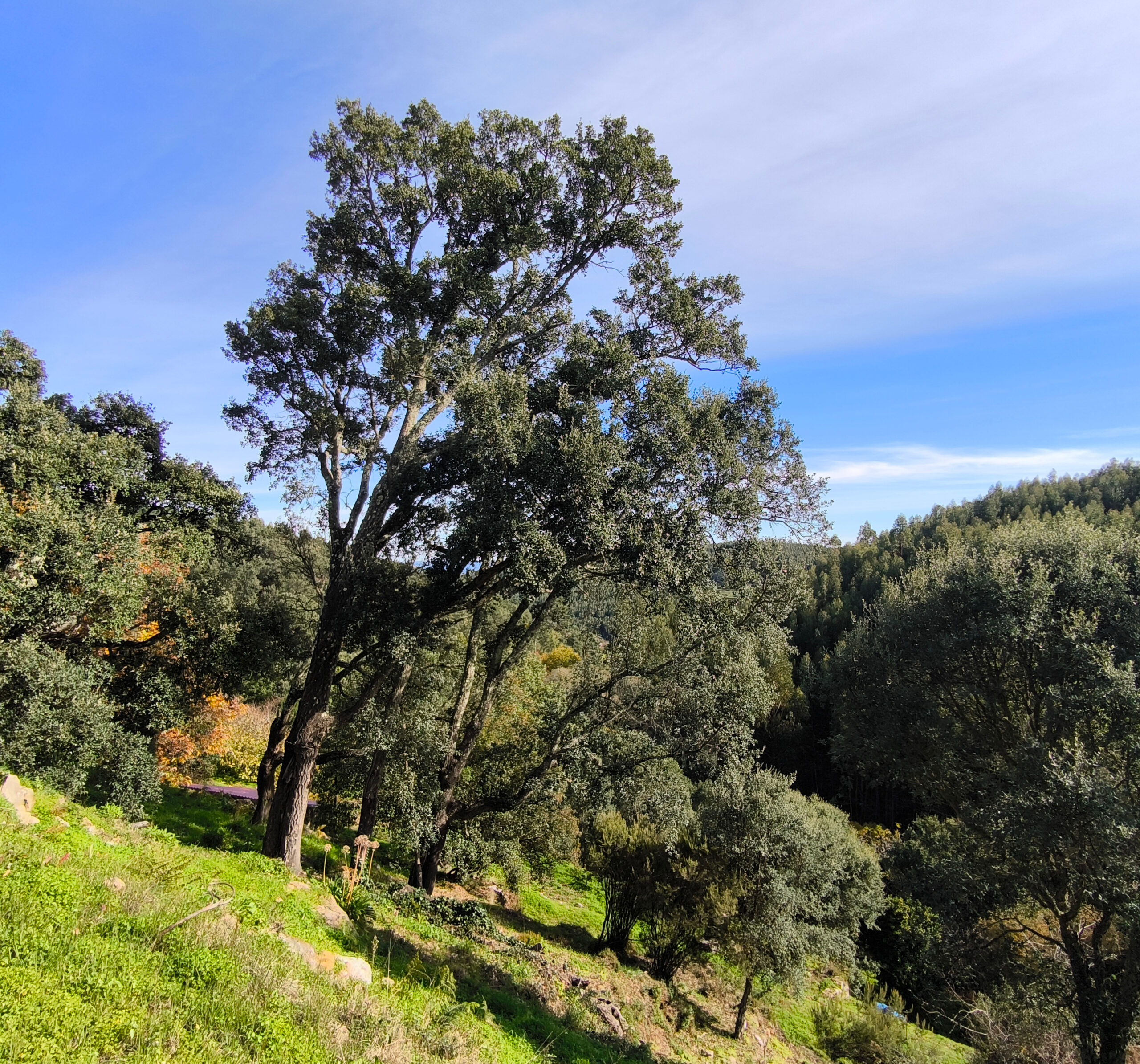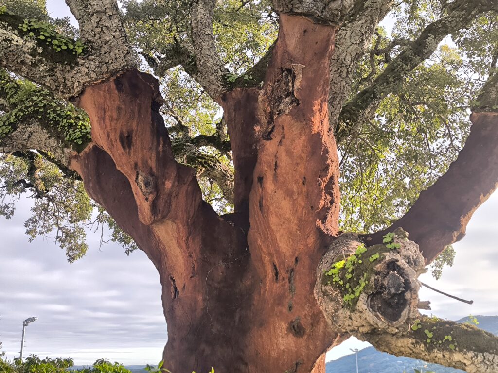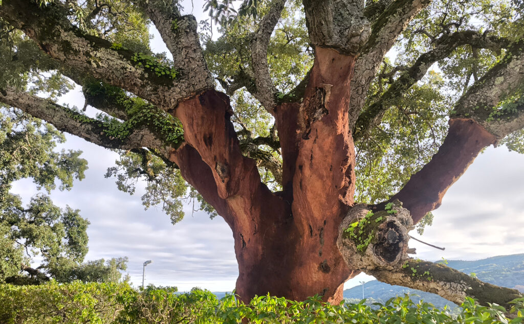 (es) No están en la lista de árboles singuares, pero siempre me impresionan, los alcornoques que también crecen aquí en el Algarve, en buena vecindad con nogales y castaños. Aprendí que su capa de corcho es más porosa que la de los alcornoques del Alentejo, lo que reduce ligeramente su valor de mercado, ya que el corcho es valioso cuando tiene la mayor densidad posible. También aprendí que el alcornoque es relativamente resistente a los incendios forestales (y los alcornoques de aquí podrían contarnos algo al respecto, si pudieran, porque en 2018 la Serra de Monchique sufrió lo que entonces era el mayor incendio forestal de Europa, quemando aproximadamente 27.000 hectáreas), siempre que no hayan sido descortezados recientemente. El estrés asociado a esto los hace vulnerables, y si la corteza recién formada no tiene al menos dos o tre años, aumenta considerablemente la probabilidad de que el árbol muere en un incendio forestal. De lo contrario, pierde sus hojas, pero las regenera al cabo de un tiempo. Por cierto, los alcornoques afectados por el incendio forestal se dejan tranquilos durante dos años. Sólo entonces se eliminará la corteza quemada y un nuevo cíclo puede comenzar.