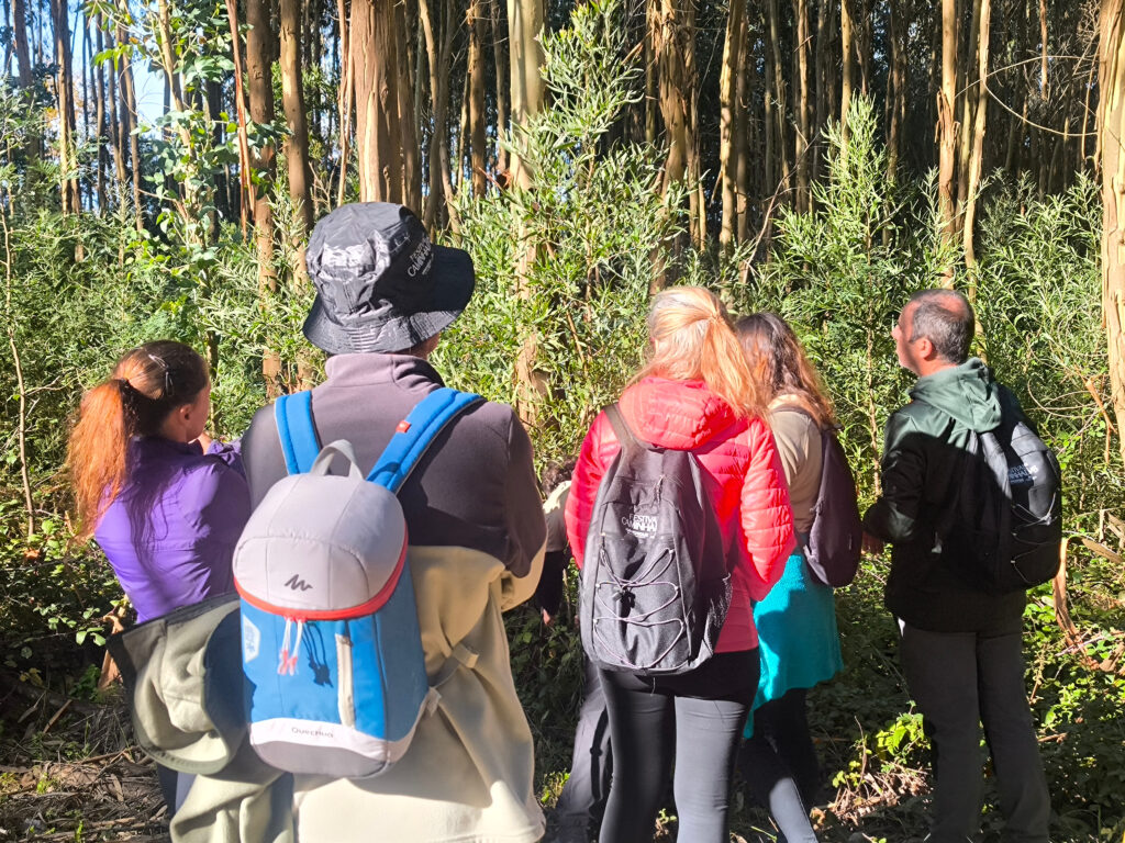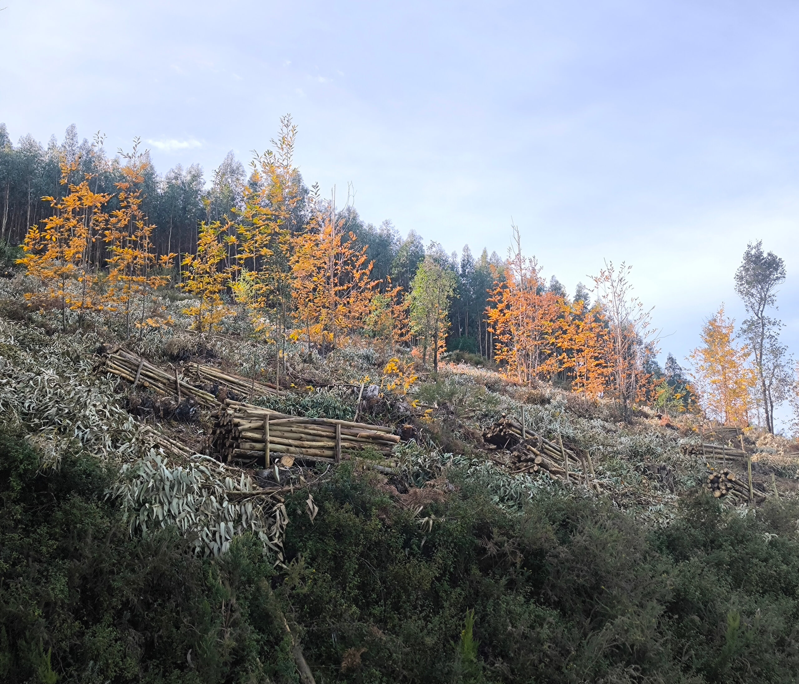 (es) En varios puntos de nuestra ruta, pudimos observar los esfuerzos de reforestación realizados tras los incendios forestales de los ultimos años. En los terrenos públicos, se está intentando sustituir los eucaliptos por bosque mixto nativo. Esta es una iniciativa muy loable; sin embargo, dado que las áreas más extensas son de propiedad privada, un cambio real solo será posible si la población local también modifica su relación con el bosque y se adapta a las exigencias del cambio climático en el futuro.