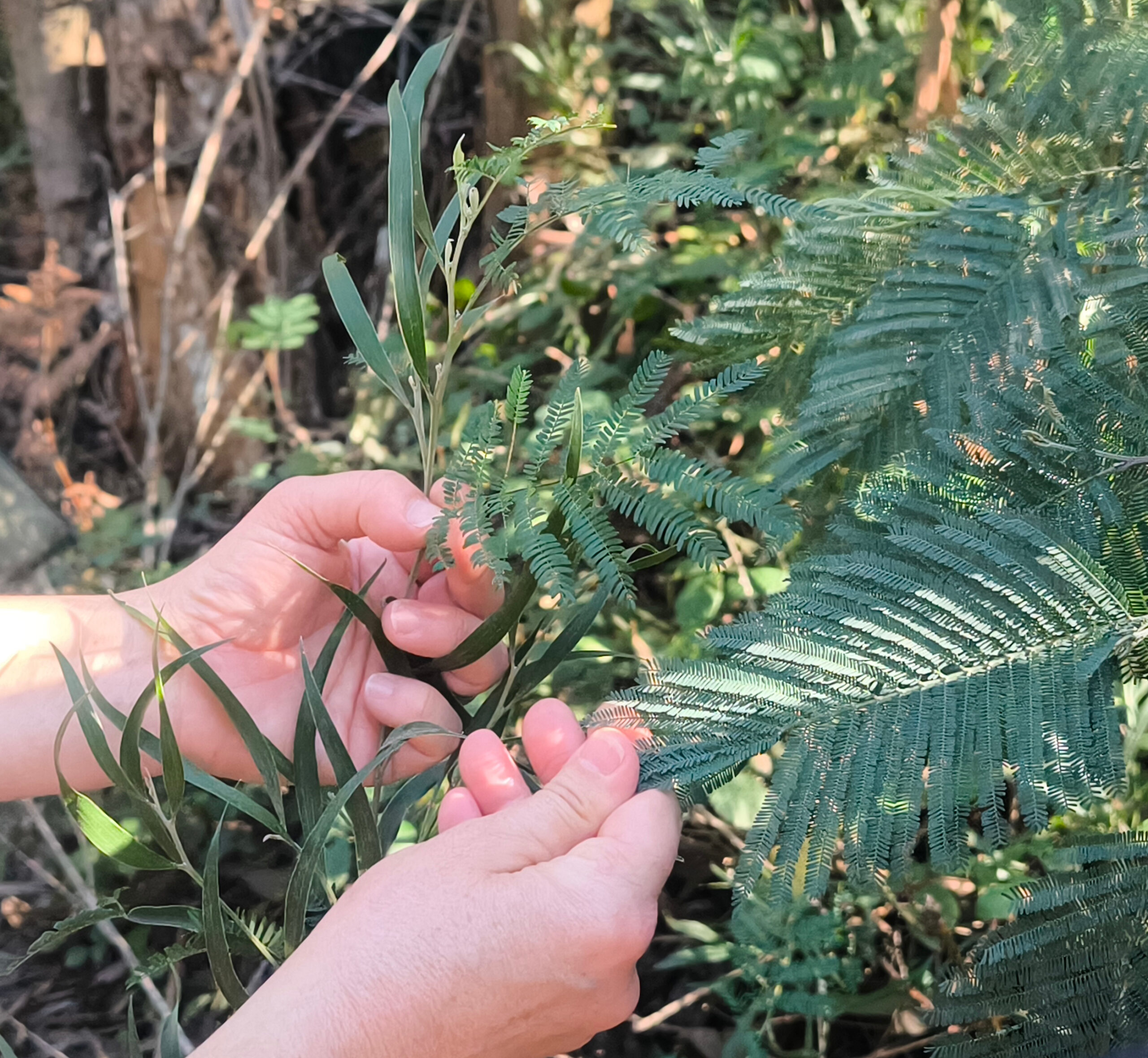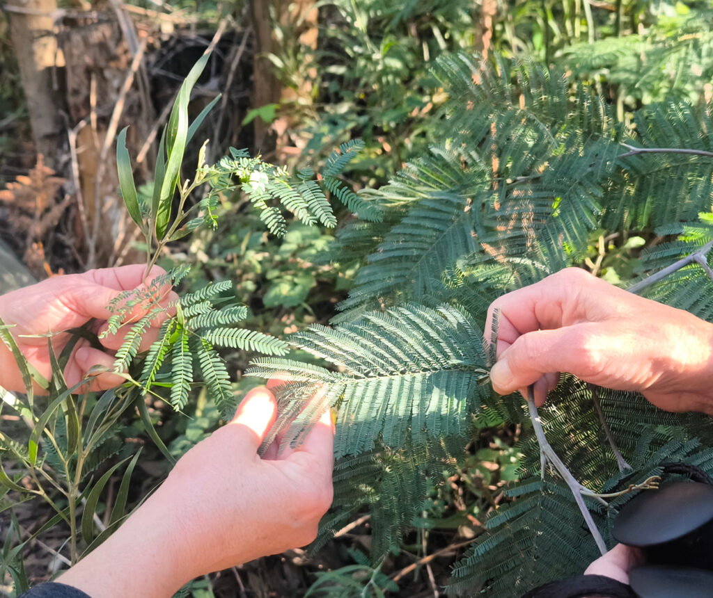 (de) Auf dem Weg zum Barranco dos Pisões kamen wir durch eine Eukalyptusplantage und trafen dort auf eine der invasiven Pflanzenarten die ganz oben auf der Liste stehen: die Akazie, sowohl die Silberakazie oder Falsche Mimose, als auch die Schwarzholzakazie. Wir haben uns beide Arten angeschaut. Im Unterschied zu den meisten anderen Akazien bildet die Schwarzholz-Akazie ihre gefiederten Jugendblätter über einen relativ langen Zeitraum. Man kann daher recht lange an den Pflanzen gleichzeitig Jugendblätter, Phyllodien und oft auch Zwischenformen zeigen. Unter günstigen Bedingungen wird sie sich dann zu einem Baum von 6 bis 30 Meter Höhe, vielleicht sogar bis zu 45 Meter Höhe entwickeln. Diese große Höhe erreicht sie aber nur im Nordosten Tasmaniens in saisonal sumpfigen Wäldern, wo sie die dominante Baumart ist. Von einer verzärtelten „Mimose“ kann man da nicht mehr sprechen.