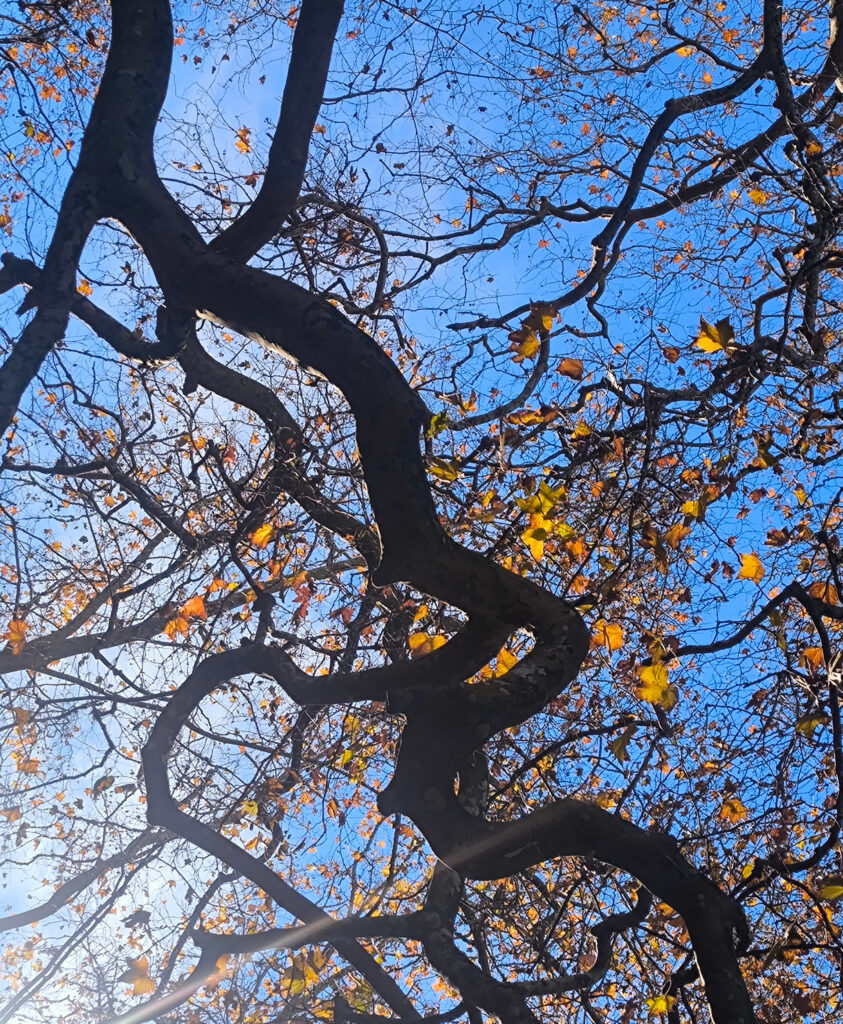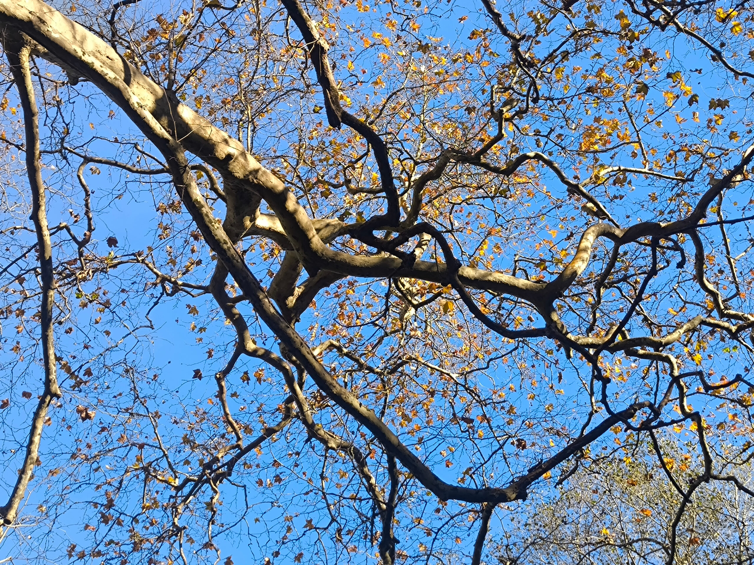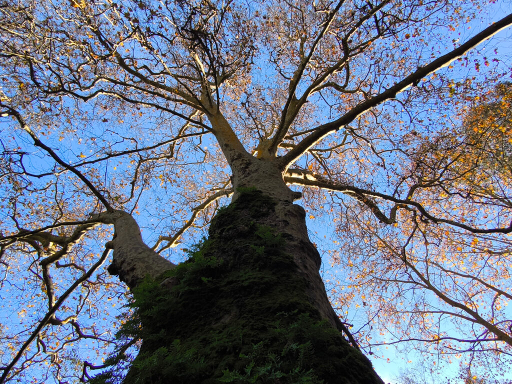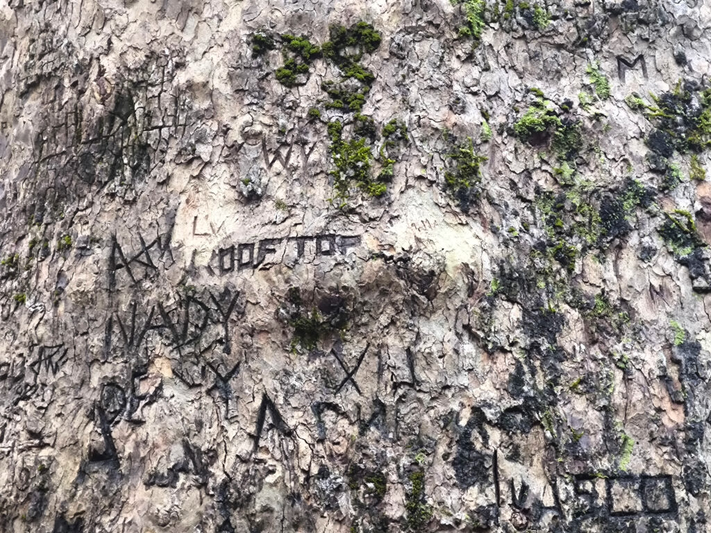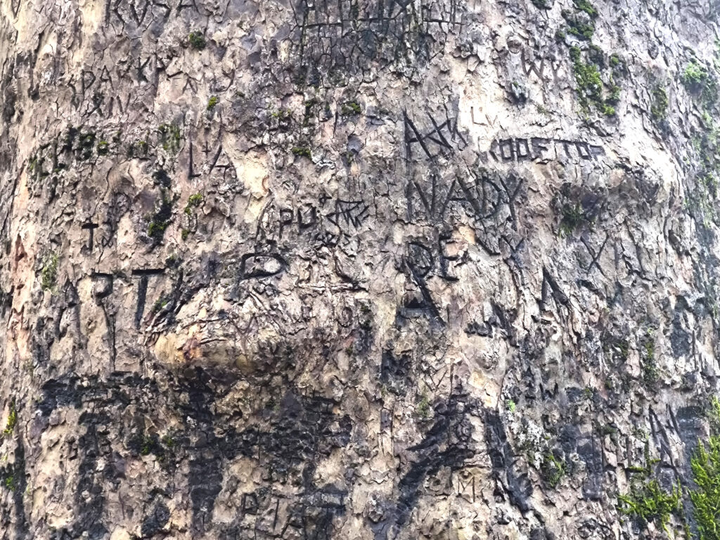 (de) Im Barranco dos Pisões wartete ein anderer bemerkenswerter Baum auf uns: eine Platane mit geschätzten 40 m Höhe und einem ebenso beachtlichen Stammumfang. Diese Platane wurde gepflanzt, als der Picknickplatz eingerichtet wurde und so ist es nicht verwunderlich, wenn auch nicht erklärlich, dass einige generationen von Picknickfreund:innen dort ihre Initialen hinterlassen haben. Der Baum hat es mit Langmut über sich ergehen lassen. Keine Ahnung, was ER sich dabei gedacht hat, wenn wieder mal jemand mit einem Messerchen zum Apfelschälen oder Chorizoschneiden seinen Namen in die Rinde geritzt hat, ganz offensichtlich keinen Gedanken daran verschwendent, was das für das andere lebende Wesen bedeuten kann. Diese vermaledeite Angewohnheit sich irgendwo verewigen zu wollen, egal ob auf Stein, auf Baum oder an der Hauswand. Das muss zutiefst in der Natur einiger Menschen verankert sein.