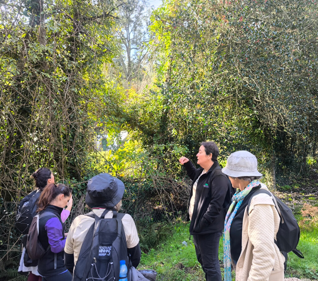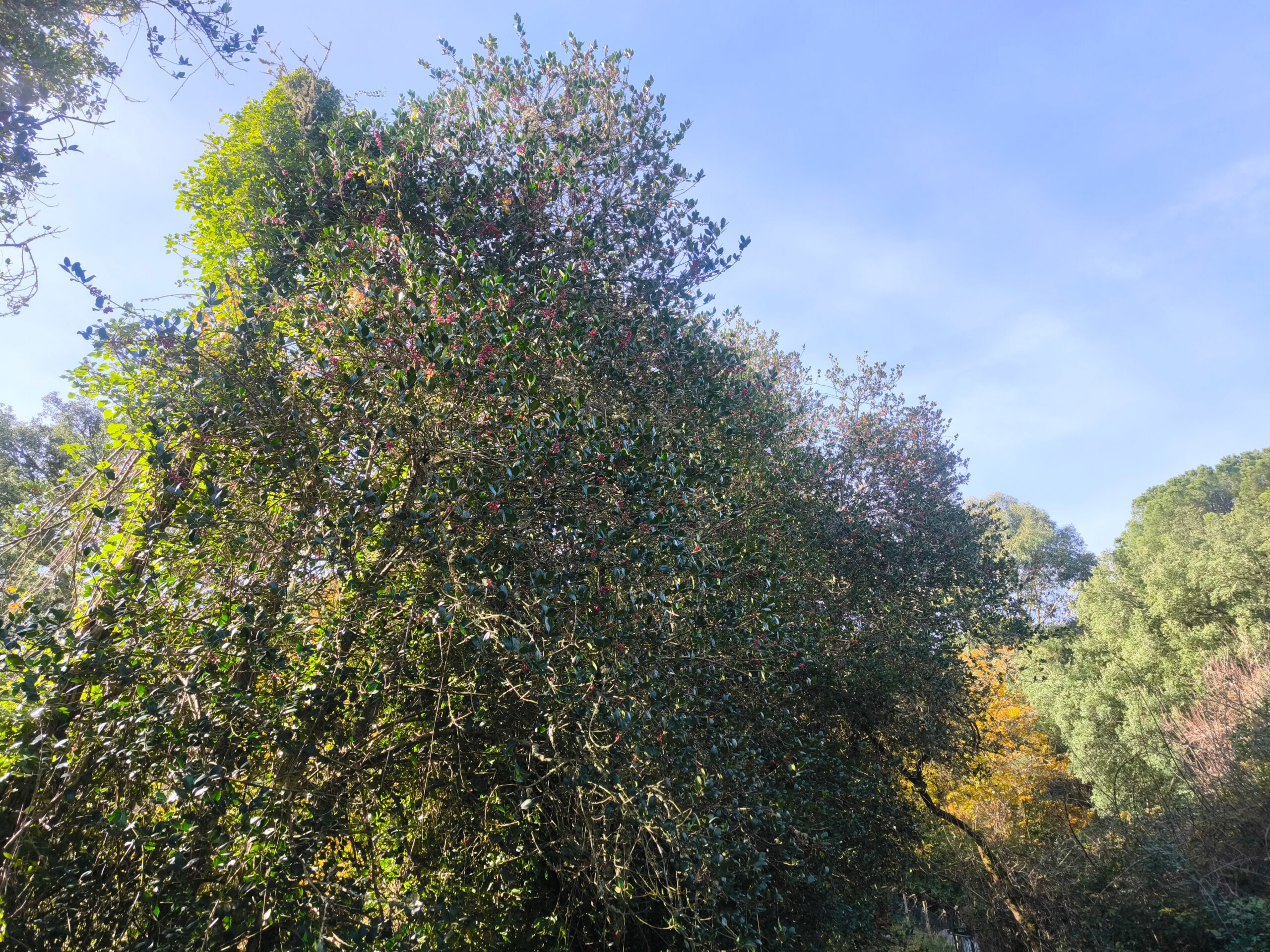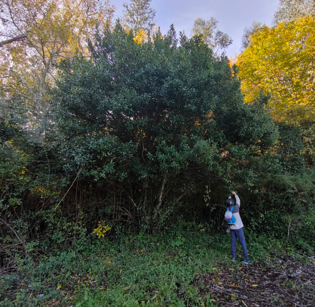 (es) La siguiente parada de nuestra caminata fue un deposito de agua que data de 1952. No por su interés arquitectónico, sino porque su construcción propició la plantación de varios acebos, que desde entonces han alcanzado un tamaño considerable. Los acebos son una de las tres especies arbóreas protegidas de Portugal, junto con los alcornoques y los olivos, y son extremadamente raros. ¡¡¡ Así que no se toca, solo se mira!!!!!