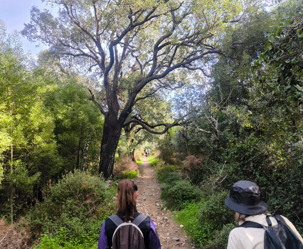 (de) Fast zurück im Städtchen, am oberen Rand, gleich neben dem, was einmal ein Franziskanerkloster war und heute nur noch Ruine ist, stehen drei Korkeichenexemplare, wie die zu Beginn der Wanderung, ebenfalls von beeindruckender Größe.