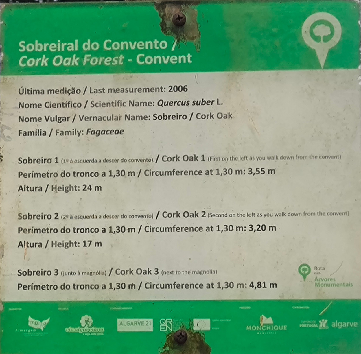 (es) Y cierra la ruta una gran magnolia. Es hija de aquel ejemplar que estaba situado junto al Convento de Nª Srª do Desterro y del que se piesa que fue traído de la India por Dom Pero da Silva, Vice-Rey de India y fundador del convento en uno de sus viajes. Este árbol fue clasificado como de interés público el 8 de mayo de 1947, tenía un diámetro de copa de 30 m, una circunferencia del tronco (a una altura de 1,30 m) de 5,58 metros y una altura de 27 metros, con una edad estimada de más de 200 años y era el magnolio más grande de Europa. La primera referencia escrita a este ejemplar (de la que tiene conocimiento la autoridad local) data de 1915 en el Boletín Trimestral de la Asociación de Protección de Árboles, refiriéndose a él como „la magnífica Magnolia de Monchique que representa el mejor árbol de su tipo que conocemos hasta ahora“.