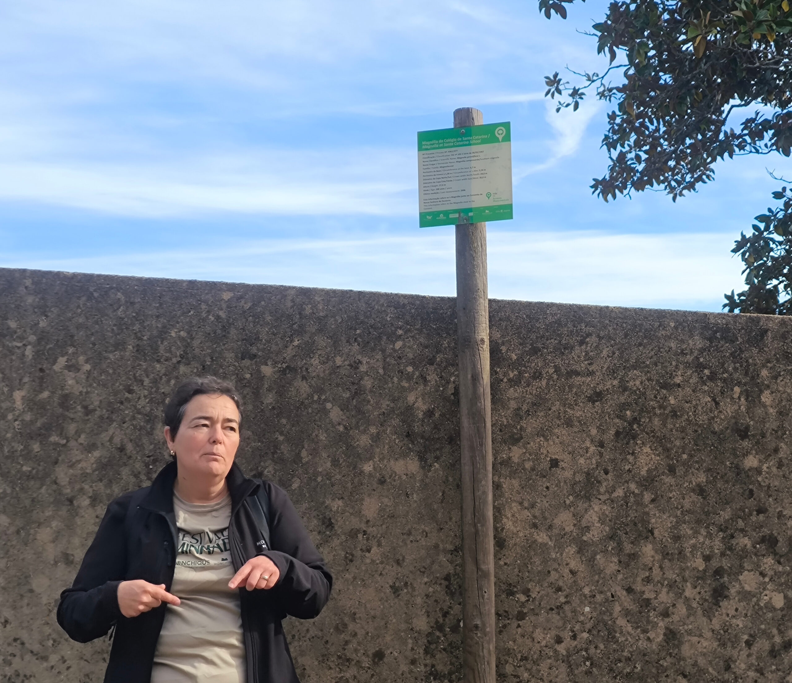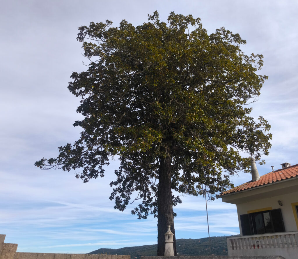 (es) Ein großer Magnolienbaum steht am Ende unserer Wanderung. Er stammt von dem Exemplar ab, das einst neben dem Kloster Unserer Lieben Frau vom Exil stand und vermutlich von Dom Pero da Silva, dem Vizekönig von Indien und Gründer des Klosters, auf einer seiner Reisen aus Indien mitgebracht wurde. Dieser Baum wurde am 8. Mai 1947 als Baum von öffentlichem Interesse eingestuft. Mit einem Kronendurchmesser von 30 Metern, einem Stammumfang von 5,58 Metern (in 1,30 Metern Höhe) und einer Höhe von 27 Metern sowie einem geschätzten Alter von über 200 Jahren war er die größte Magnolie Europas. Die erste schriftliche Erwähnung dieses Exemplars (die den lokalen Behörden bekannt war) stammt aus dem Jahr 1915 im Vierteljahresbericht der Baumschutzvereinigung. Dort wird er als „die prächtige Magnolie von Monchique, die den schönsten Baum ihrer Art darstellt, den wir bis heute kennen“ bezeichnet.