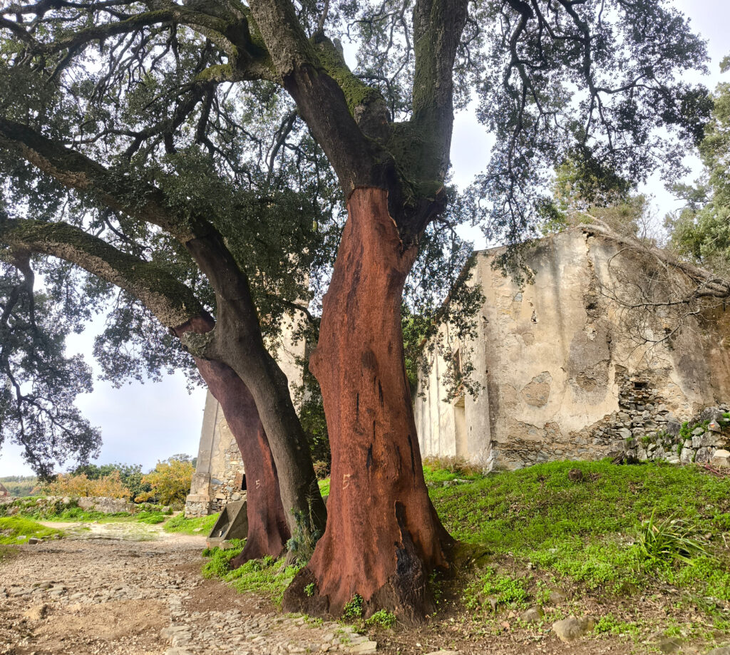 (es) Casi de vuelta al pueblo, en el límite superior, justo al lado de lo que antaño fue un monasterio franciscano y hoy sólo es una ruina, se alzan tres ejemplares de alcornoque, como los del principio de la caminata, también de un tamaño impresionante.