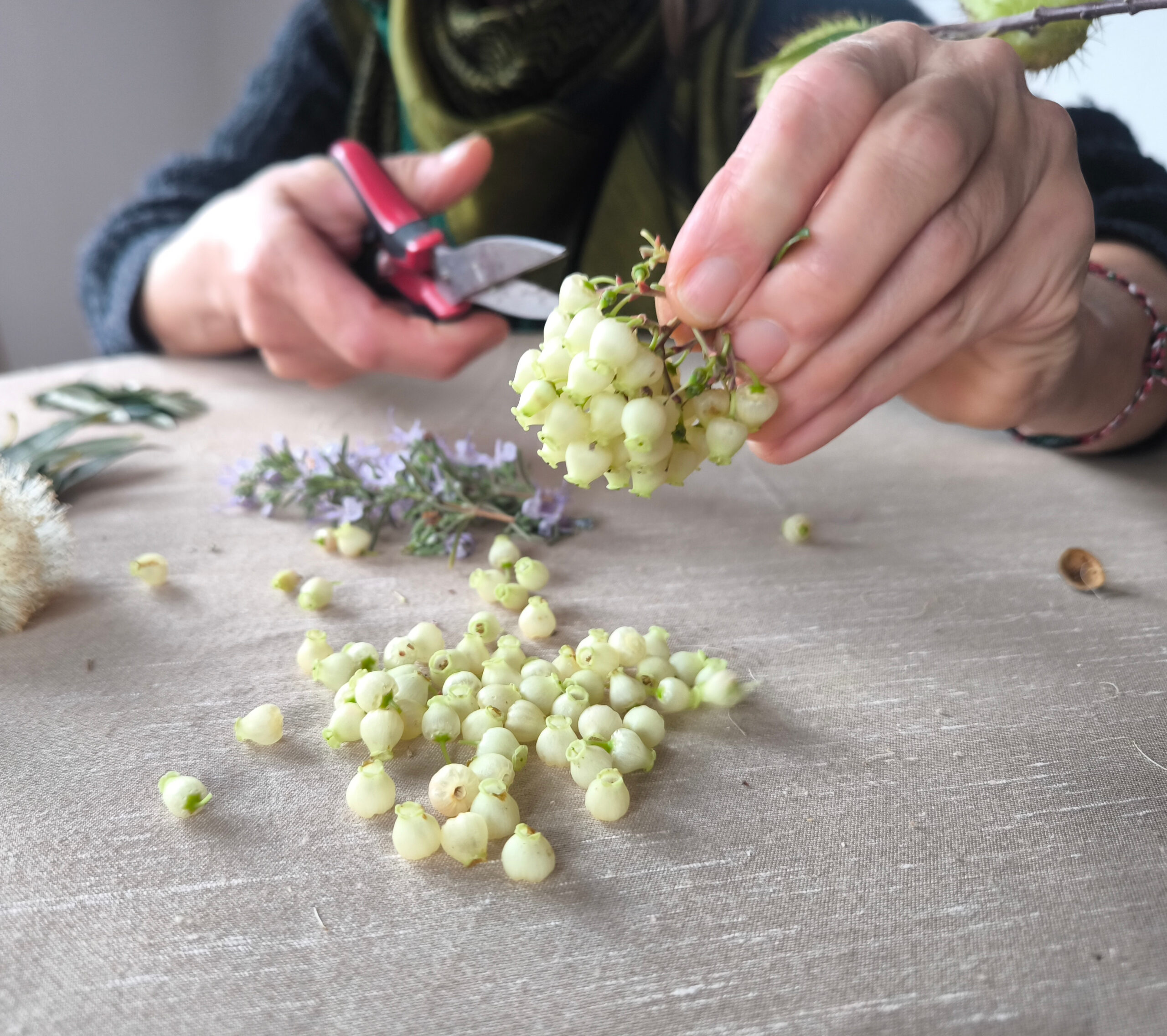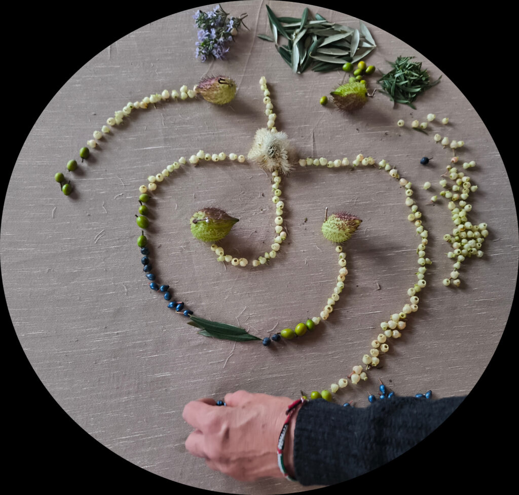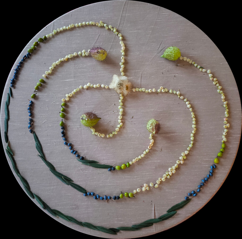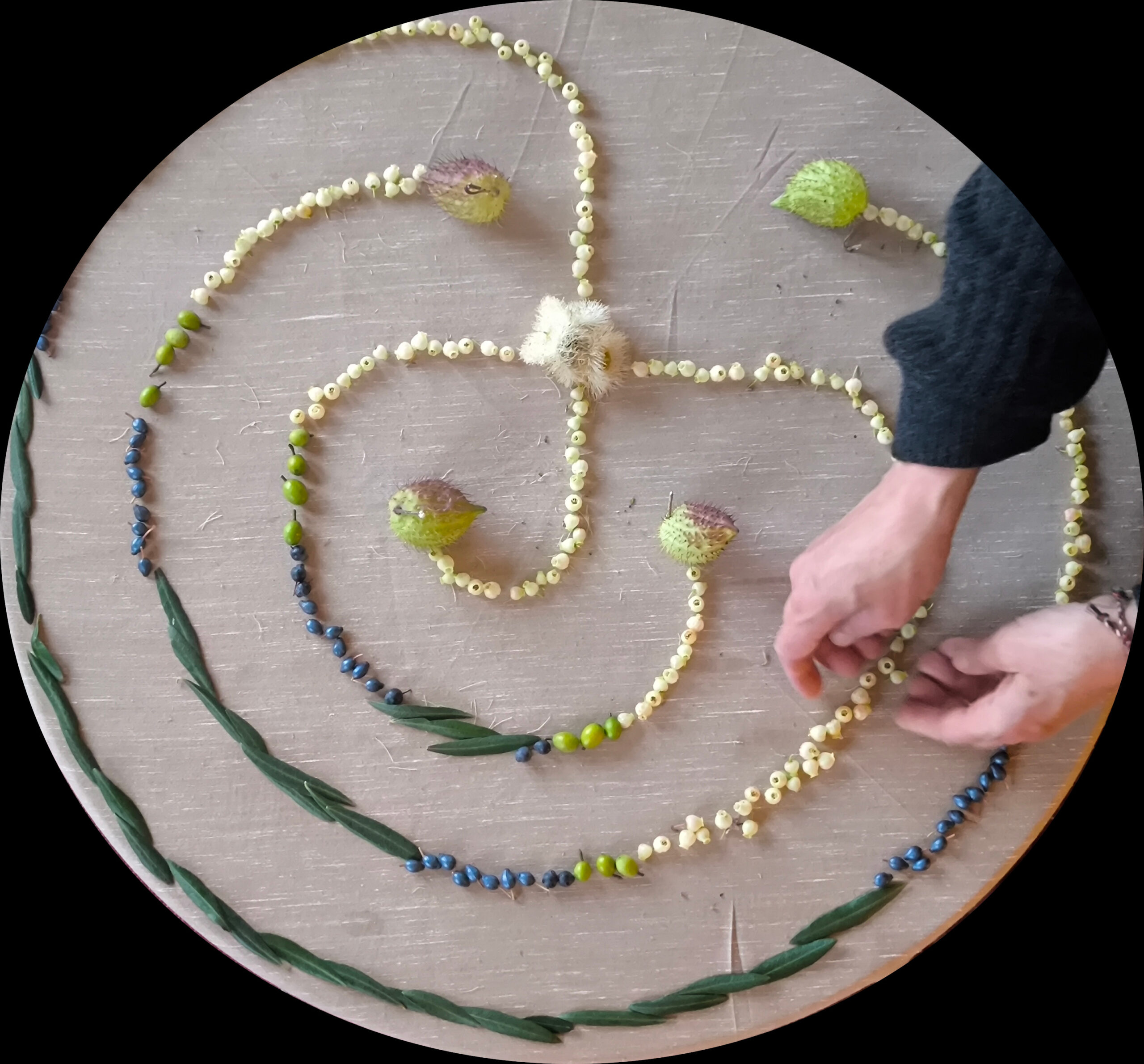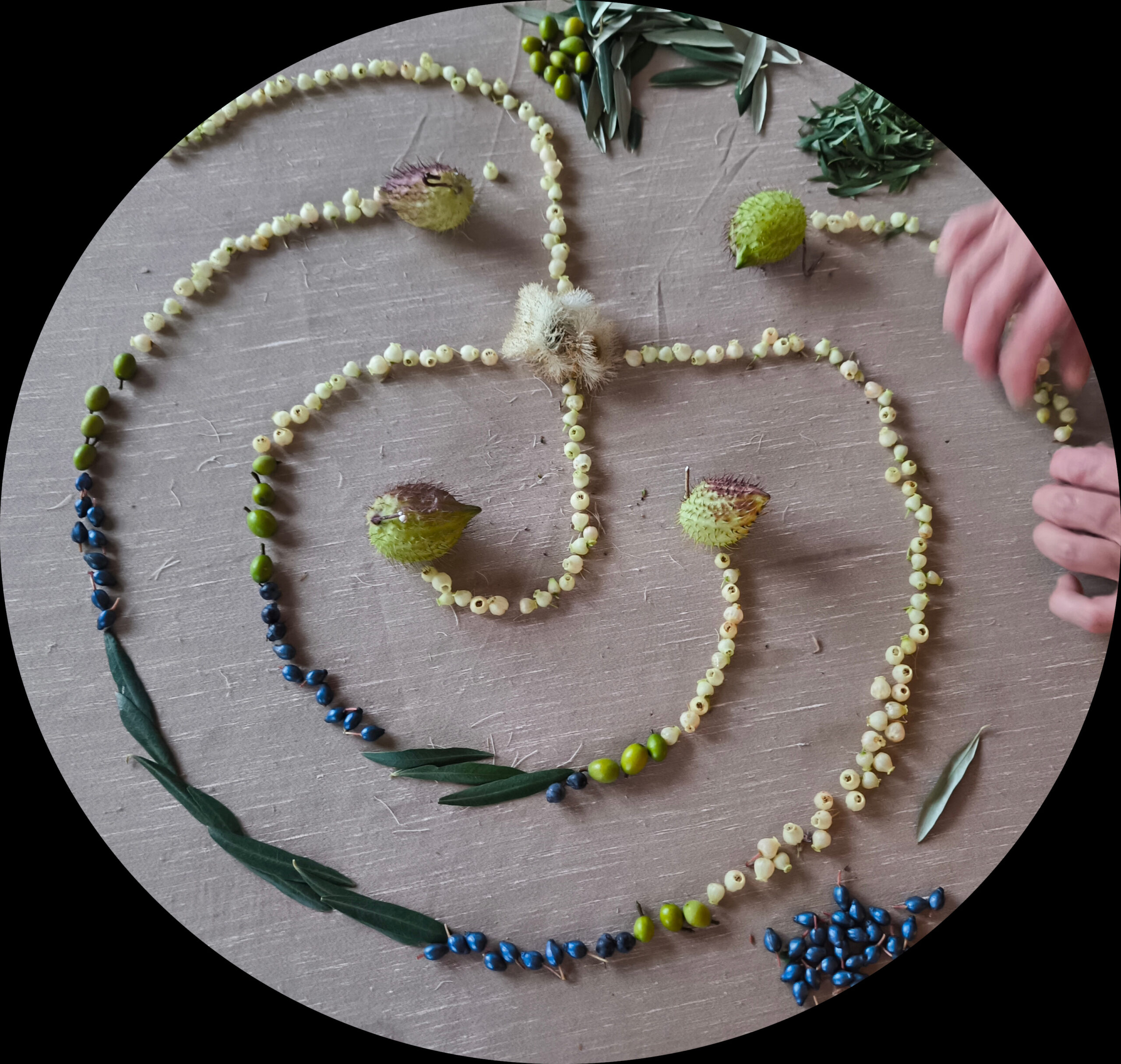 Das war DER Moment für das letzte Labyrinth dieses Jahres. Und so hab ich den Strauss mit genau so viel Liebe und Sorgfalt auseinandergenommen, wie ich ihn zusammengesucht habe, und hab die Blüten des Erdbeerbaums vorsichtig abgepfückt, die Blätter vom Eukalyptus und Olivenbaum, die Beeren von den Ästen, von denen ich nicht mal weiss, wie sie heissen, und den Tisch als Mass der Dinge genommen, um mein Material dort so zu plazieren, dass ein kleines einwegiges Labyrinth entsteht.