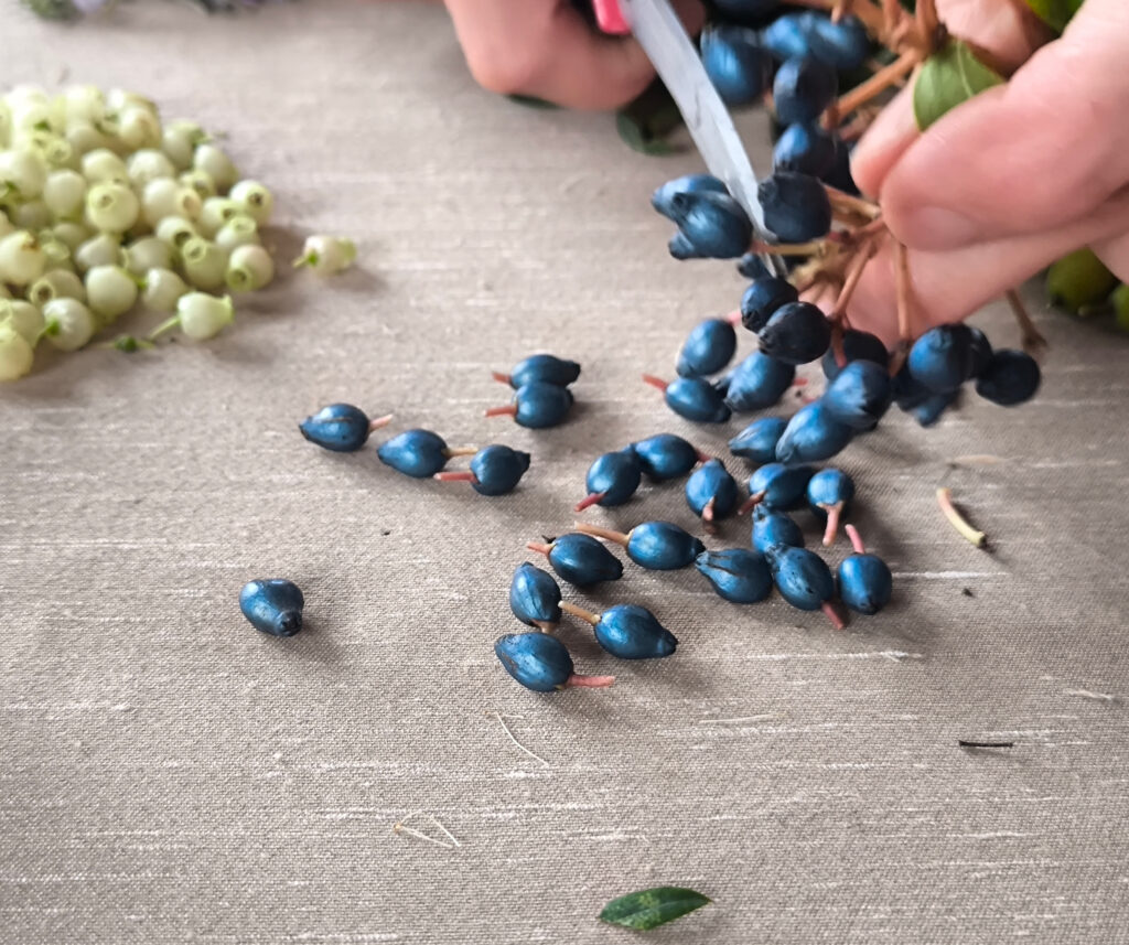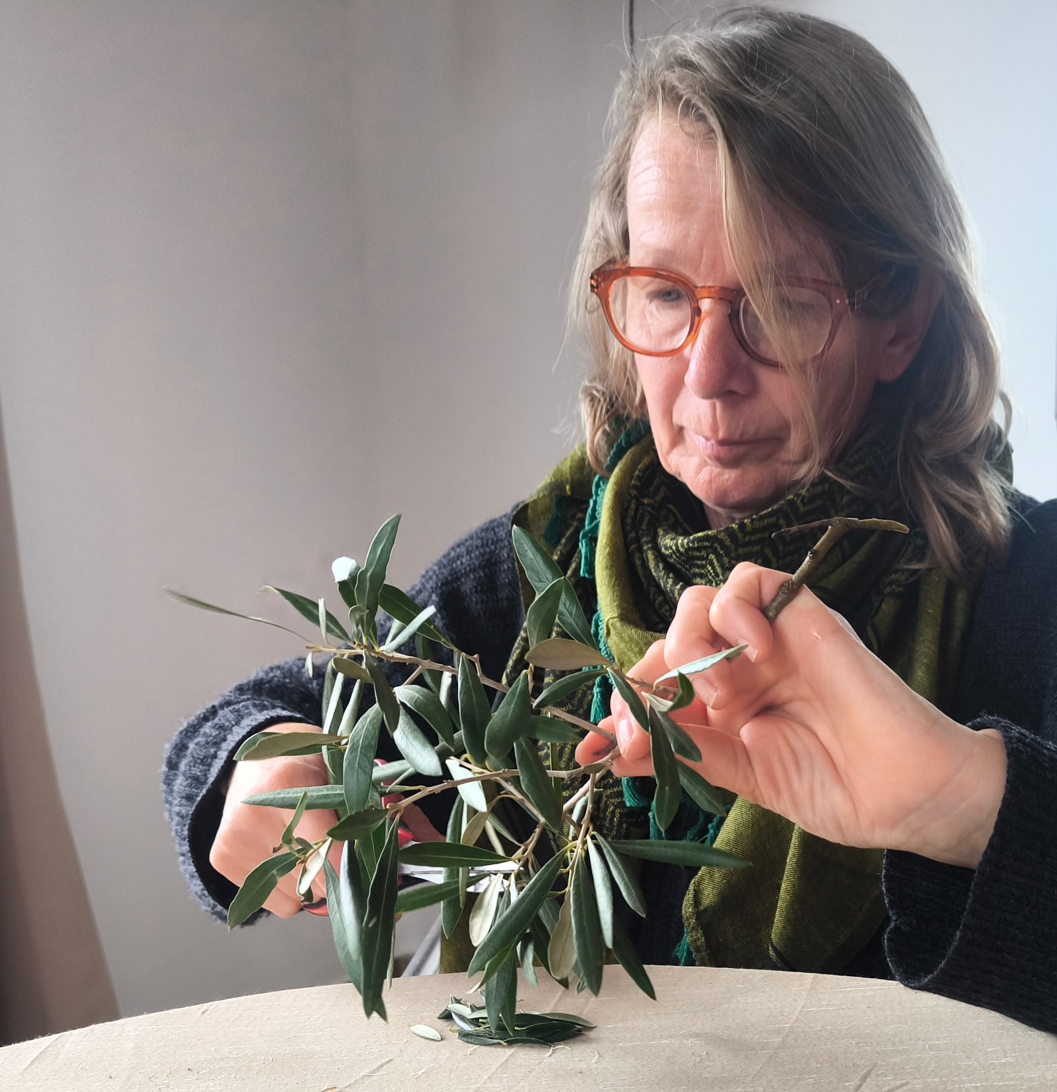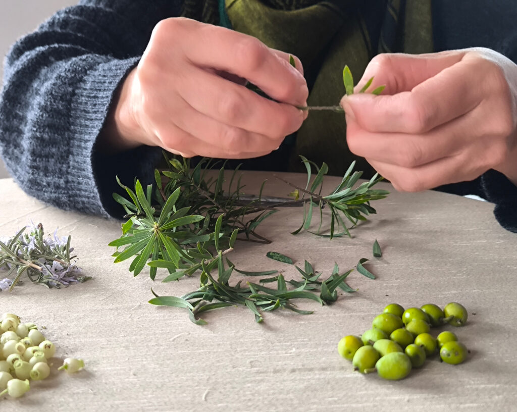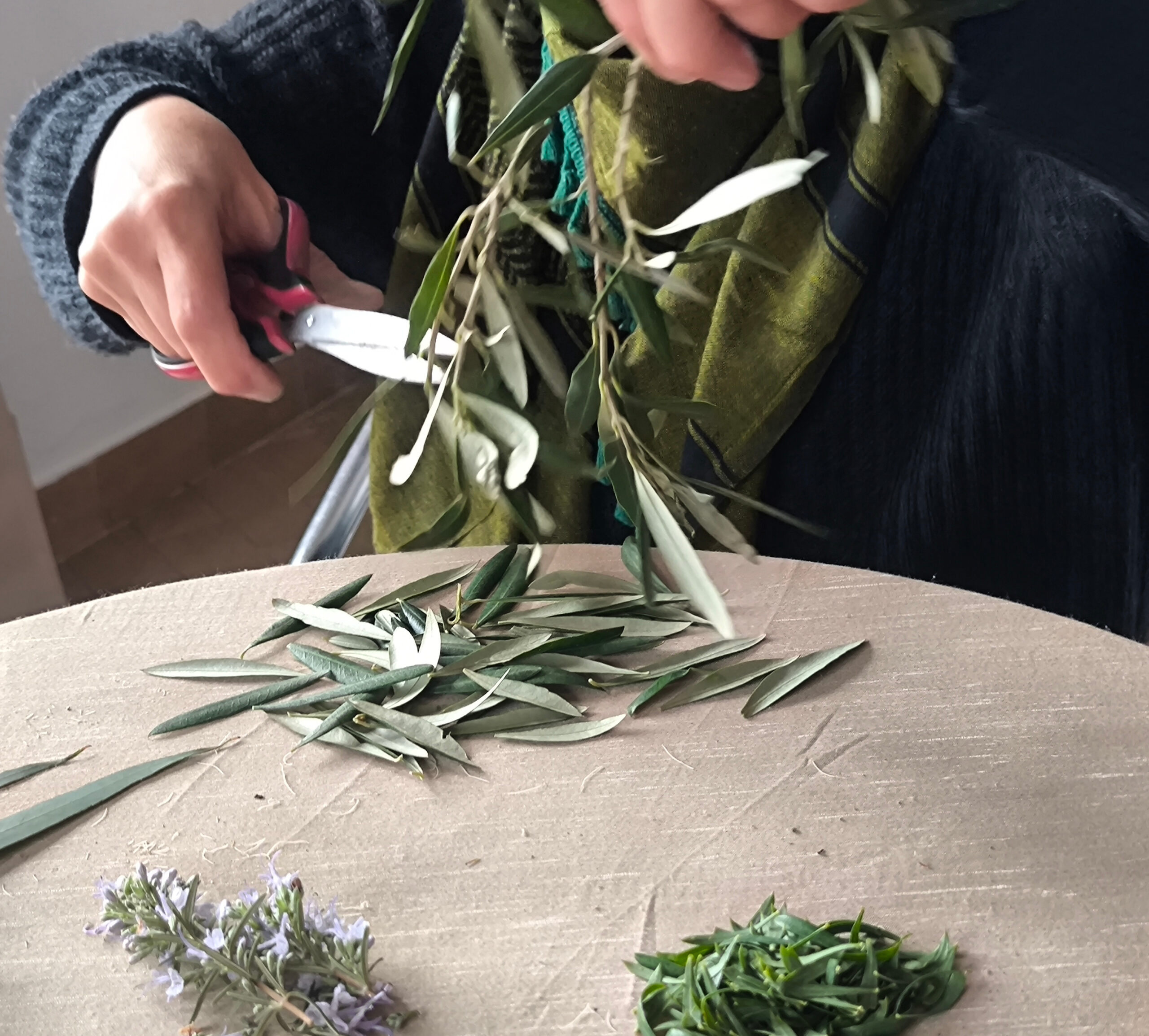 Das war DER Moment für das letzte Labyrinth dieses Jahres. Und so hab ich den Strauss mit genau so viel Liebe und Sorgfalt auseinandergenommen, wie ich ihn zusammengesucht habe, und hab die Blüten des Erdbeerbaums vorsichtig abgepfückt, die Blätter vom Eukalyptus und Olivenbaum, die Beeren von den Ästen, von denen ich nicht mal weiss, wie sie heissen, und den Tisch als Mass der Dinge genommen, um mein Material dort so zu plazieren, dass ein kleines einwegiges Labyrinth entsteht.