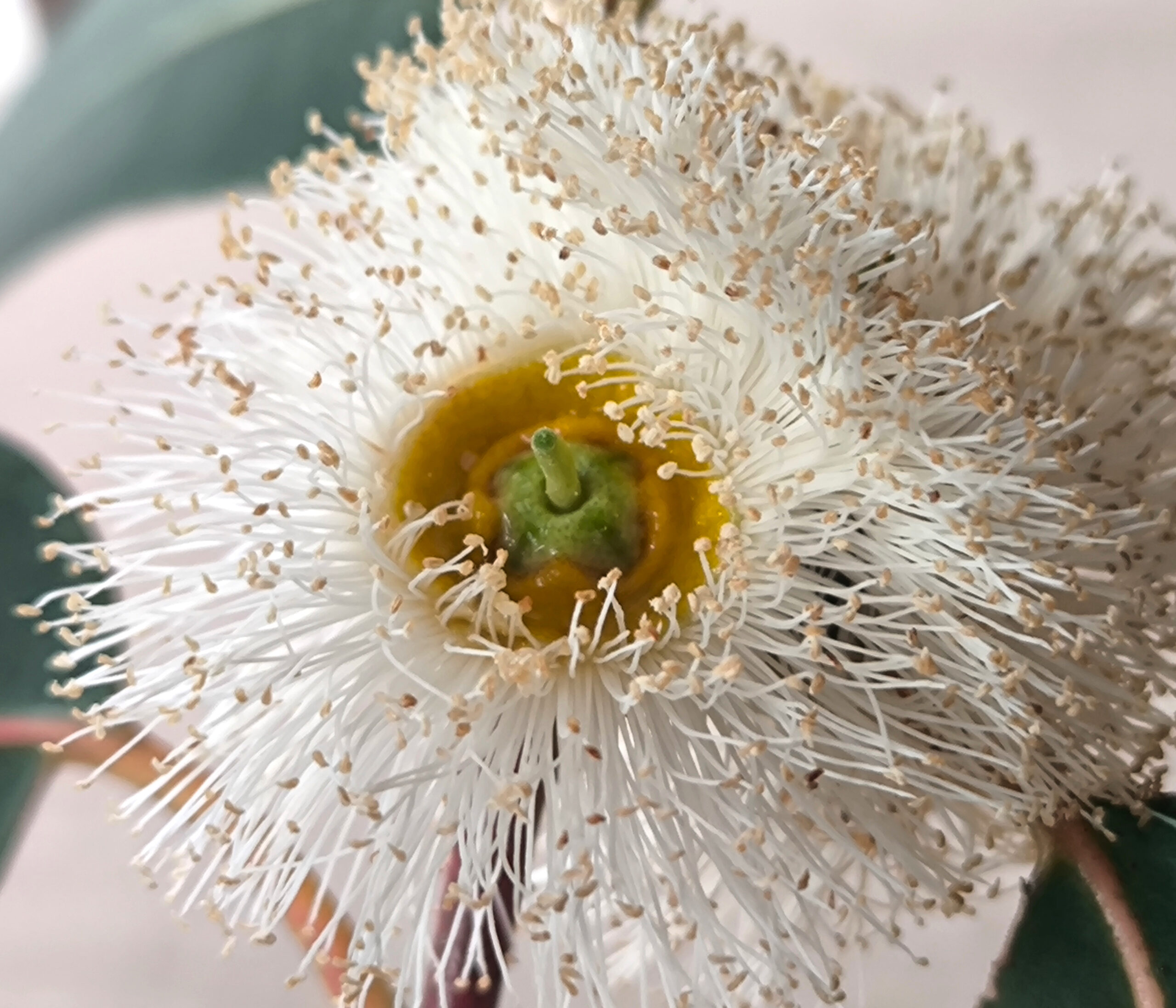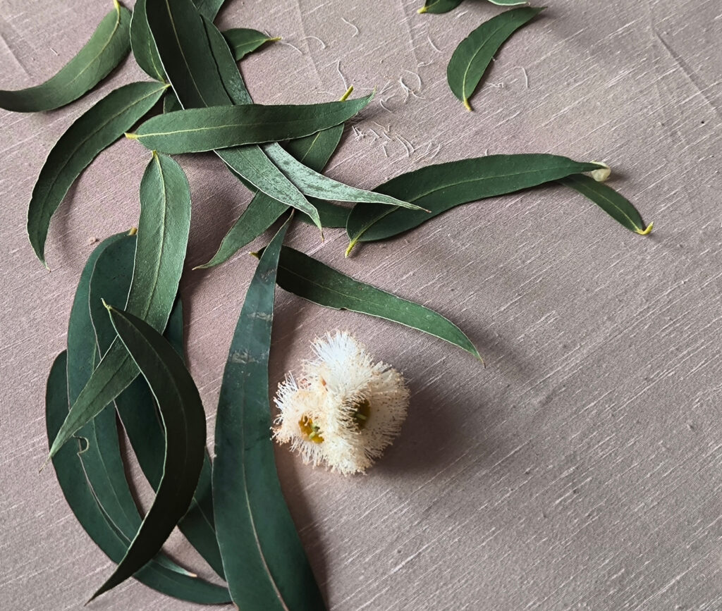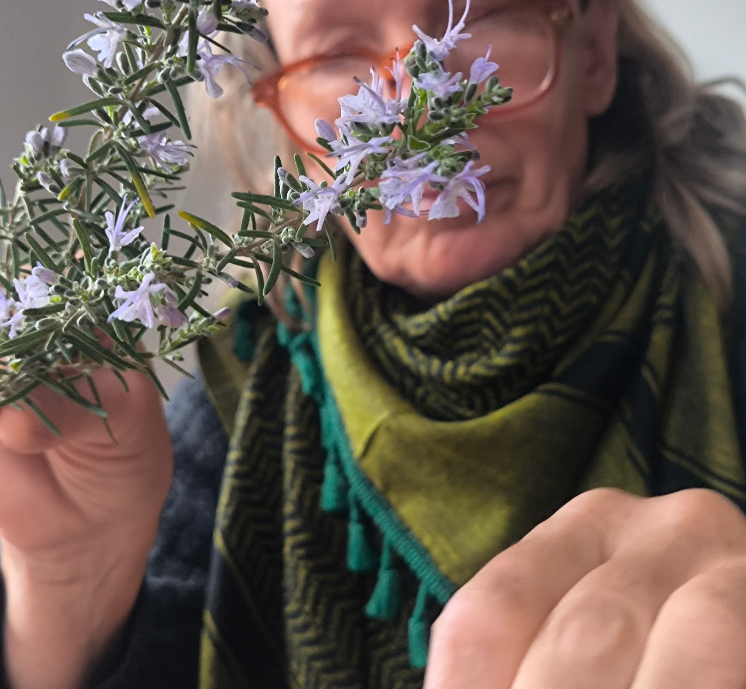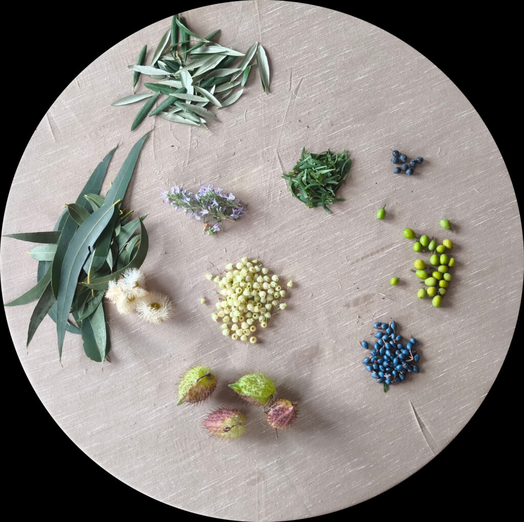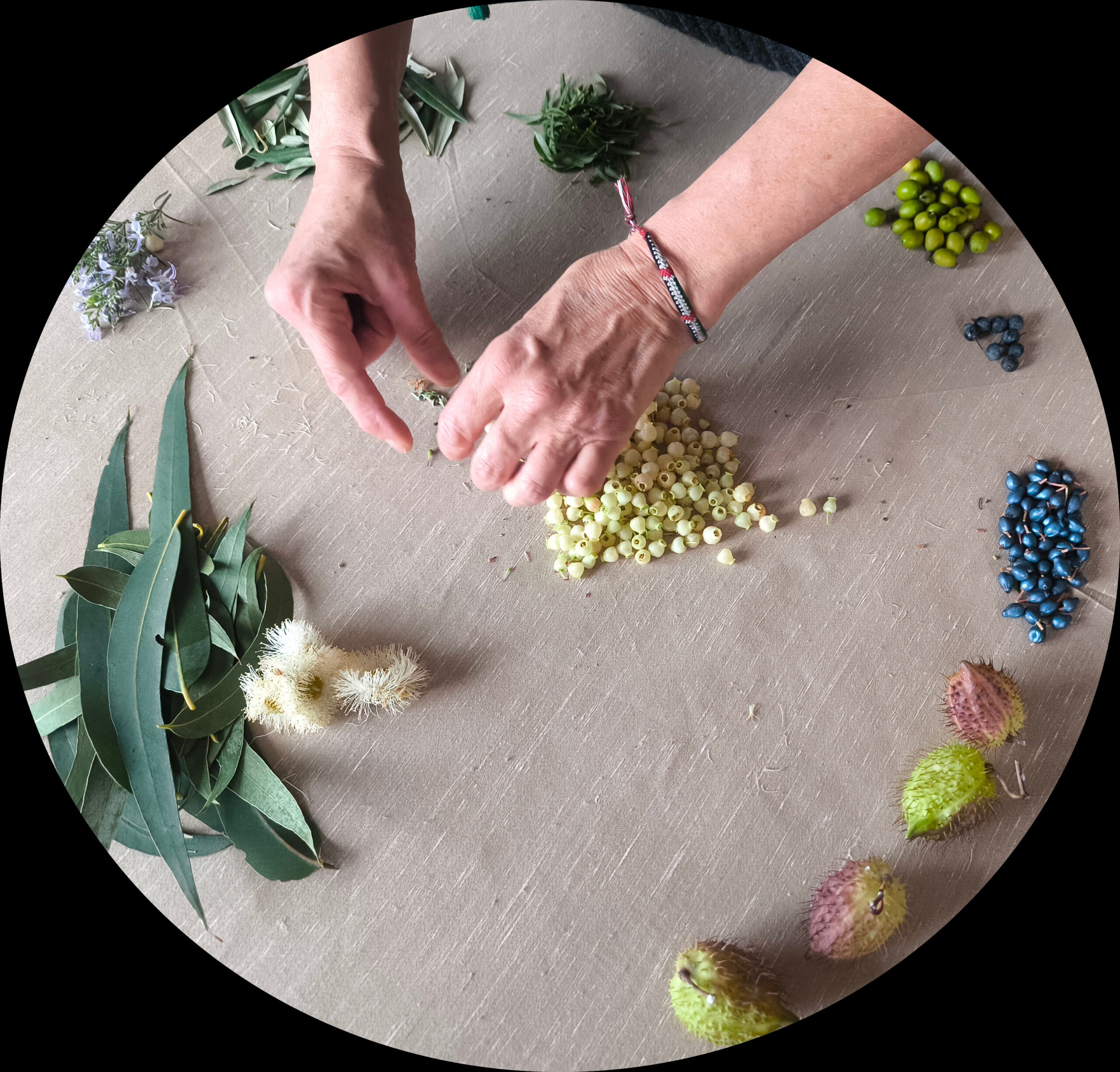 Das war DER Moment für das letzte Labyrinth dieses Jahres. Und so hab ich den Strauss mit genau so viel Liebe und Sorgfalt auseinandergenommen, wie ich ihn zusammengesucht habe, und hab die Blüten des Erdbeerbaums vorsichtig abgepfückt, die Blätter vom Eukalyptus und Olivenbaum, die Beeren von den Ästen, von denen ich nicht mal weiss, wie sie heissen, und den Tisch als Mass der Dinge genommen, um mein Material dort so zu plazieren, dass ein kleines einwegiges Labyrinth entsteht.