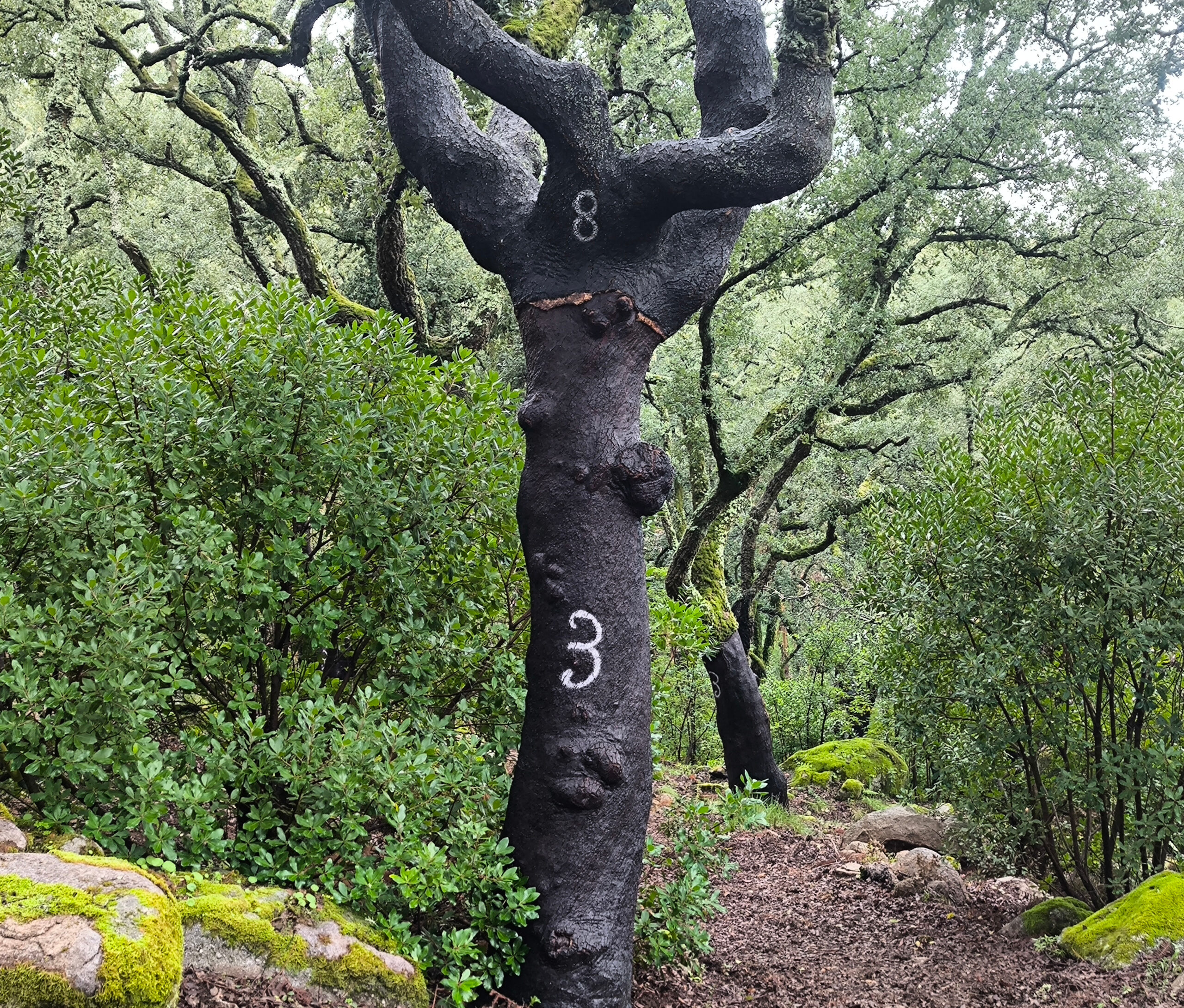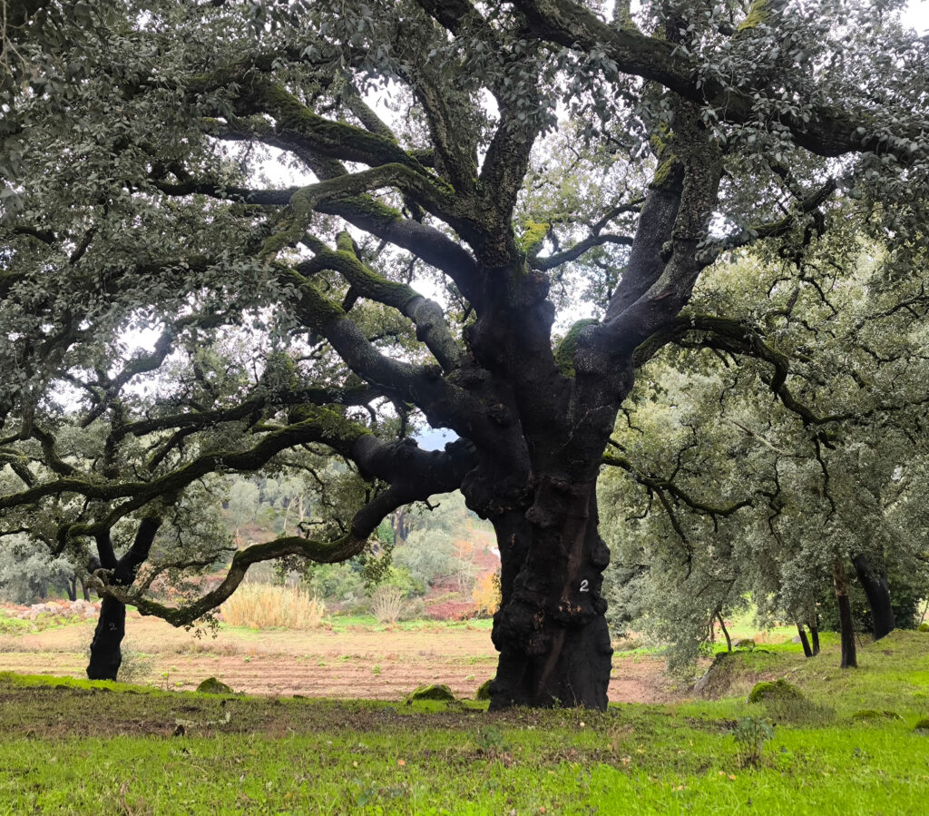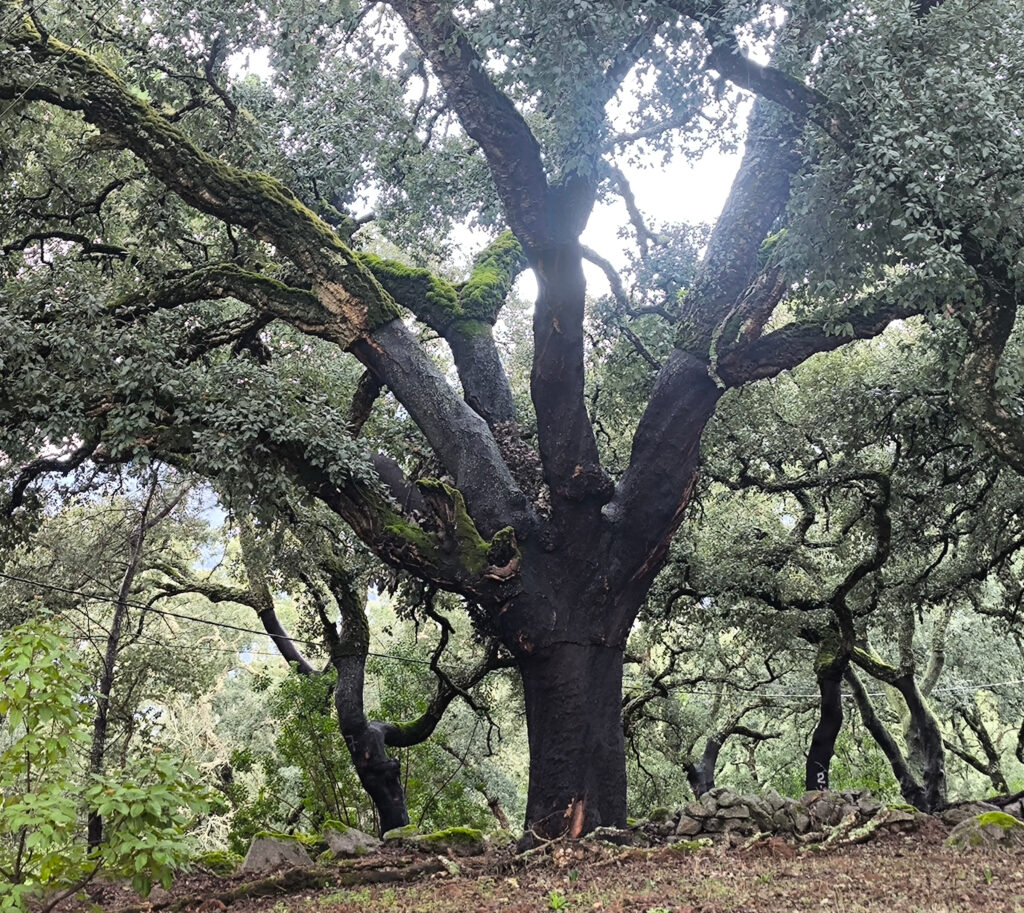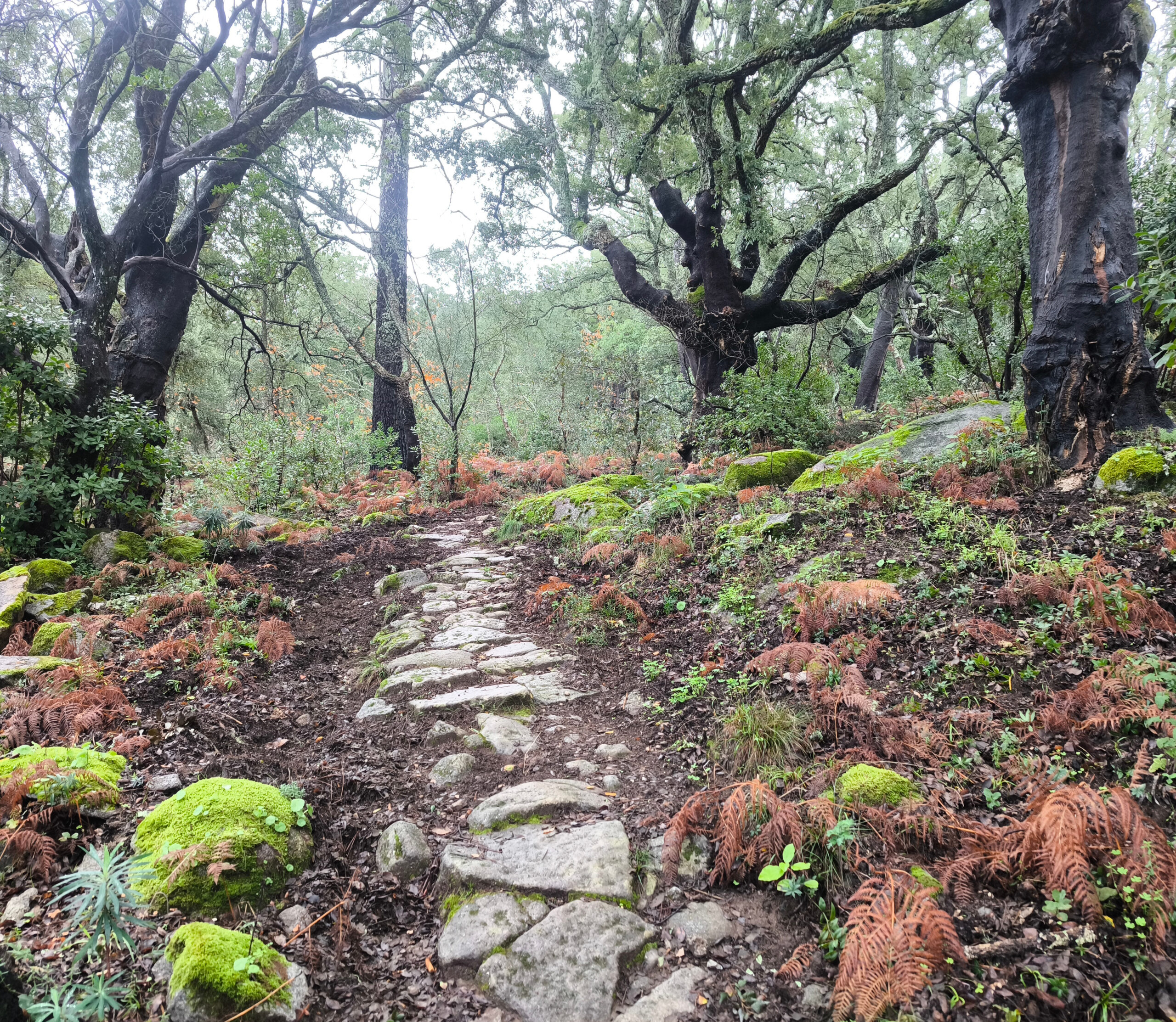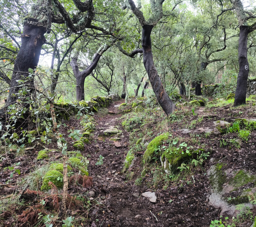(es) La subida no es especialmente larga, unos 3 km. Sin embargo, es muy interesante, ya que atraviesa un bosque lleno de viejos y muy fotogénicos ejemplares de alcornoques. No me canso de contemplarlos. Cada árbol tiene su propia personalidad. Al igual que con los viejos castaños que encontré en los bosques gallegos, me recuerdan a los Ents de El Señor de los Anillos. Me parece tan obvio que, como guardianes del bosque y supervivientes, conservan experiencias valiosas para la comunidad forestal.