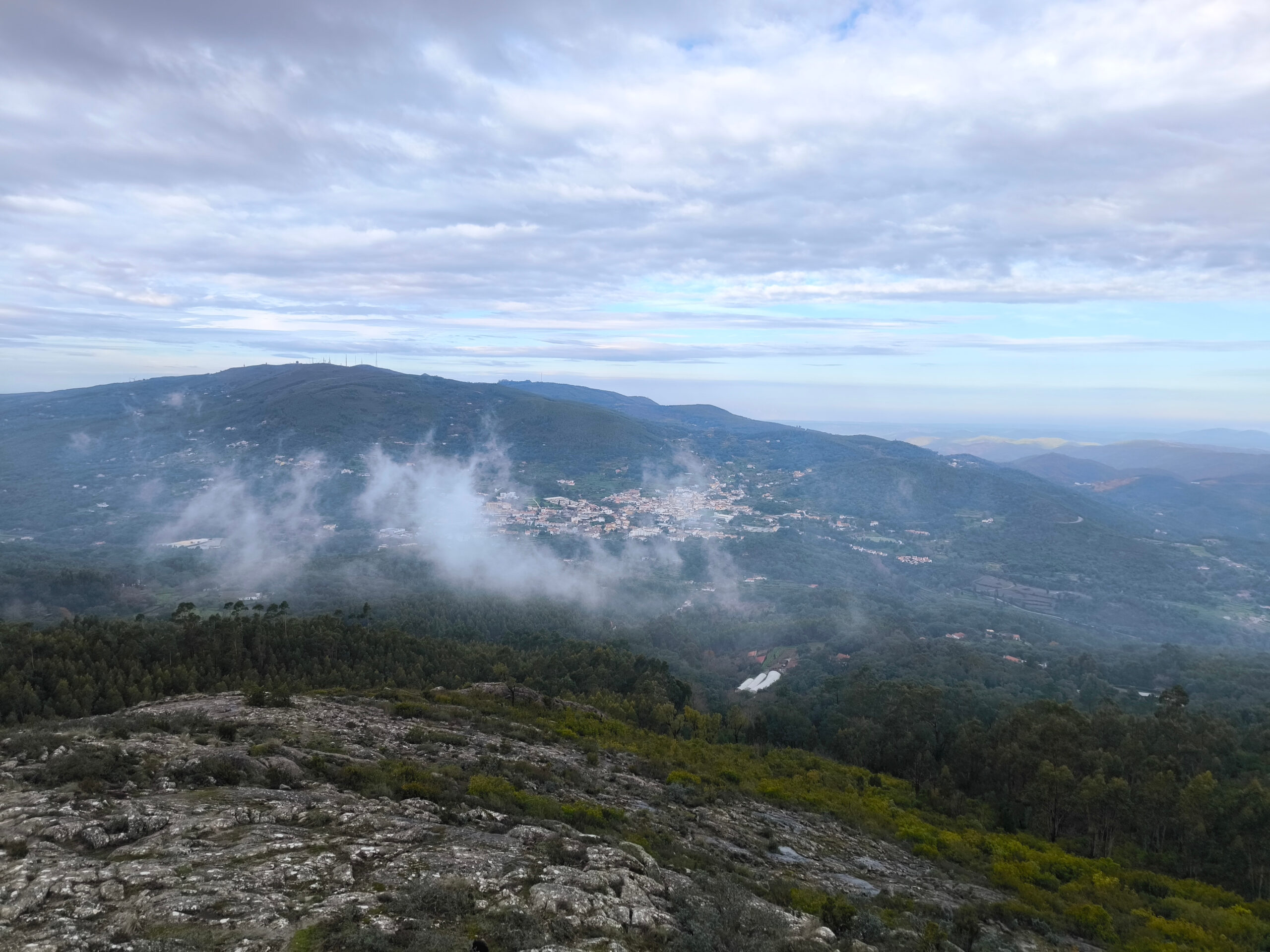 (es) Toda la gente me habia hablado maravillas de las vistas que se tienen desde la Picota. Y no exageraron. Incluso en un día como el que nos tocó se abre el paisaje hacia la costa, sobre la sierra y, por supuesto se puede ver el pueblo de Monchique como „se acomoda“ en la ladera del monte.