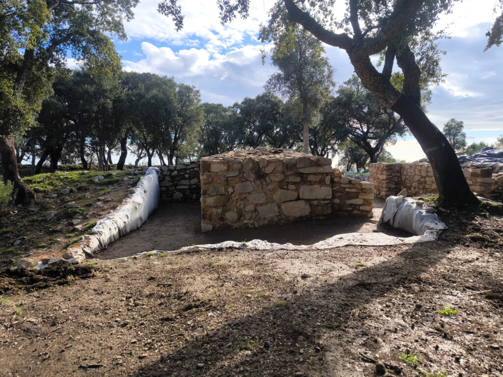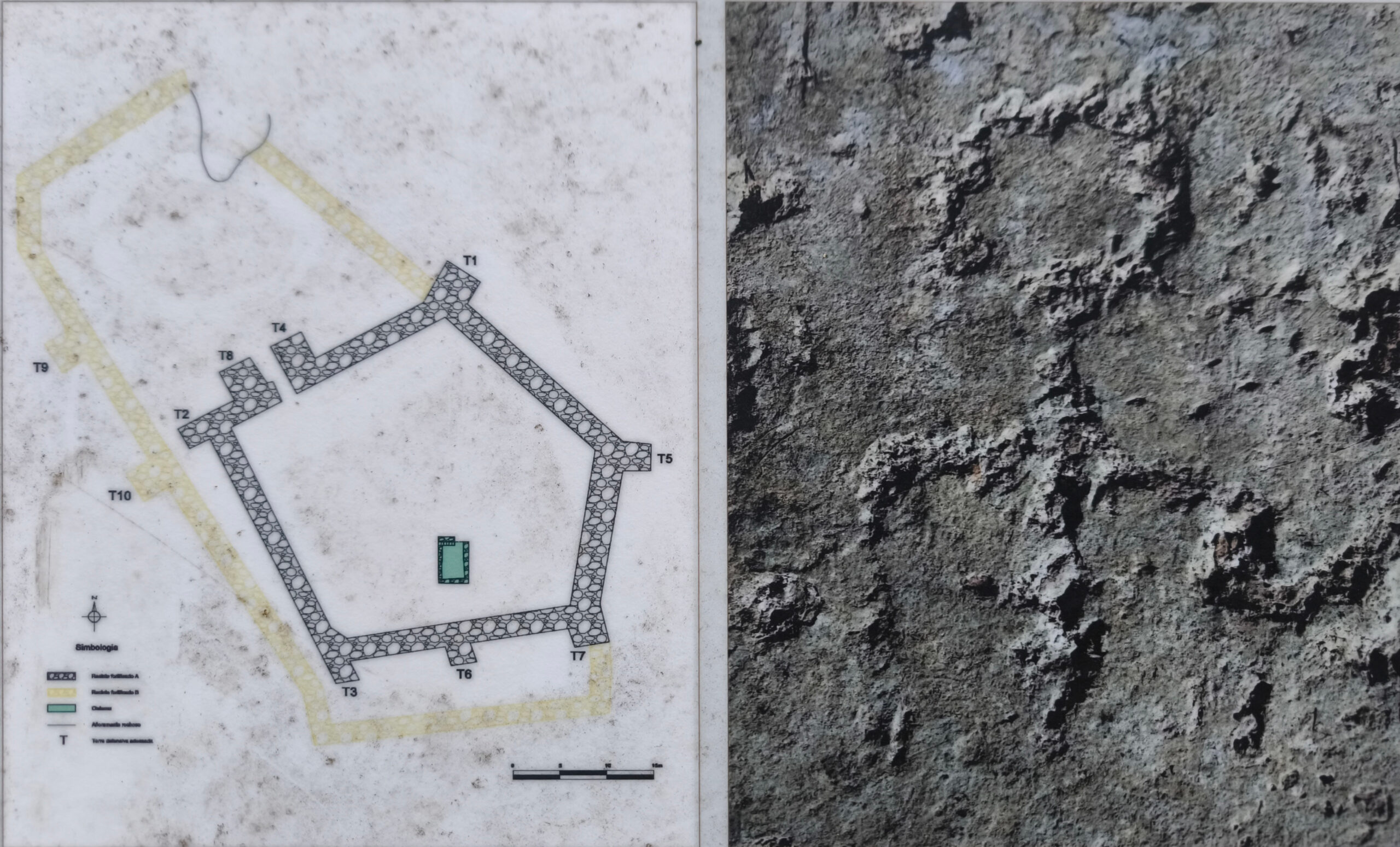 (de) Neben den Ruinen der islamischen Festung, die den Hügel krönen, gibt es noch eine dritte Umfassungsmauer, die die beiden vorgenannten befestigten Anlagen umschließt. Mit einer Dicke von ca. 2,90 m umschließt die dritte Einfriedung den gesamten Hügel und passt sich der Topografie des Geländes an, indem sie ein langgestrecktes, in Nord-Süd-Richtung ausgerichtetes Gelände mit einer Gesamtfläche zwischen 9 und 9,5 ha abgrenzt. Der westliche Teil dieser Einfriedung ist besser erhalten, und in einigen Bereichen hat die Mauer noch eine Höhe von etwa einem Meter über dem Boden. Der wahrscheinliche Eingang zu dieser riesigen, befestigten Anlage befindet sich im südwestlichen Teil und scheint durch Wehrtürme geschützt zu sein. Die Chronologie des Baus dieser dritten Anlage ist noch nicht klar, aber die Tatsache, dass es im nordwestlichen Bereich einen Mauerabschnitt mit einer zum opus spicatum (auch als „Fischgrät“ bekannt) tendierenden Anlage gibt, die der im Inneren der Zitadelle gefundenen ähnelt, lässt darauf schließen, dass sie im Frühmittelalter gebaut wurde, wahrscheinlich im selben Jahrhundert wie die Festung der Umayyadenzeit.