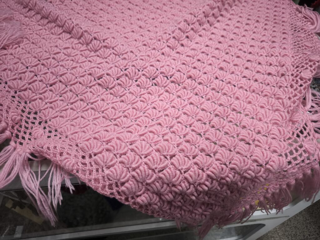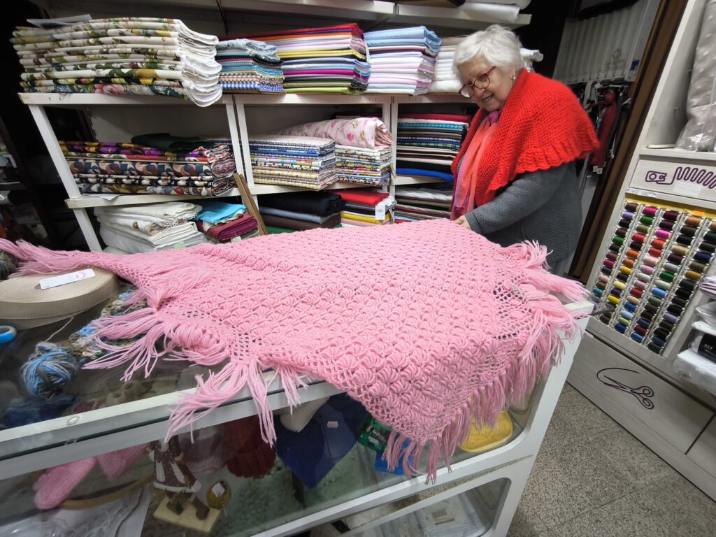 Ich kam ins Gespräch mit der Inhaberin/Verkäuferin (da bin ich mir nicht ganz sicher), so gut es eben geht mit meinen Kenntnissen der portugiesischen Sprache und ihren Kenntnissen der spanischen. Ich habe sie auf ihren schönen Schal angesprochen, den sie NATÜRLICH selbst gestrickt hat . Ich fragte sie, ob es im Portugiesischen ein besonderes Wort gibt, dachte dabei an die Mañanita, die „Bettjäckchen“ wie ich sie von den spanischen Frauen älterer Generationen kenne und sie ja auch meine Sieben Marien tragen. Ich hab es nicht geschafft, das herauszubekommen. Aber kurzentschlossen verschwand sie im hinteren Teil des Ladens und kam mit zwei weiteren Stücken zurück, die sie mir voller Stolz zeigen wollte: den Schal, an dem sie gerade arbeitet und einen, den sie vor über vierzig Jahren gehäkelt hat.