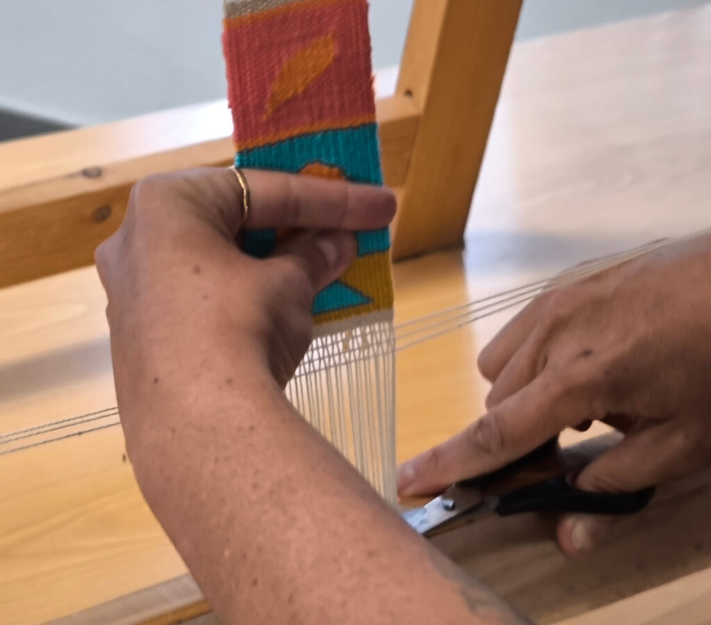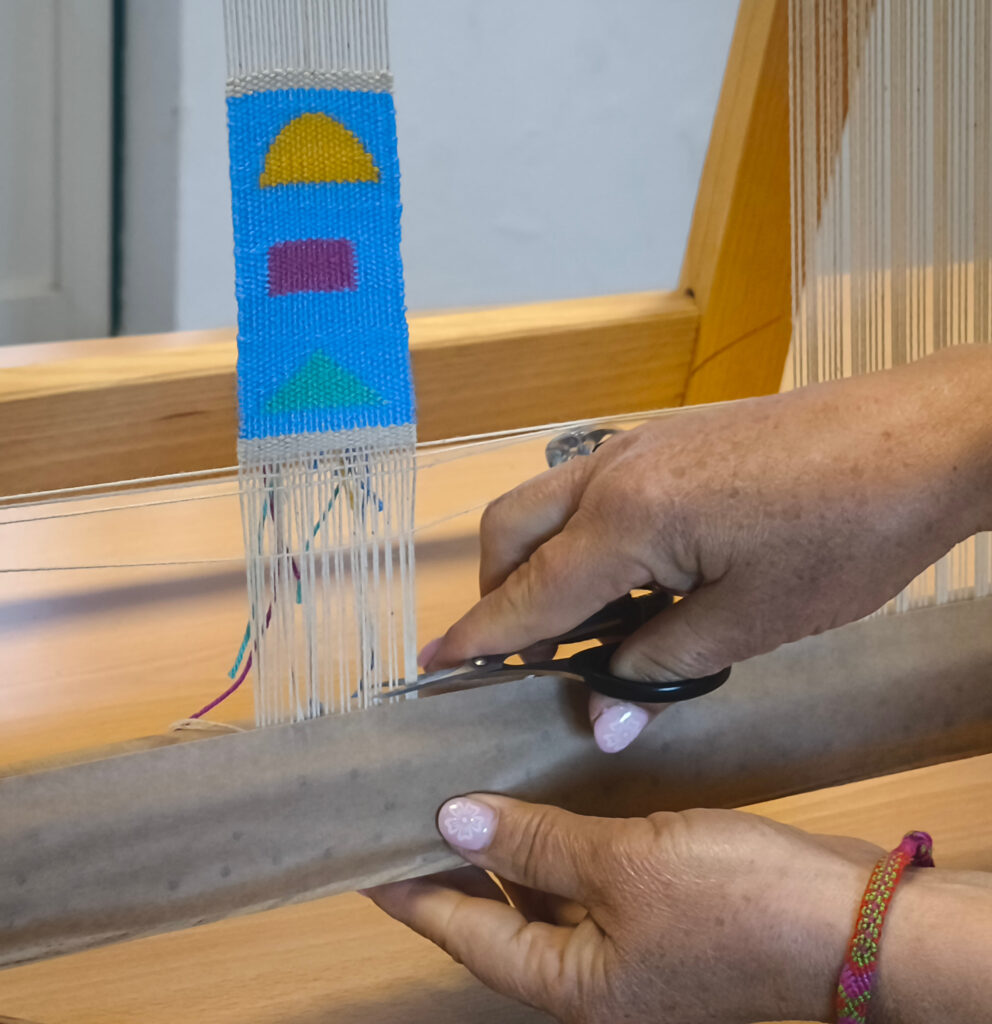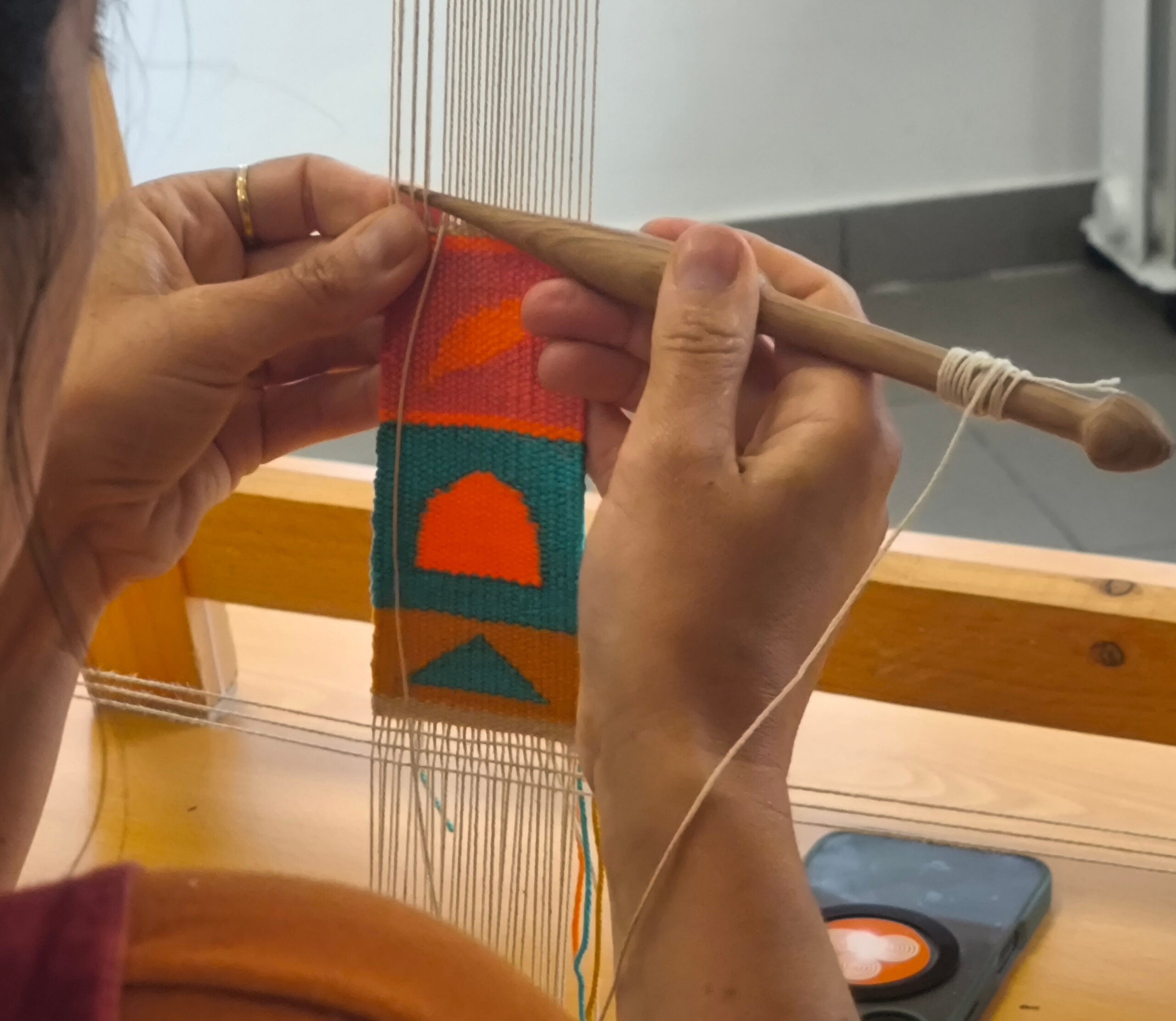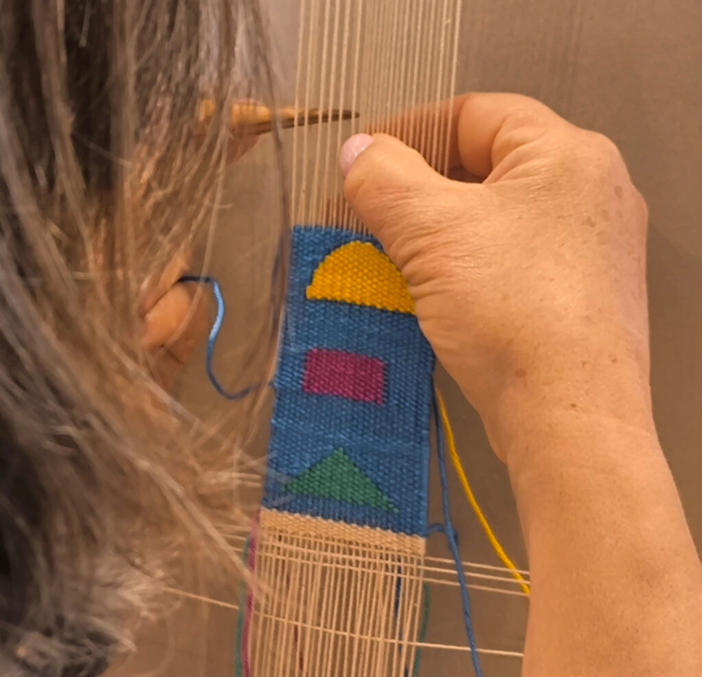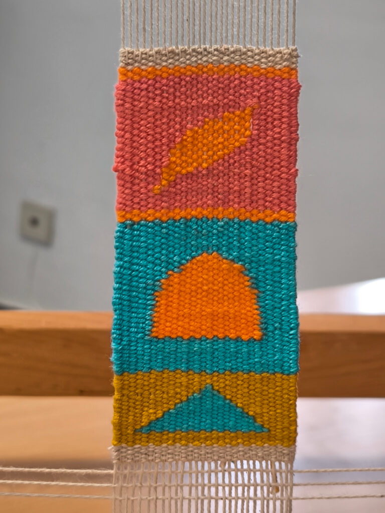 (de) Karfreitag. Acht Stunden haben sich Ana, Suzanne und Francisca,  genommen um mit mir gemeinsam in die Welt der Bildwirkerei einzutauchen. Wie immer hat es mir viel Spass gemacht, auch wenn die Sprache neuerlich eine Herausforderung zur Vermittlung dessen war, was mir über die Techniken hinaus so wichtig an der Bildwirkerei, am (textilen) Handwerk und der Kunst ist. Und auch der Hauch von Frustration, der sich manchmal bei mir einstellt, wenn ich mir bewusst mache, wie vieles in einen Tag eben nicht reinpasst, ist nicht immer leicht „einzuhegen“.