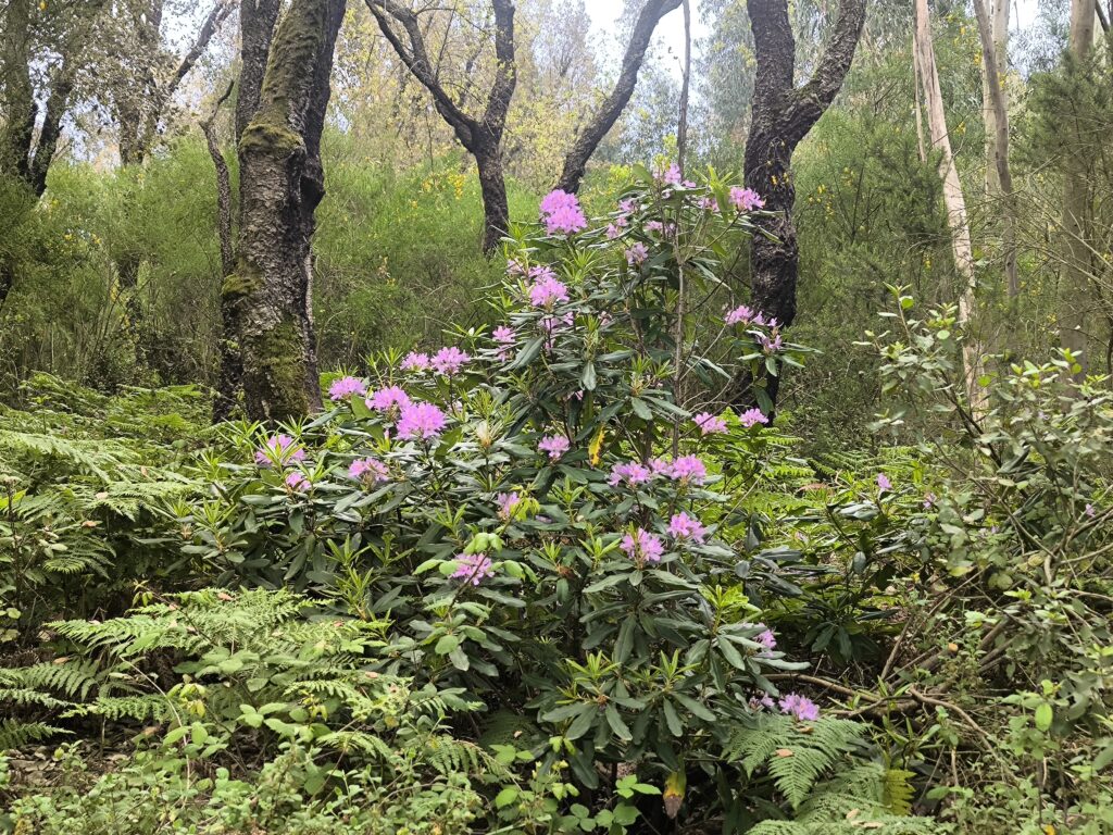 Ich hab mich riesig über den ersten Fingerhut gefreut, den ich gestern endteckt habe, und noch mehr über die Rosa-Albardeira, die hier nicht oft zu finden ist, wie auch der Rhododendron, der wild wachsende, nicht der aus den Kübeln, der mir am KUKUmobil Gesellschaft leistet. Der Rhododendron ist einer der Bewohner des Loorbeerwaldes. der kommt heute nur noch auf den Inselgruppen vor, die zu Makaronesien gehören, insbesondere auf den portugiesischen Inselgruppen der Azoren und Madeiras, auf den spanischen Kanarischen Inseln sowie in kleinen, seltenen Enklaven an der Küste Mauretaniens …… und, ganz klein, aber fein, in Monchique, kurz vor dem Gipfel des Foia. Der Rhododendron auf meinem Foto ist aus der Reihe getanzt. Er wächst am Westhang des Picota.